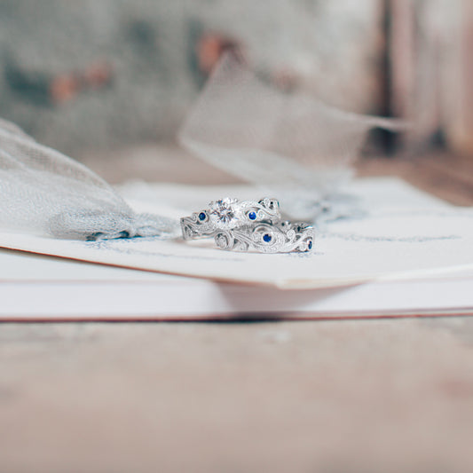 Blue Sapphire Baguette Engraved Diamond Wedding Band
