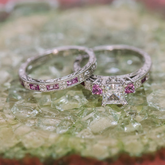 Vendor:Design No. SS6685R-B1Regular price $4,370Regular priceUnit price perSale price $4,370Pink Sapphire Baguette Engraved Diamond Wedding Band