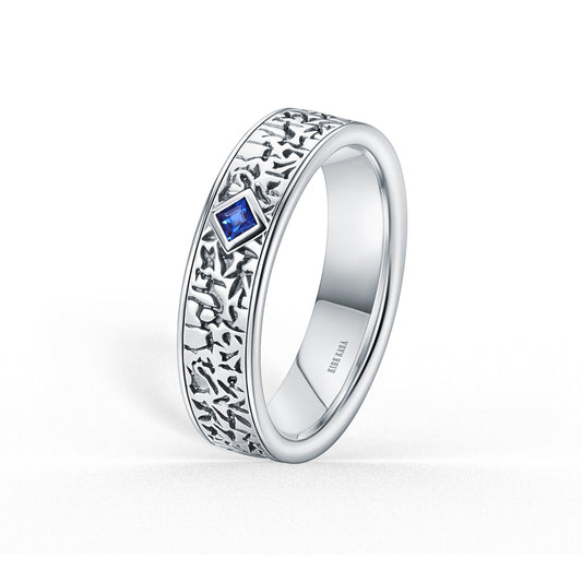Thin Bezel Blue Sapphire Nugget Engraved Wedding Band, 5mm