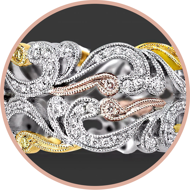 We use the highest quality casting process to ensure no porosity in any of our metals. Our gold and platinum alloys use our own metals for the best possible durability, longevity, and material for our fine milgrain, filigree and hand engraved work. This results in the most beautiful rose, yellow and near-hypoallergenic white gold.