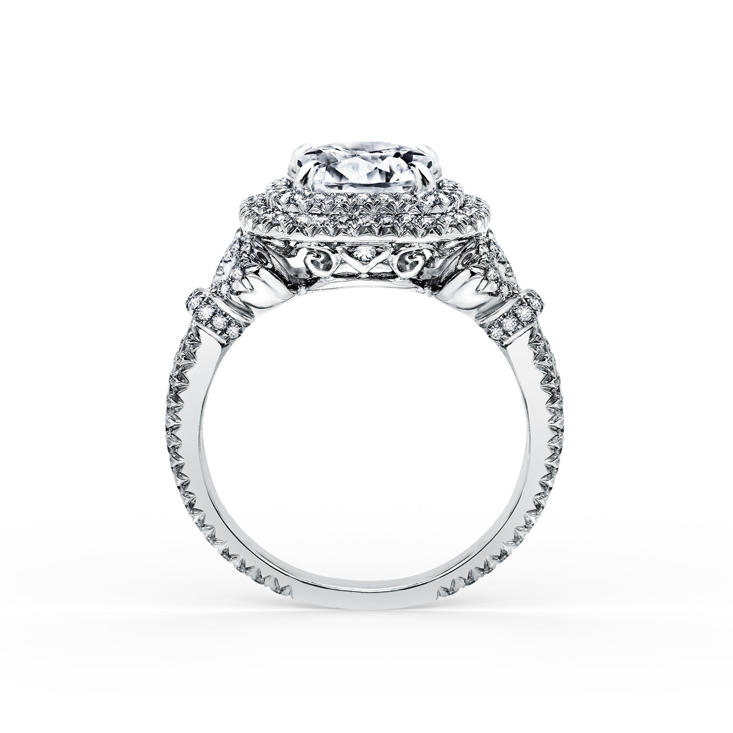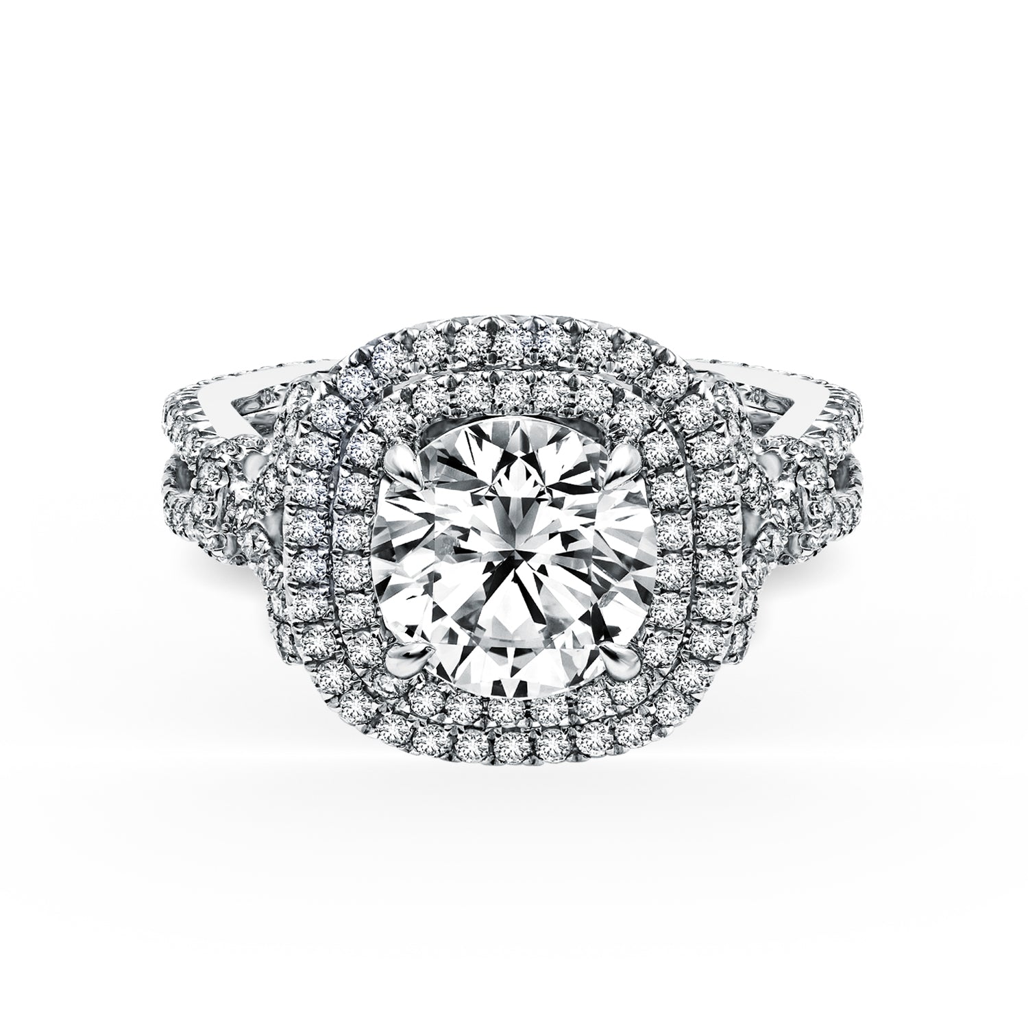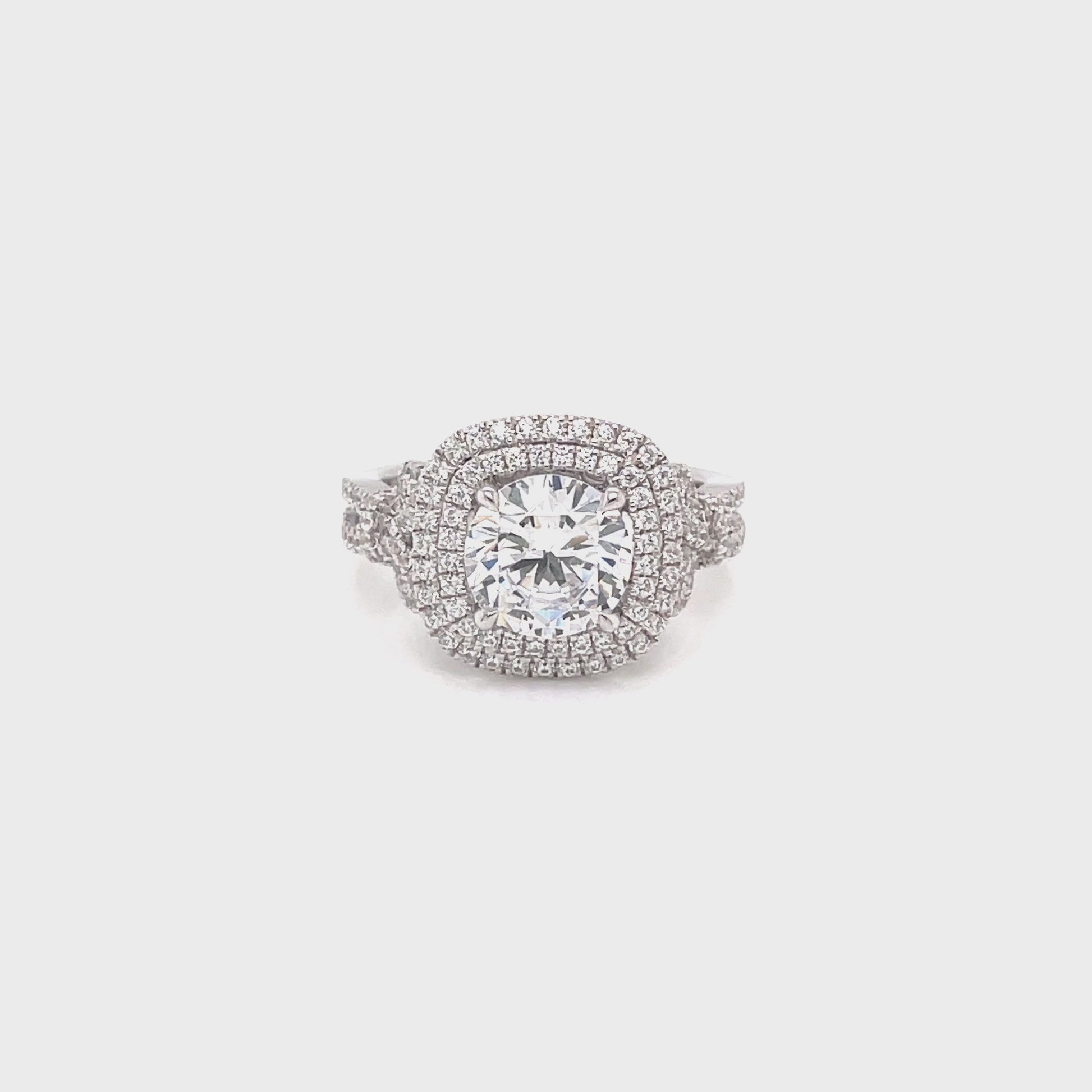 Award winning design. This romantic design is a halo engagement ring from the Pirouetta collection. It features 3/4 ctw of diamonds. The signature handcrafted details include signature filigree and peek-a-boo diamonds. Both lab grown and natural diamonds are available for this setting. Ring as shown fits a 2.00 carat round cut stone. All center stone sizes and shapes are possible.