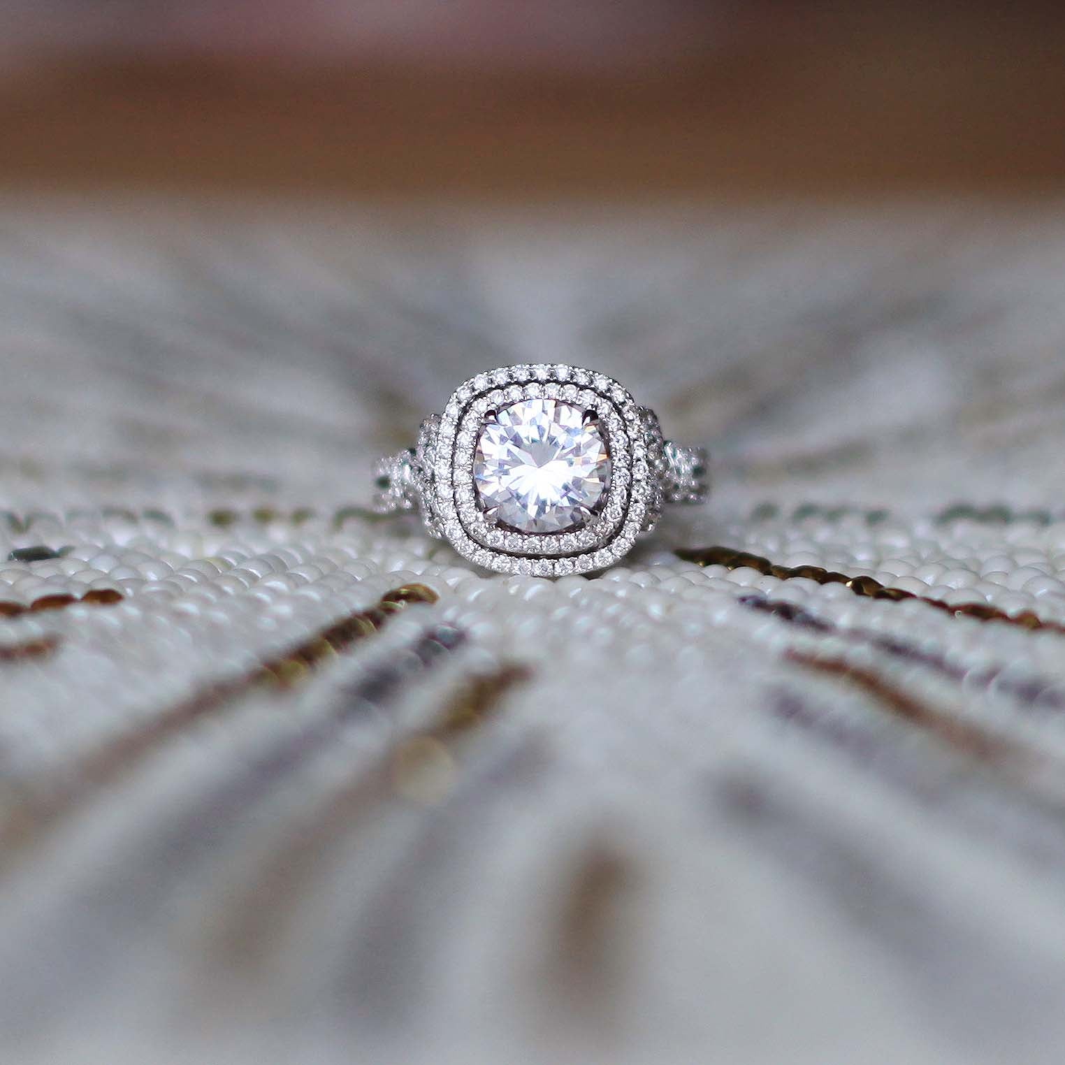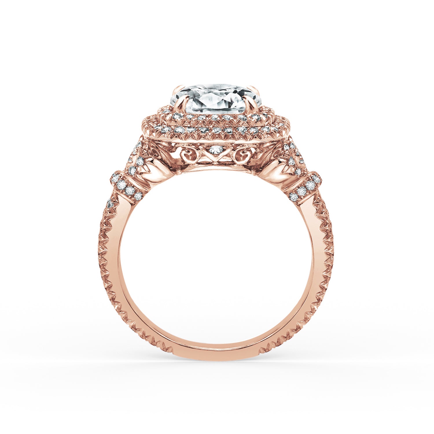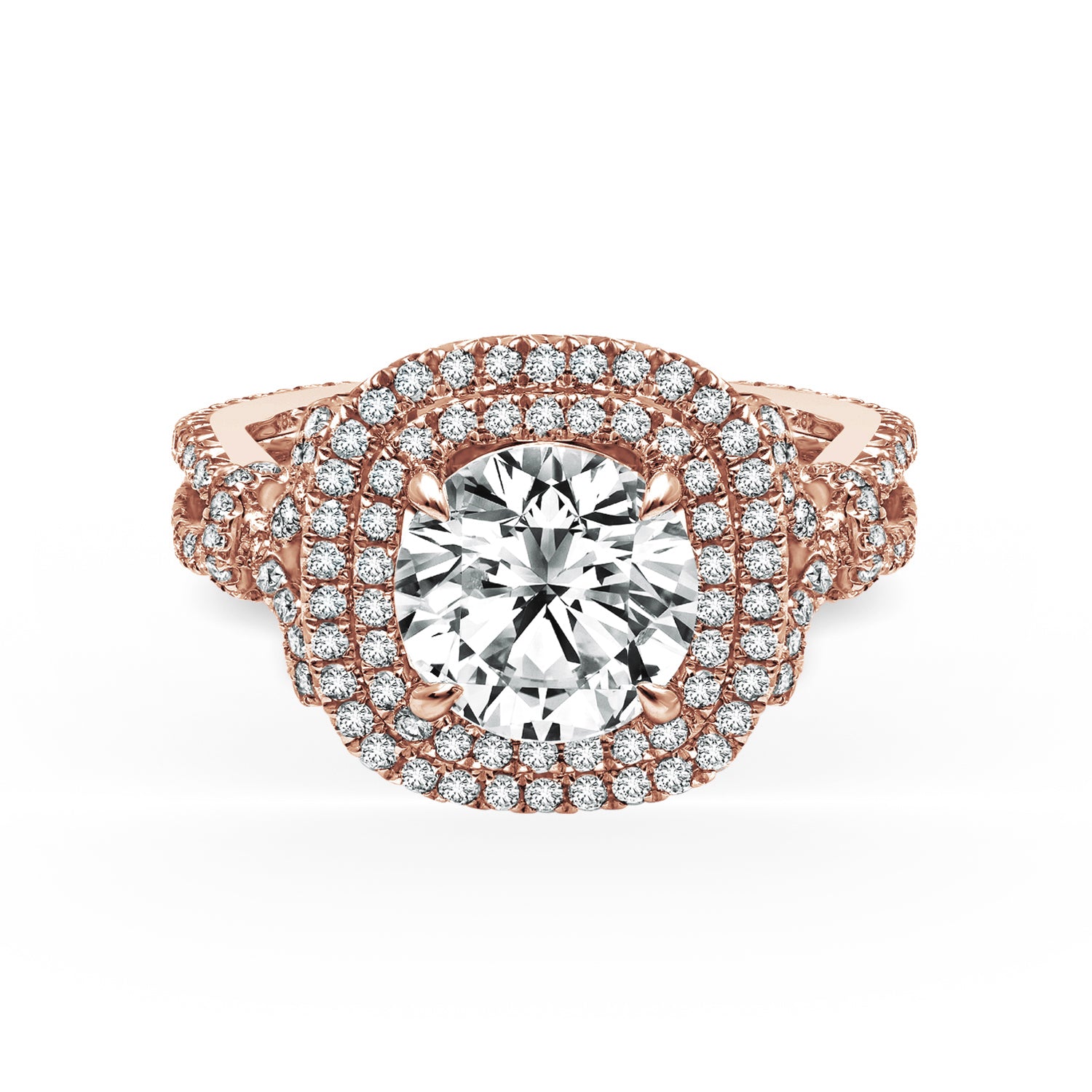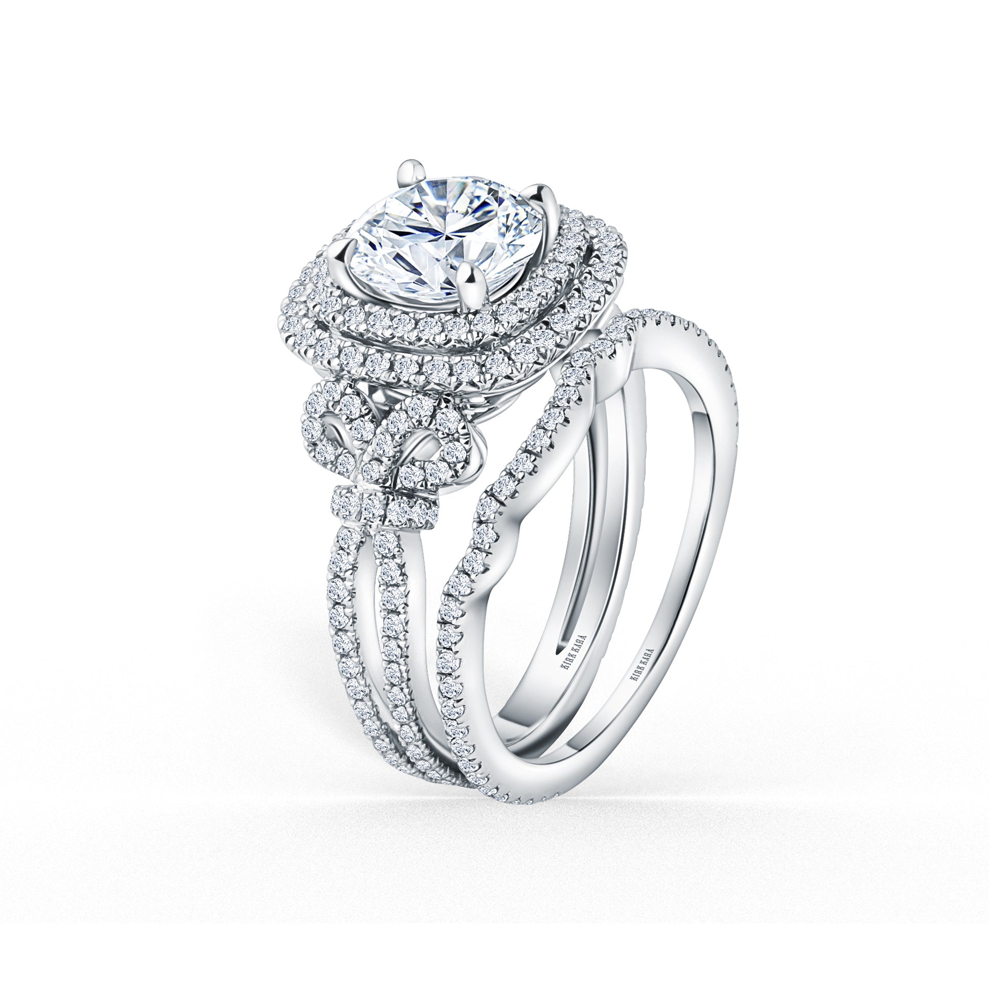 Award winning design. This romantic design is a halo engagement ring from the Pirouetta collection. It features 3/4 ctw of diamonds. The signature handcrafted details include signature filigree and peek-a-boo diamonds. Both lab grown and natural diamonds are available for this setting. Ring as shown fits a 2.00 carat round cut stone. All center stone sizes and shapes are possible.