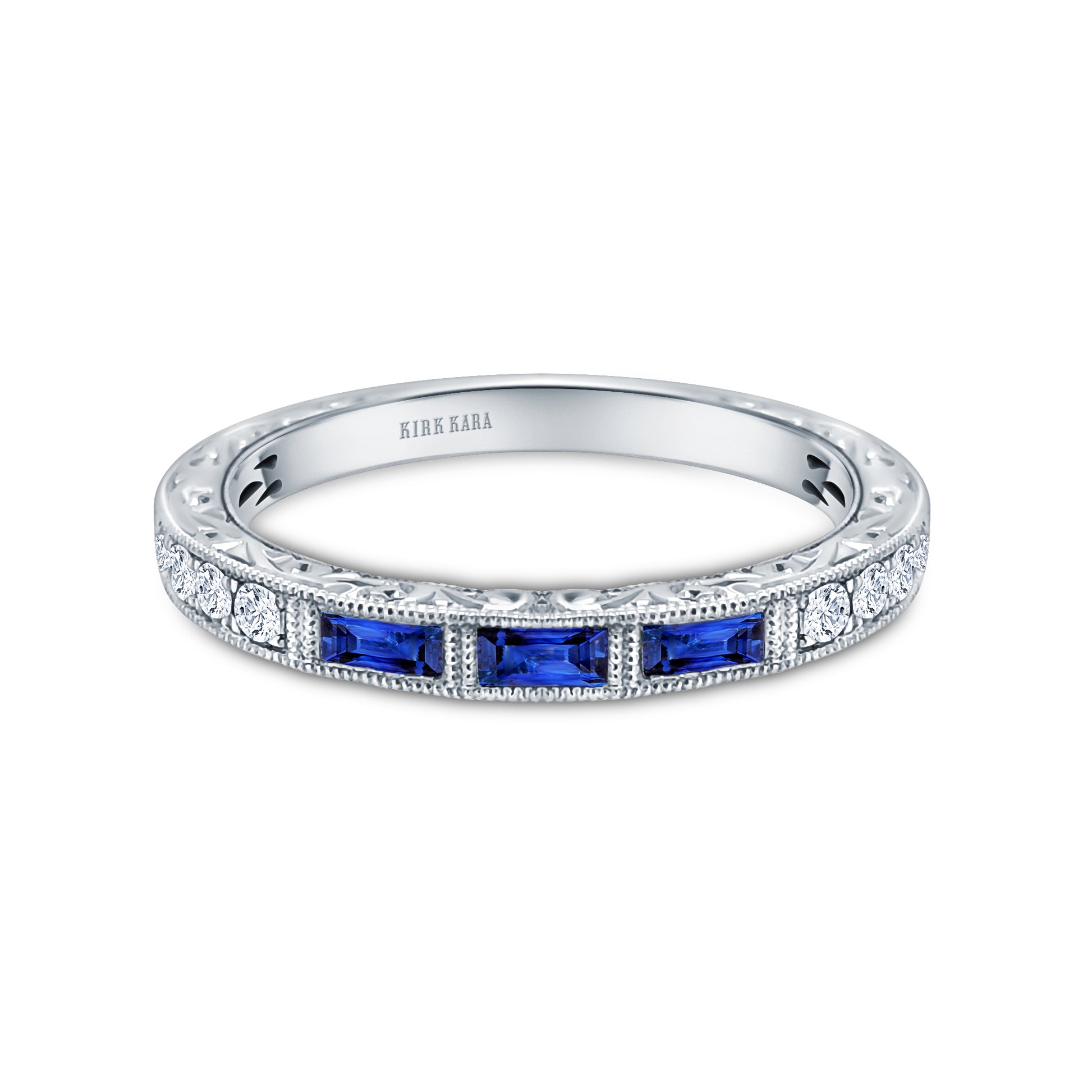 Baguette Engraved Blue Sapphire Diamond Wedding Band
