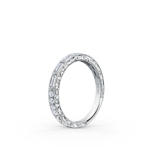 This deco inspired classic is an artistic design from the Charlotte collection. It features 3/8 ctw of diamonds. The signature handcrafted details include scroll hand engravings and milgrain edging. Both lab grown and natural diamonds are available for this band.