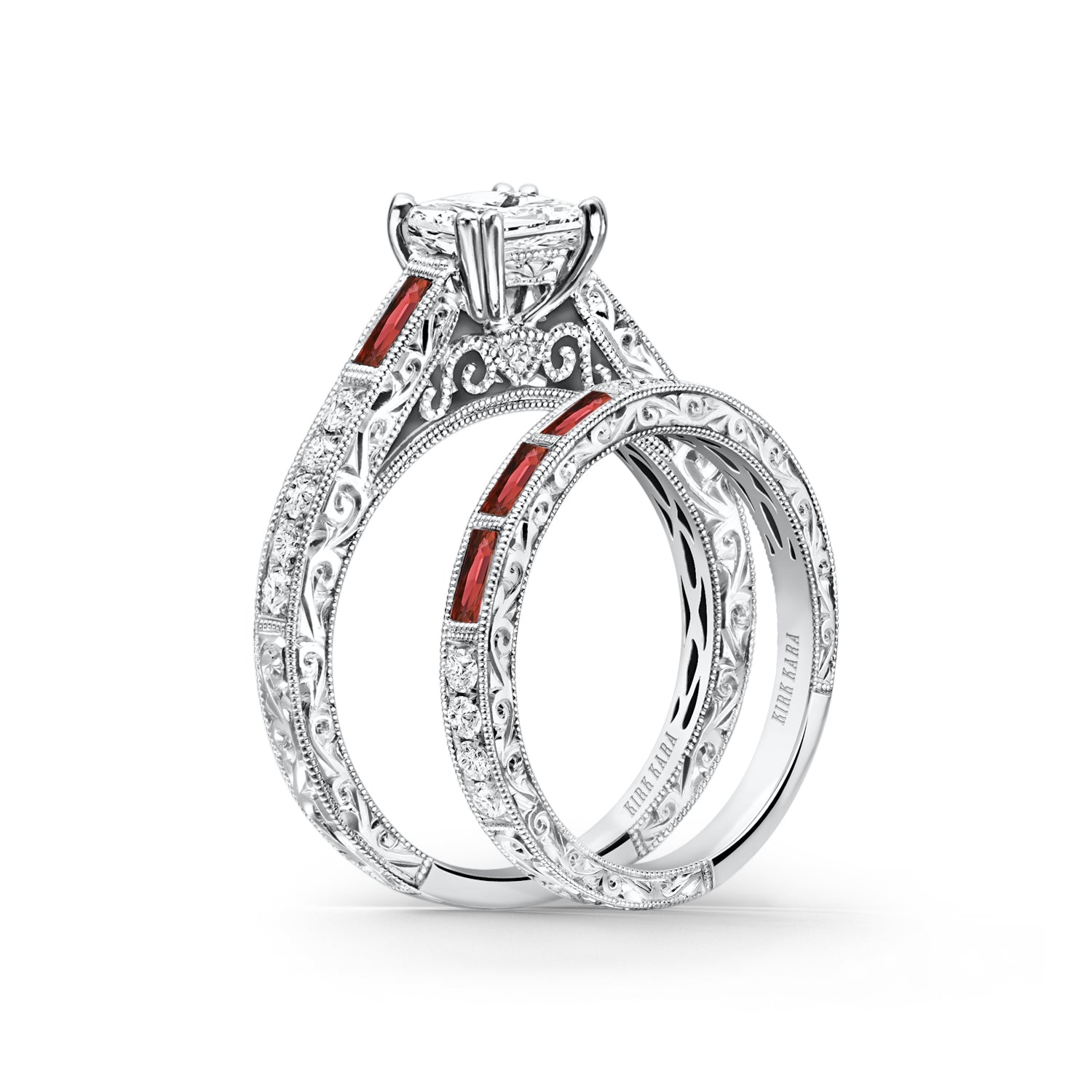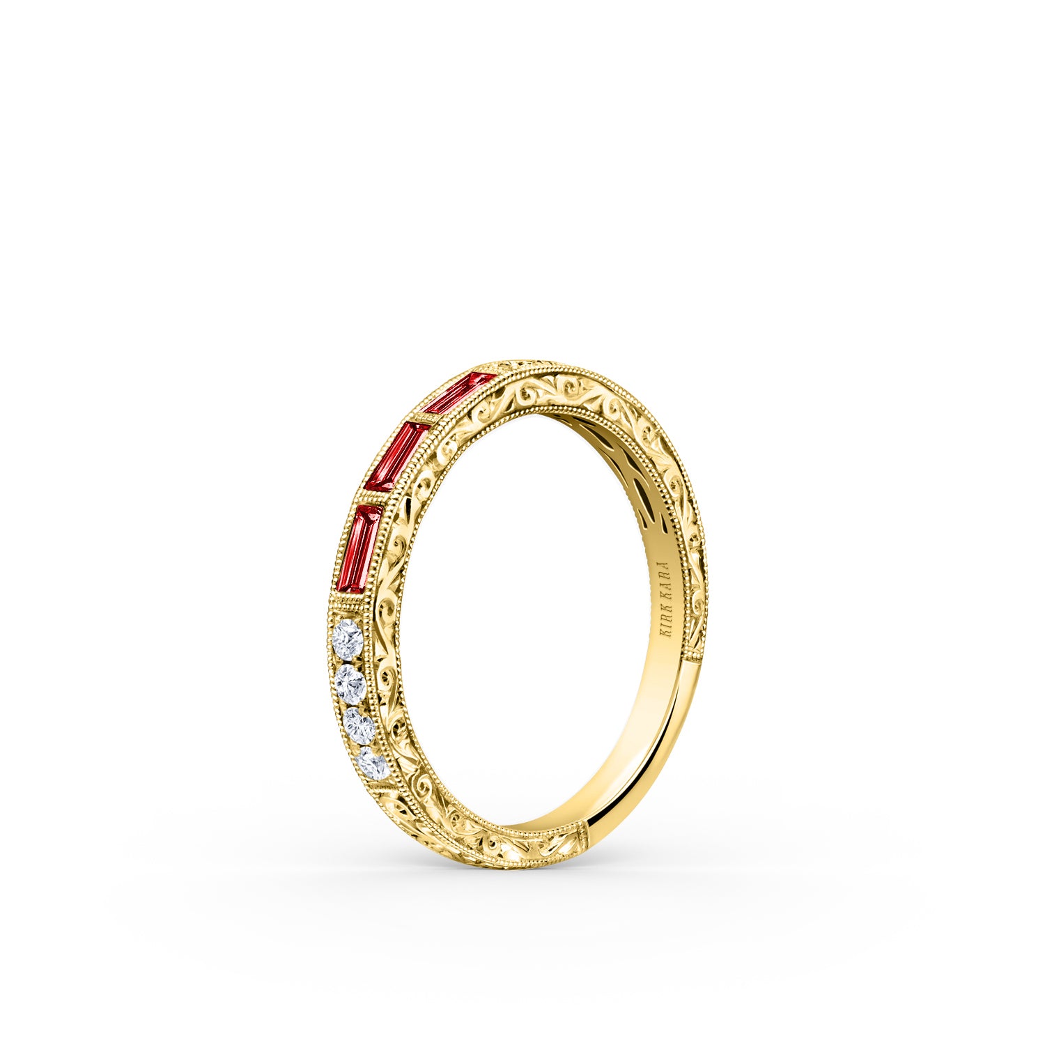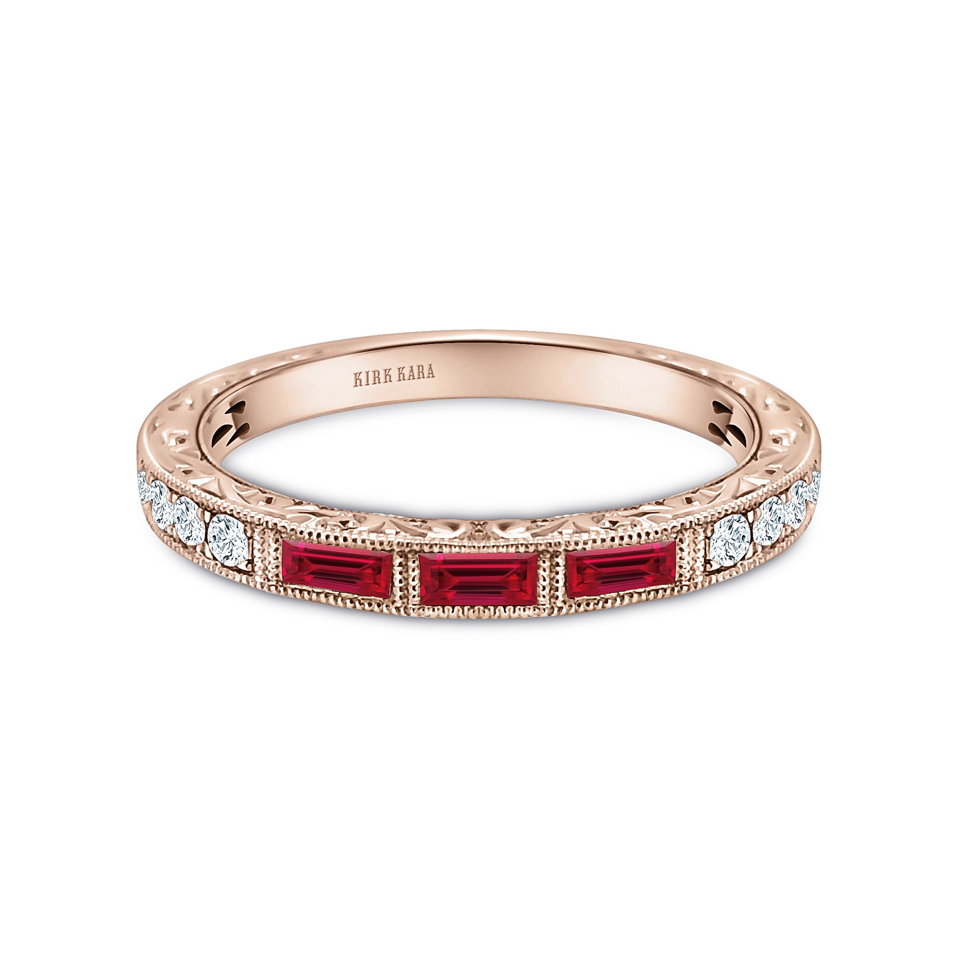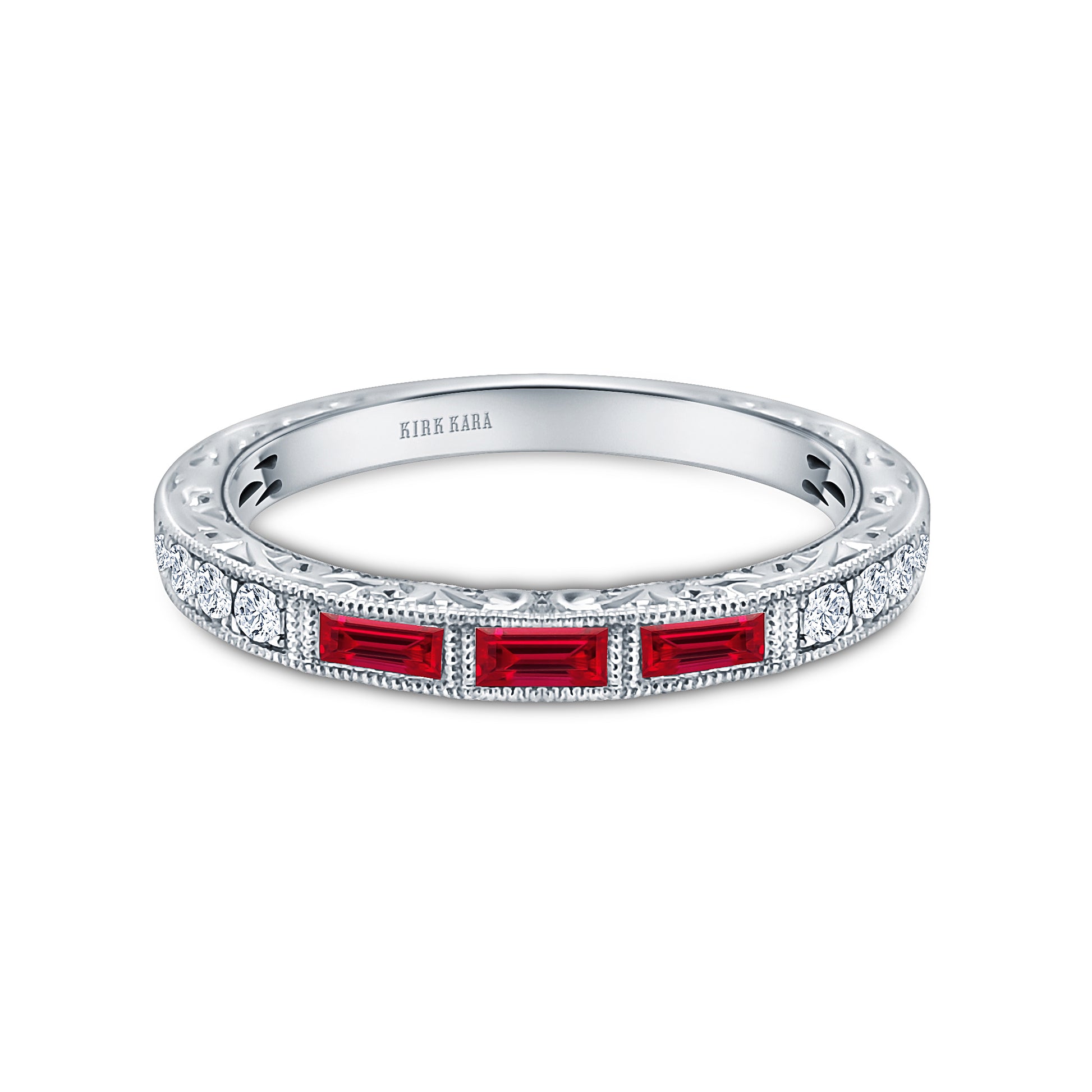 This deco inspired classic is an artistic design from the Charlotte collection. It features natural ruby baguettes and 1/6 ctw of diamonds. The signature handcrafted details include scroll hand engravings and milgrain edging.