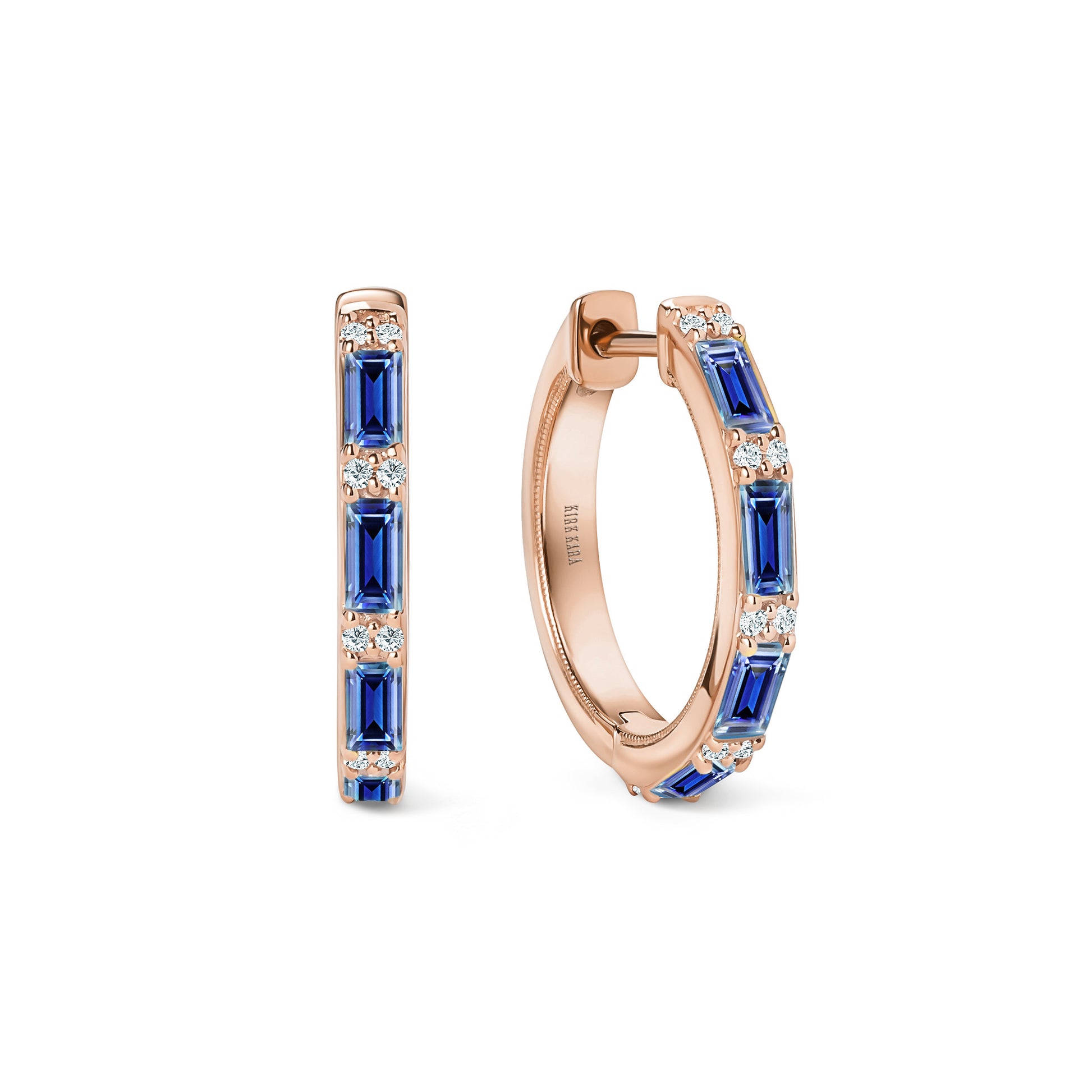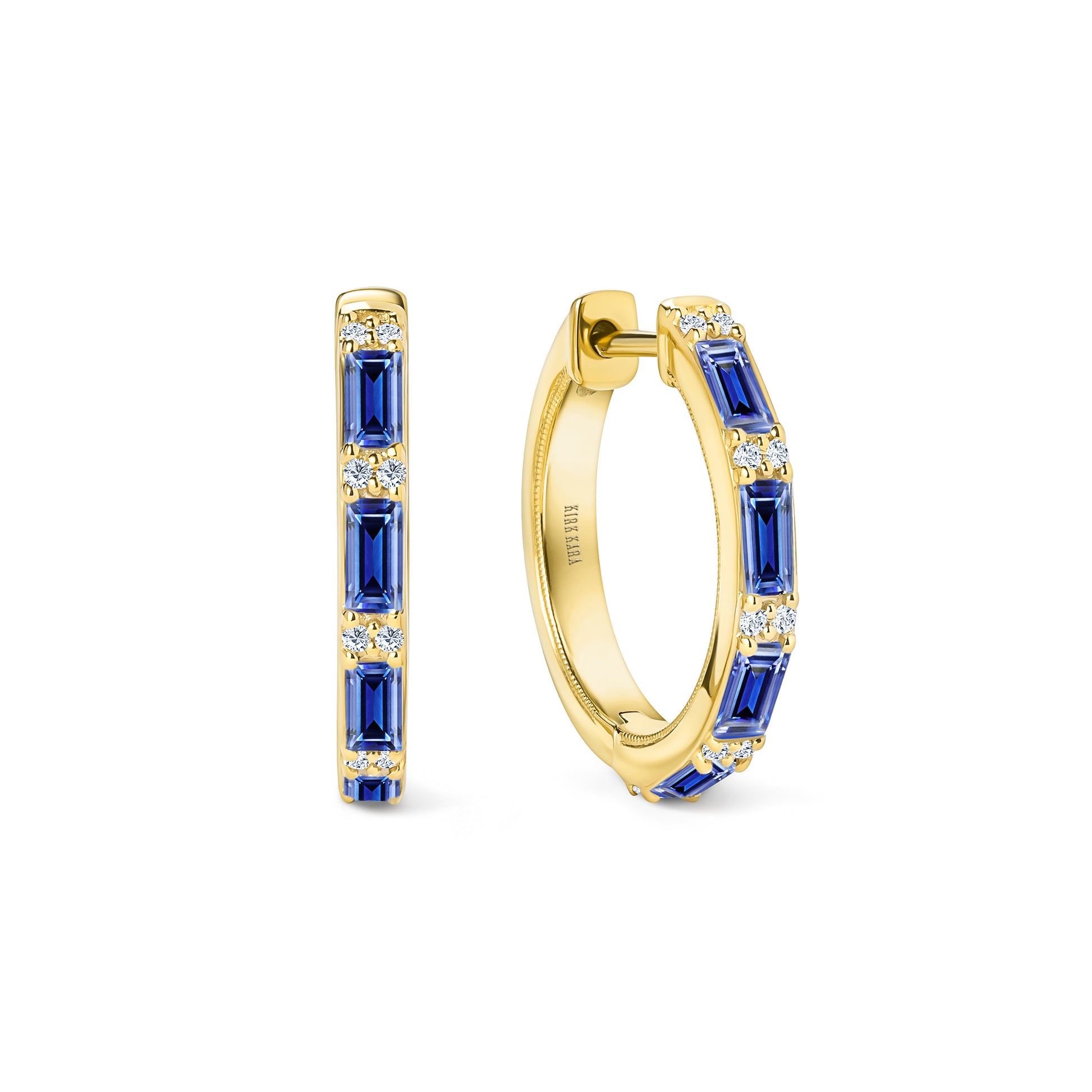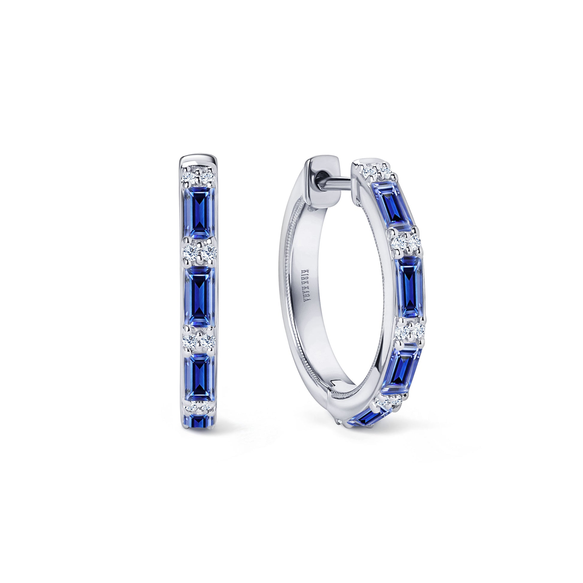 These deco inspired classic hoop earrings are an artistic design from the Charlotte collection. They feature natural blue sapphire baguettes and 1/15 ctw of diamonds. The signature handcrafted details include milgrain edging.