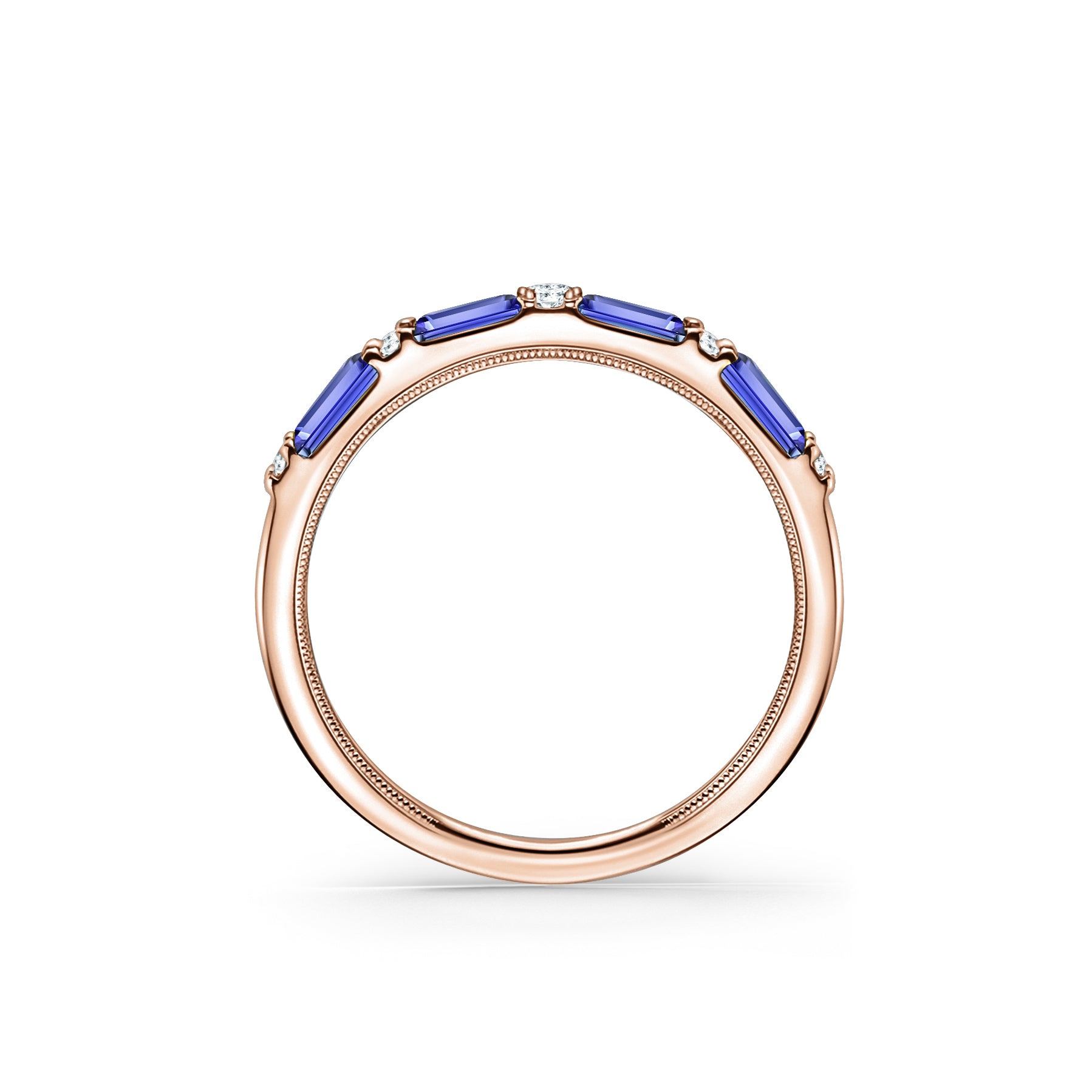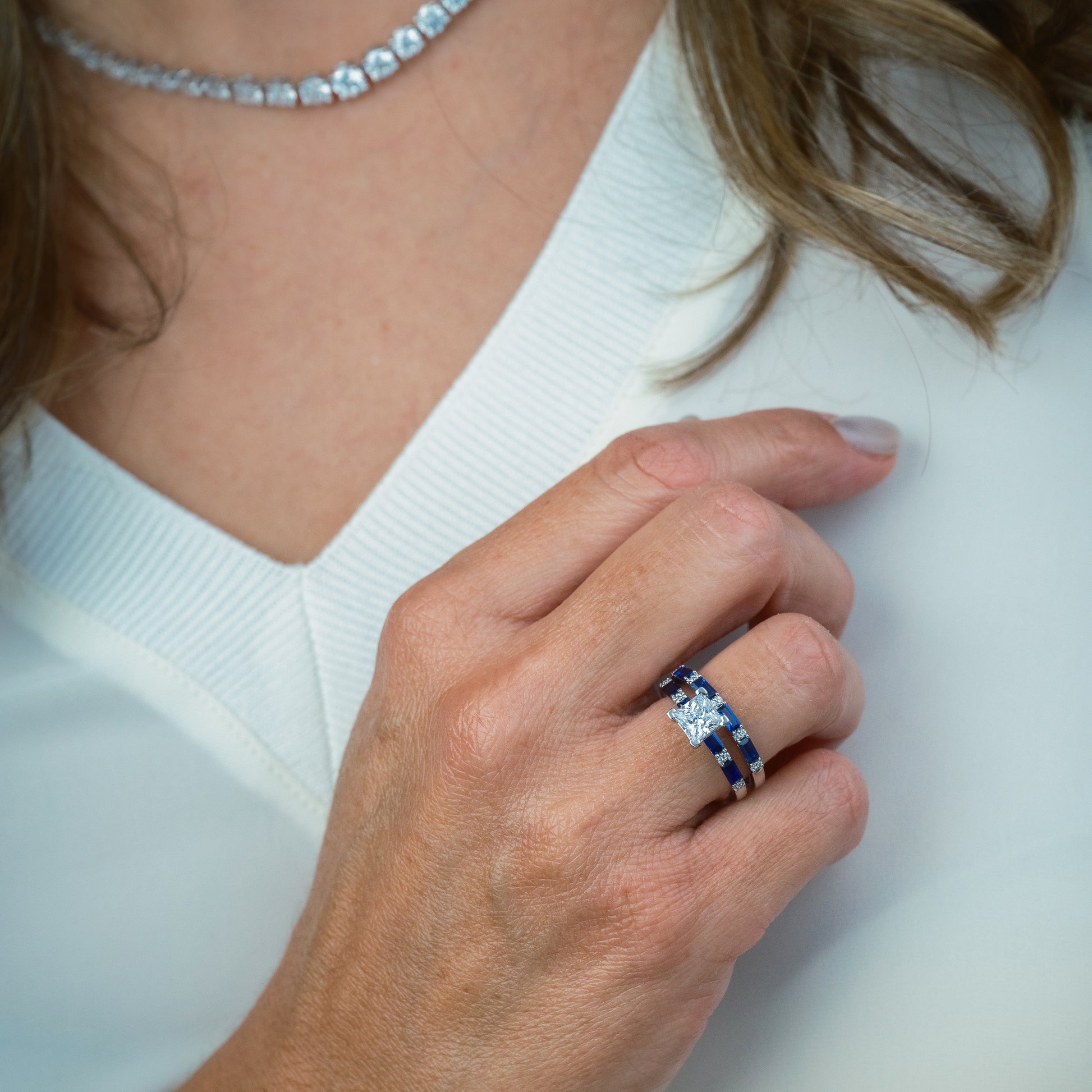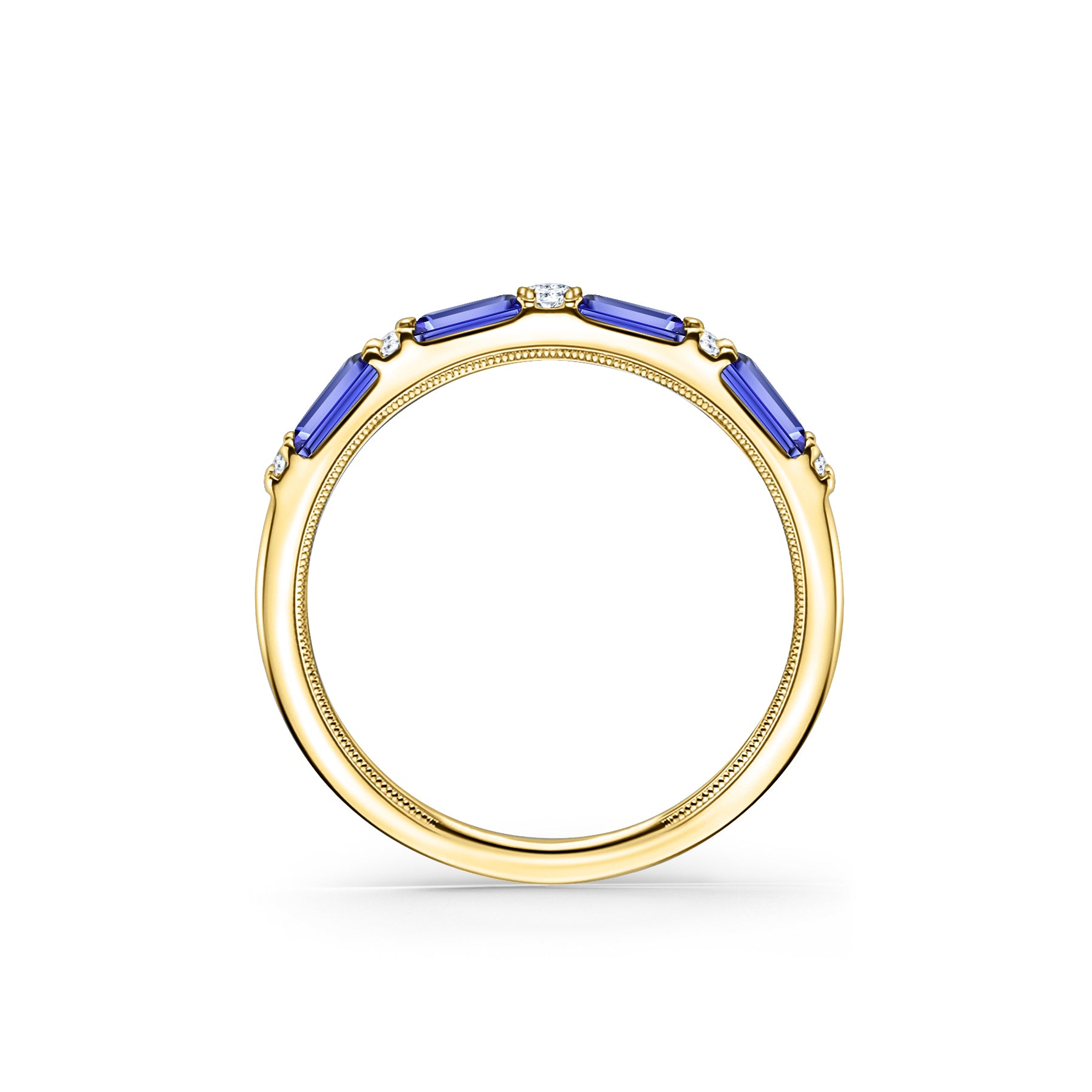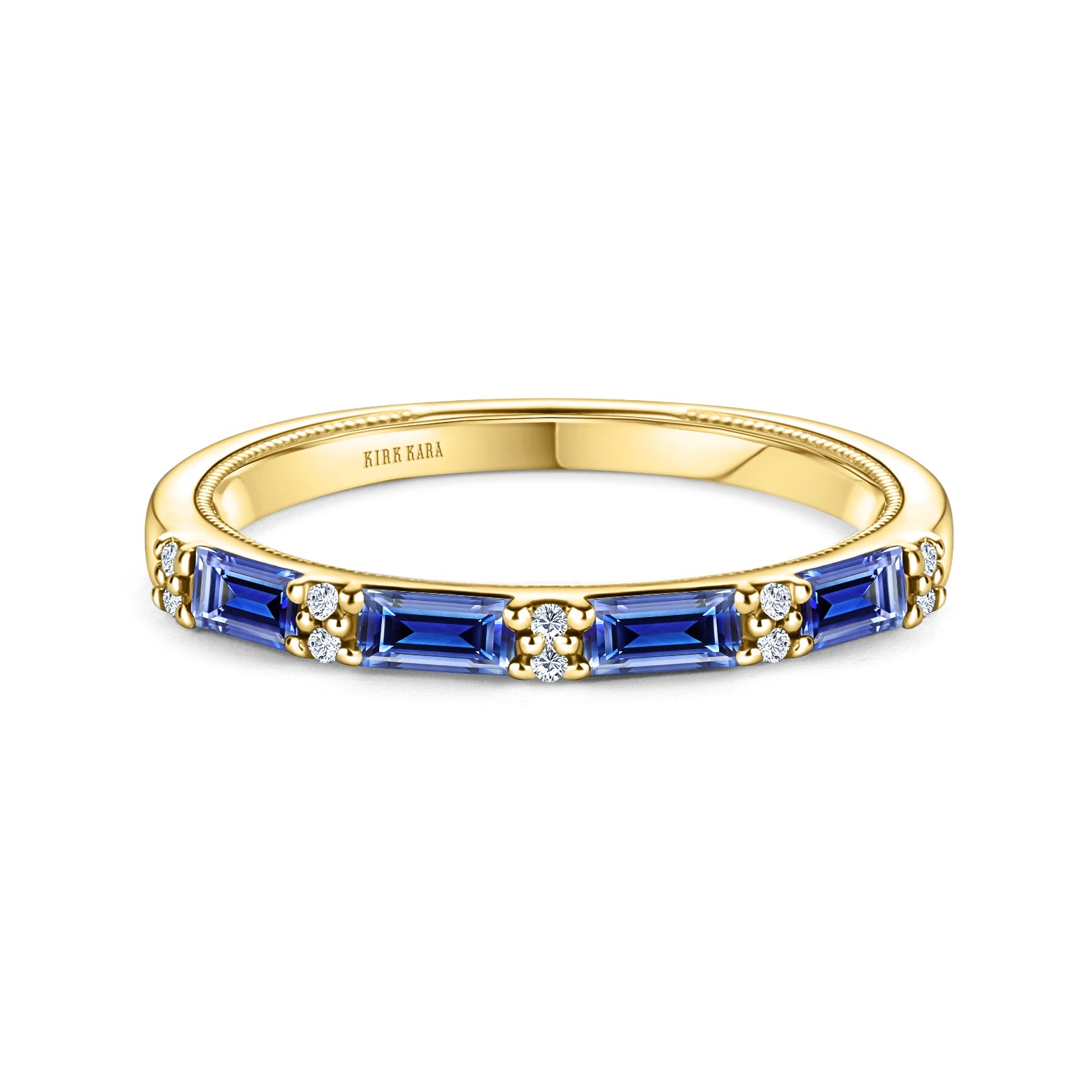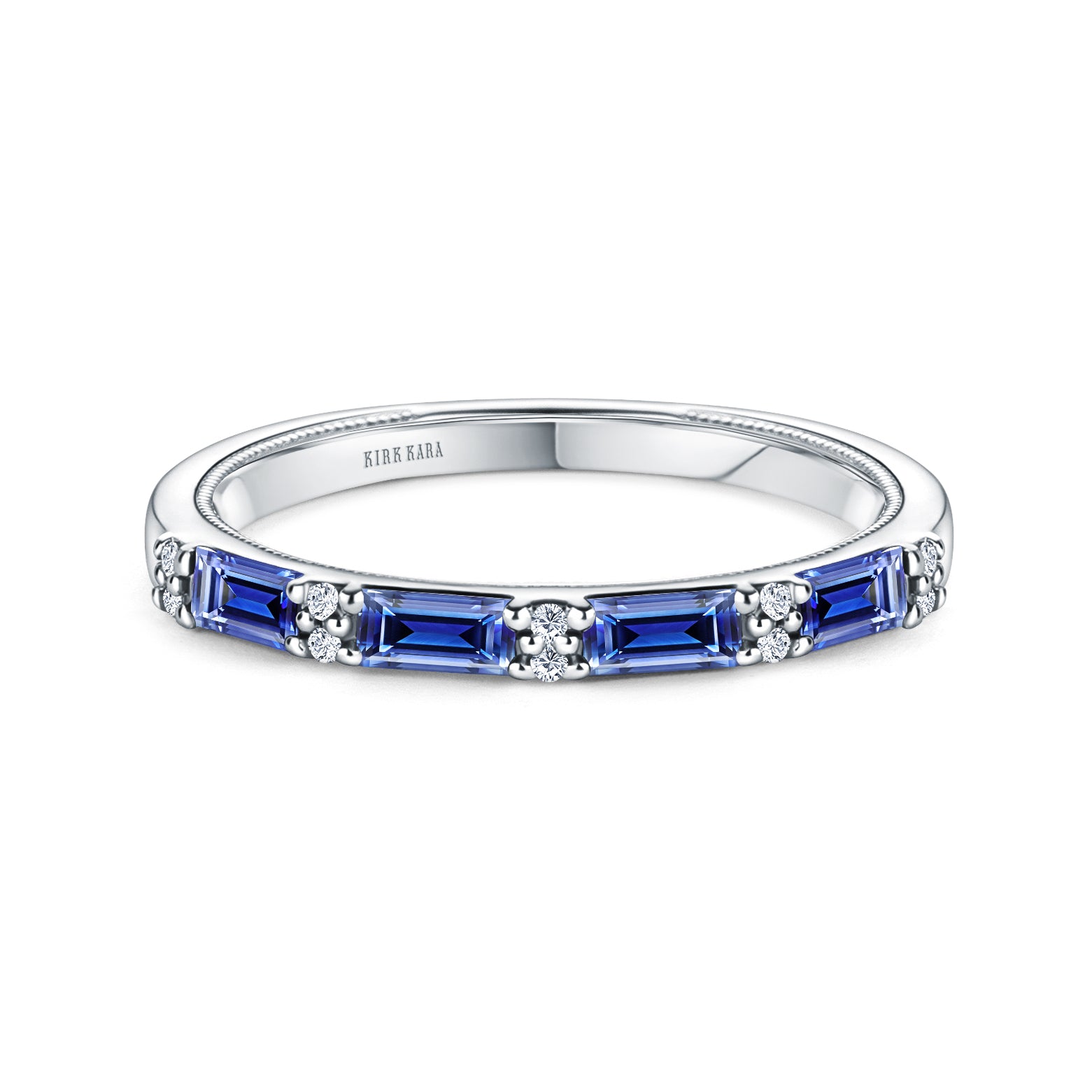 This deco inspired classic is an artistic design from the Charlotte collection. It features 1/20 ctw of diamonds and natural blue sapphire baguettes. The signature handcrafted details include milgrain edging.