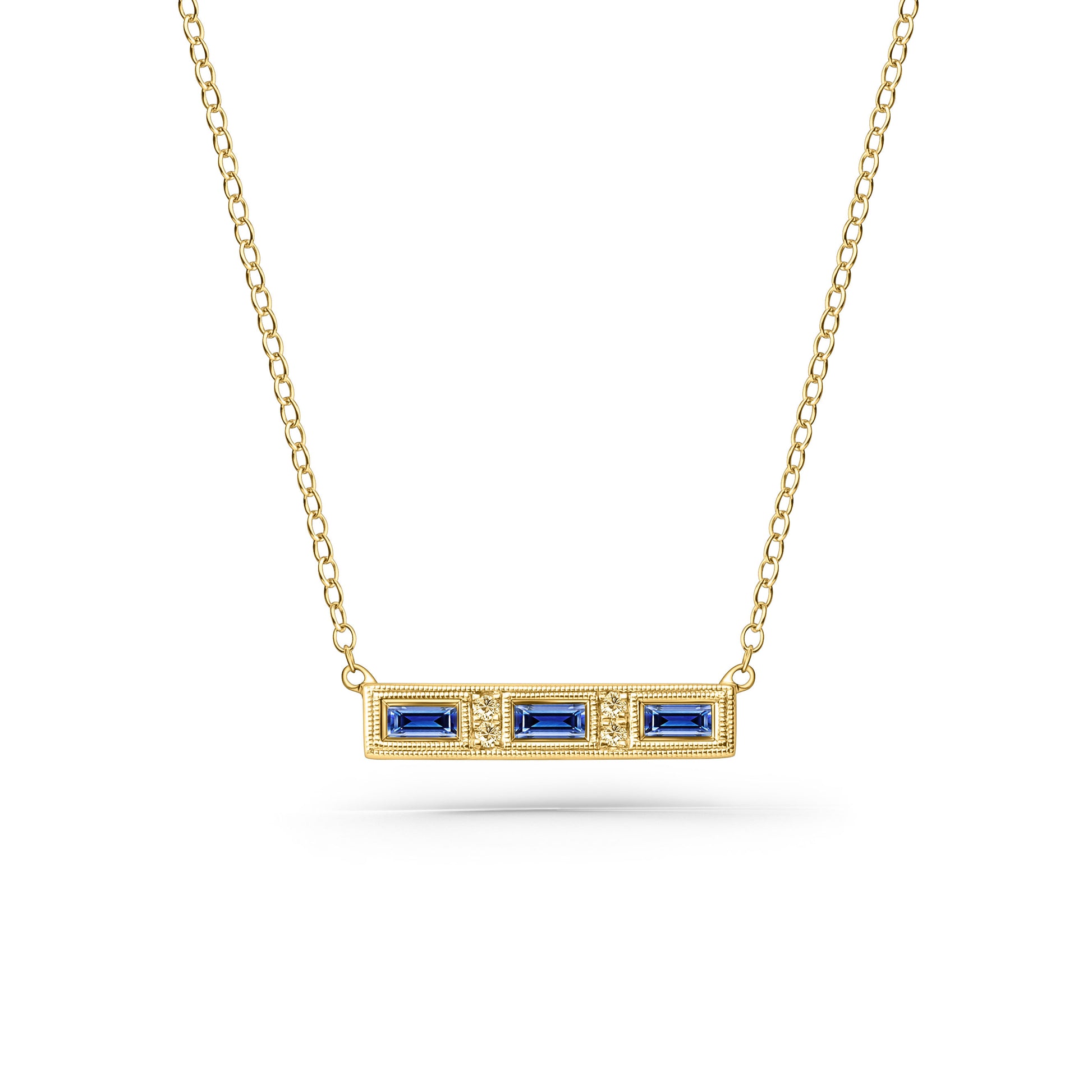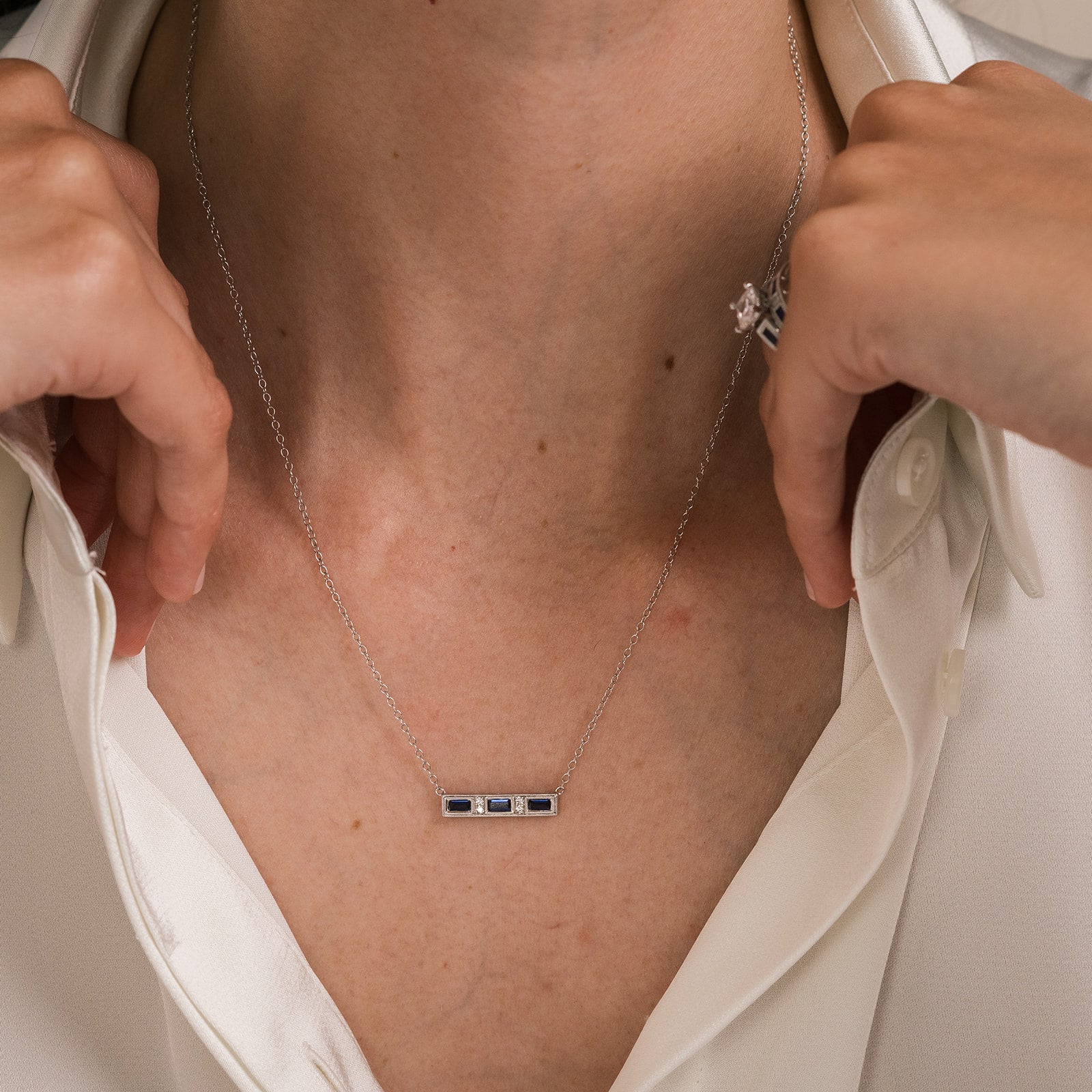 Blue Sapphire Baguette Engraved Diamond Bar Necklace