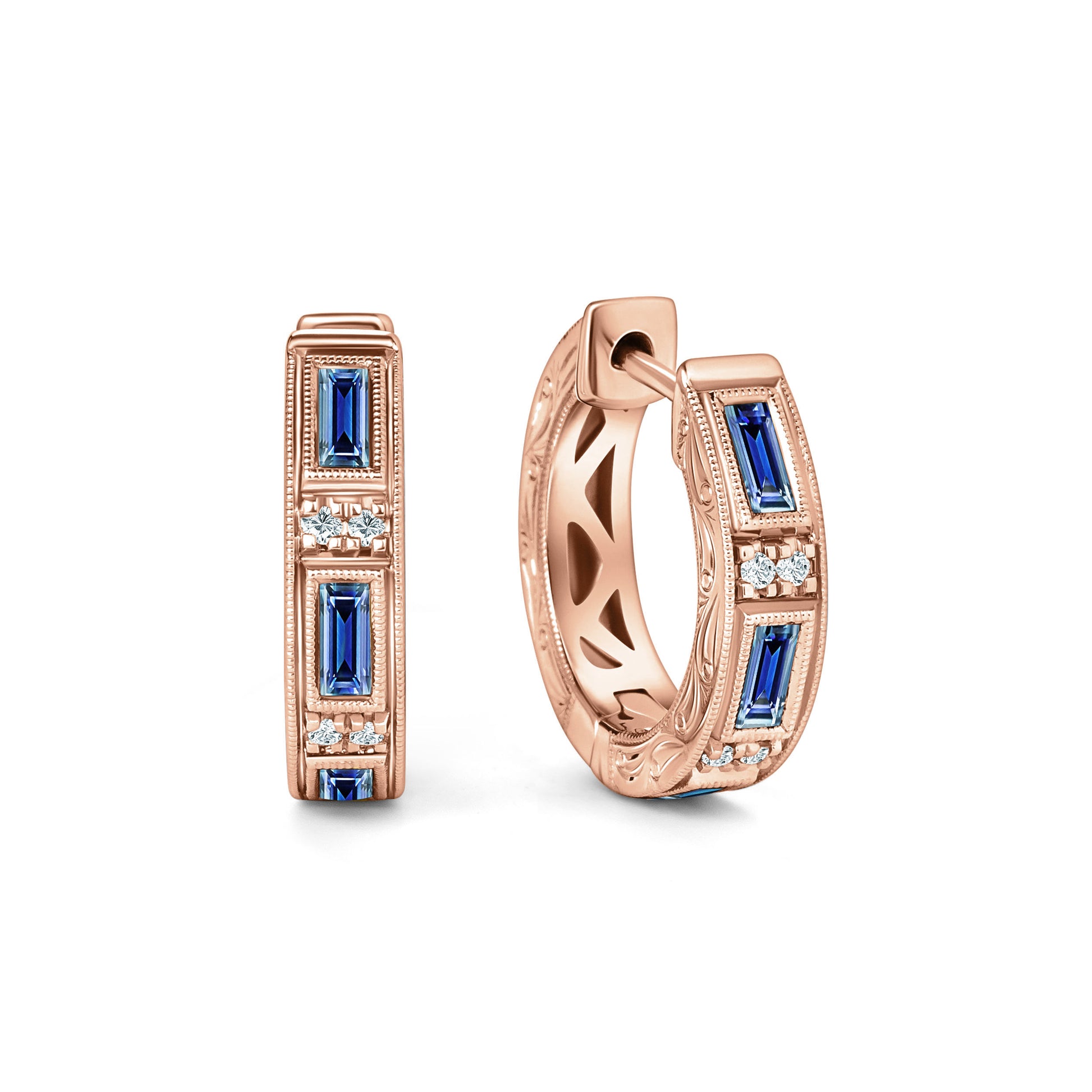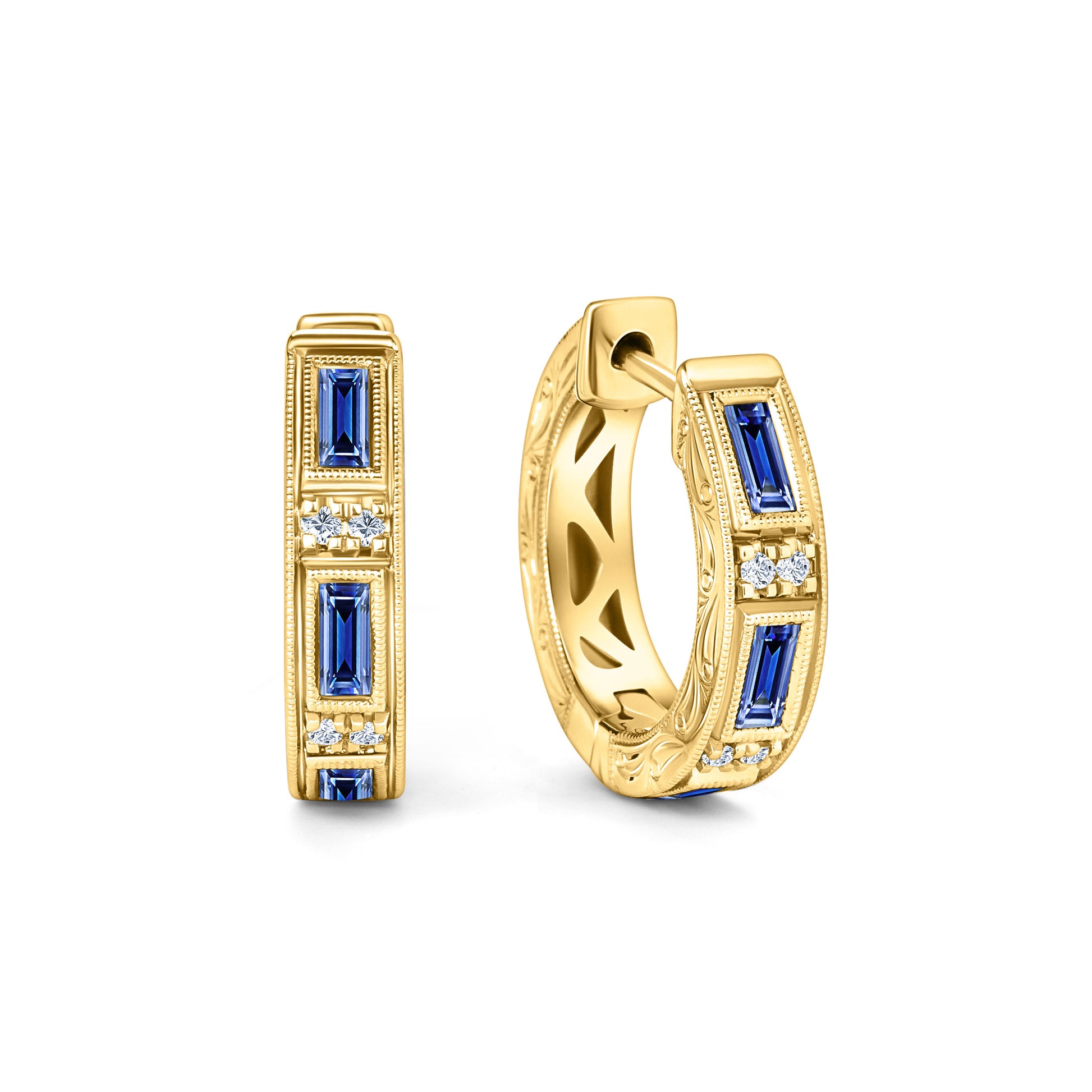 These deco inspired classic hoop earrings are an artistic design from the Charlotte collection. They features 1/20 ctw of diamonds and natural blue sapphire baguettes. The signature handcrafted details include scroll hand engravings and milgrain edging.