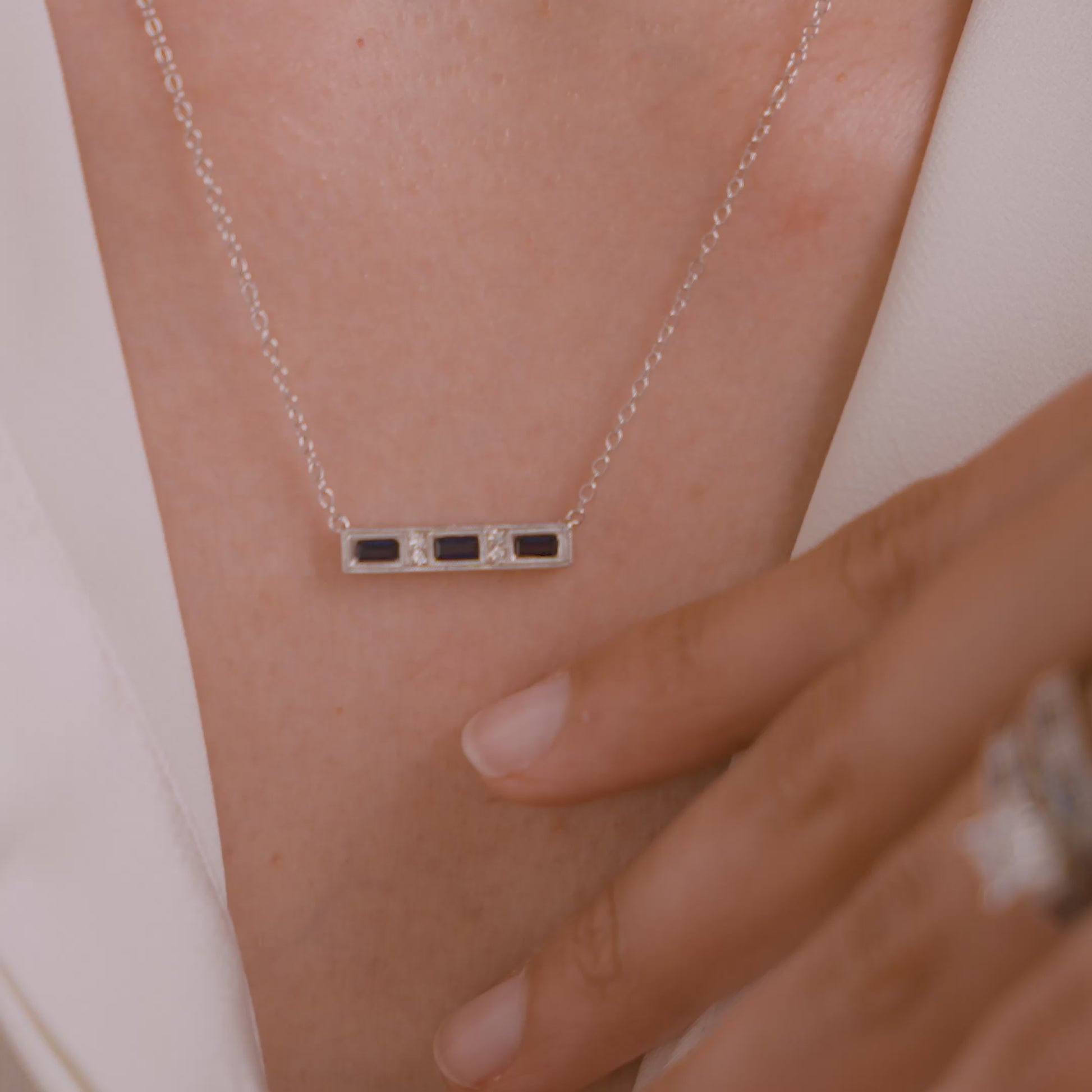 Blue Sapphire Baguette Engraved Diamond Bar Necklace