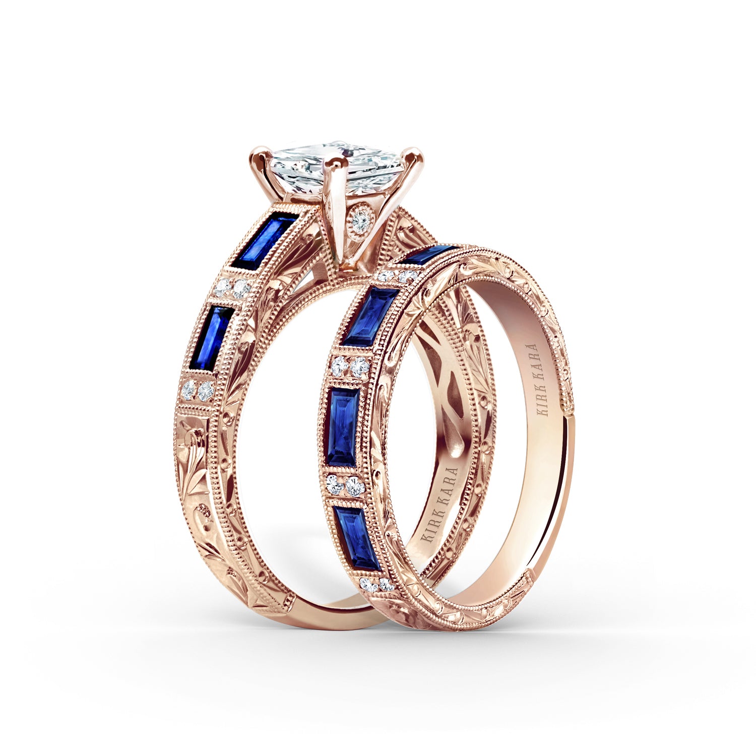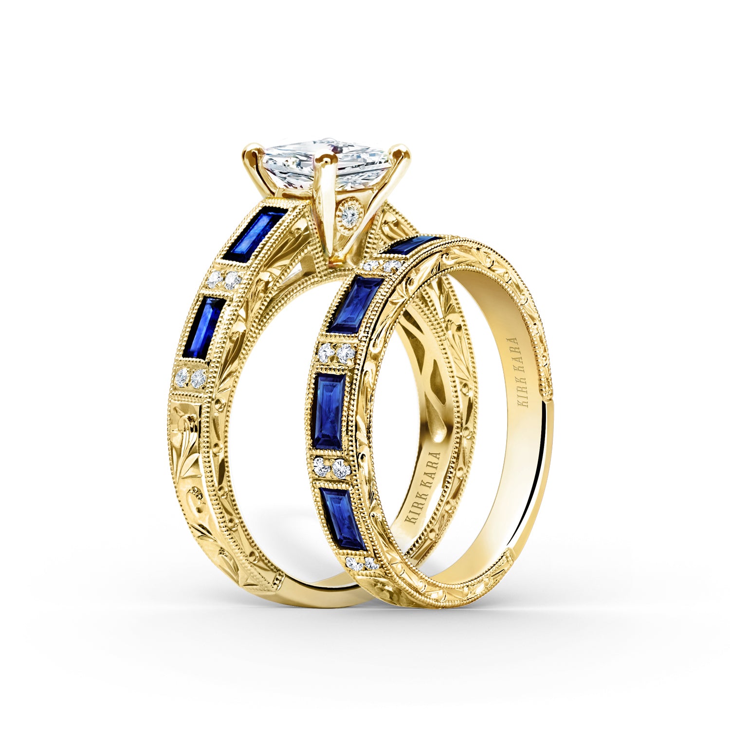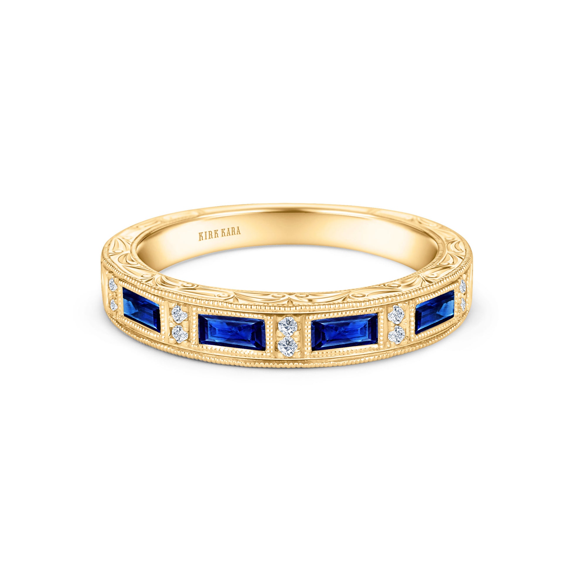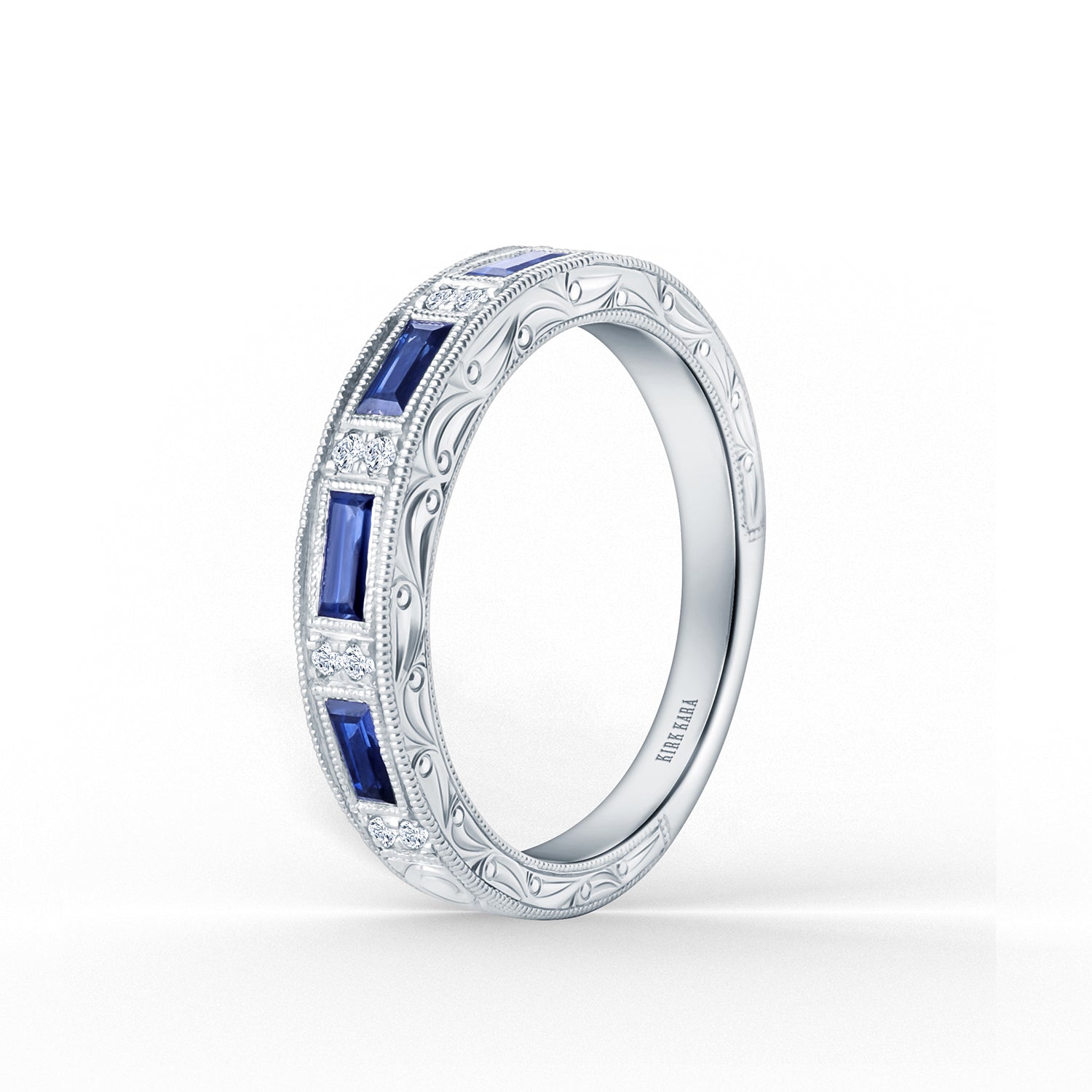 This deco inspired classic is an artistic design from the Charlotte collection. It features 1/20 ctw of diamonds and natural blue sapphire baguettes. The signature handcrafted details include scroll hand engravings and milgrain edging. Accent diamonds are available in both natural and lab grown options.