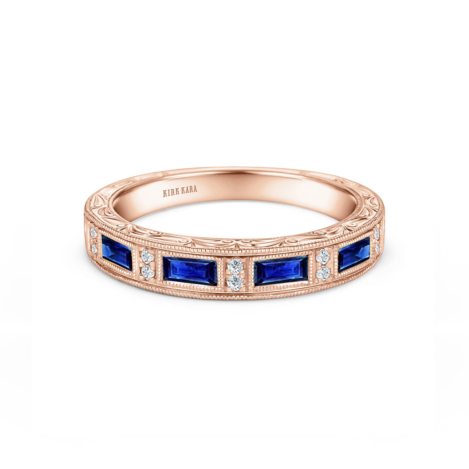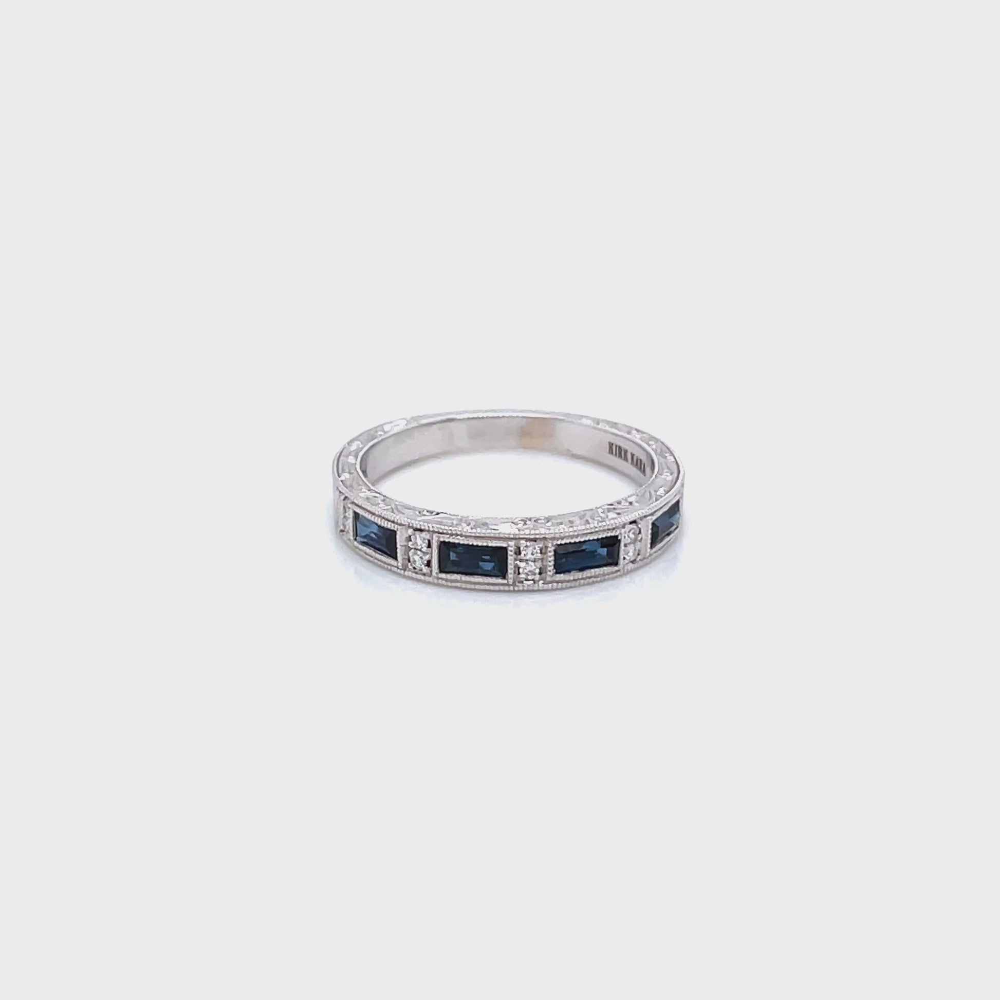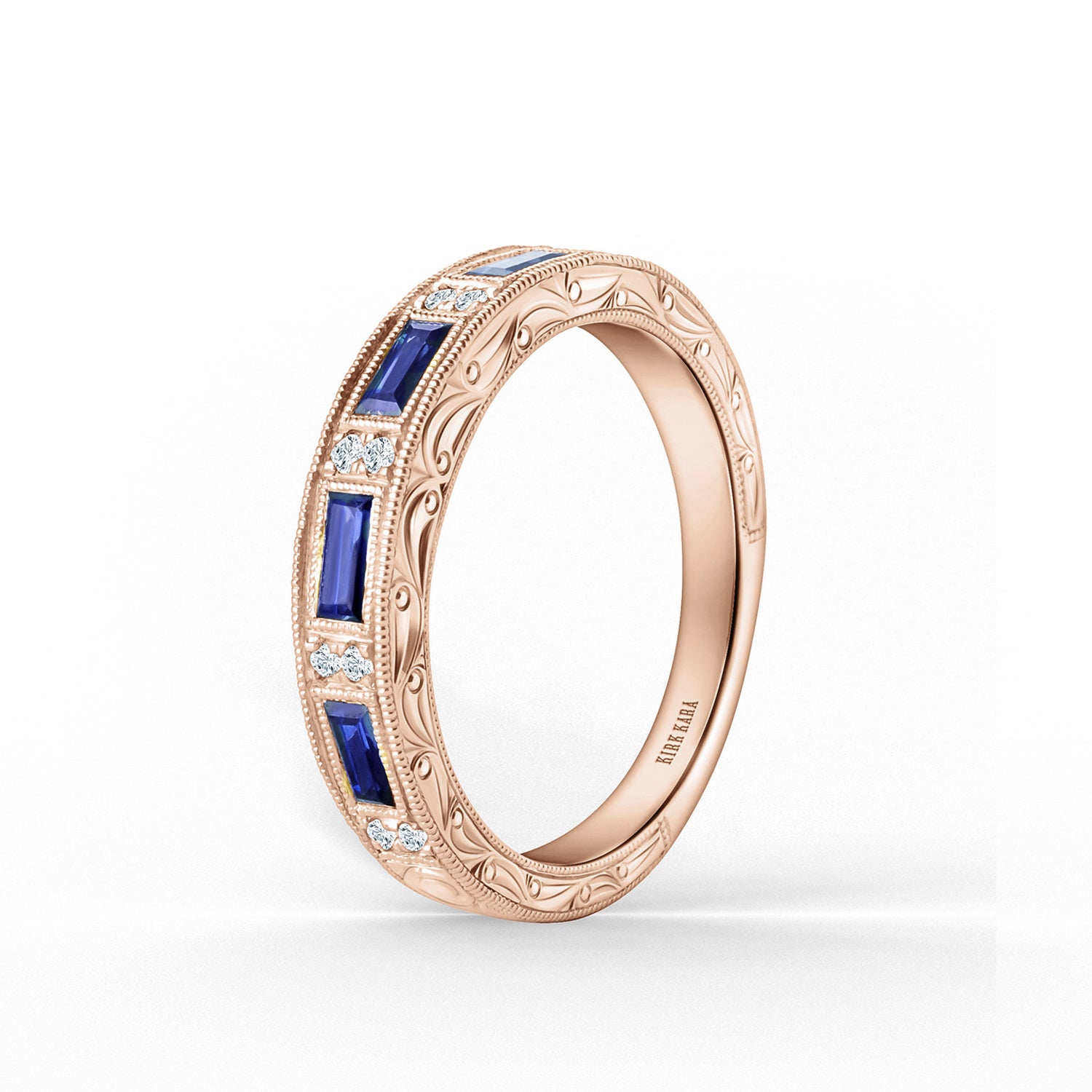 Blue Sapphire Baguette Engraved Diamond Wedding Band
