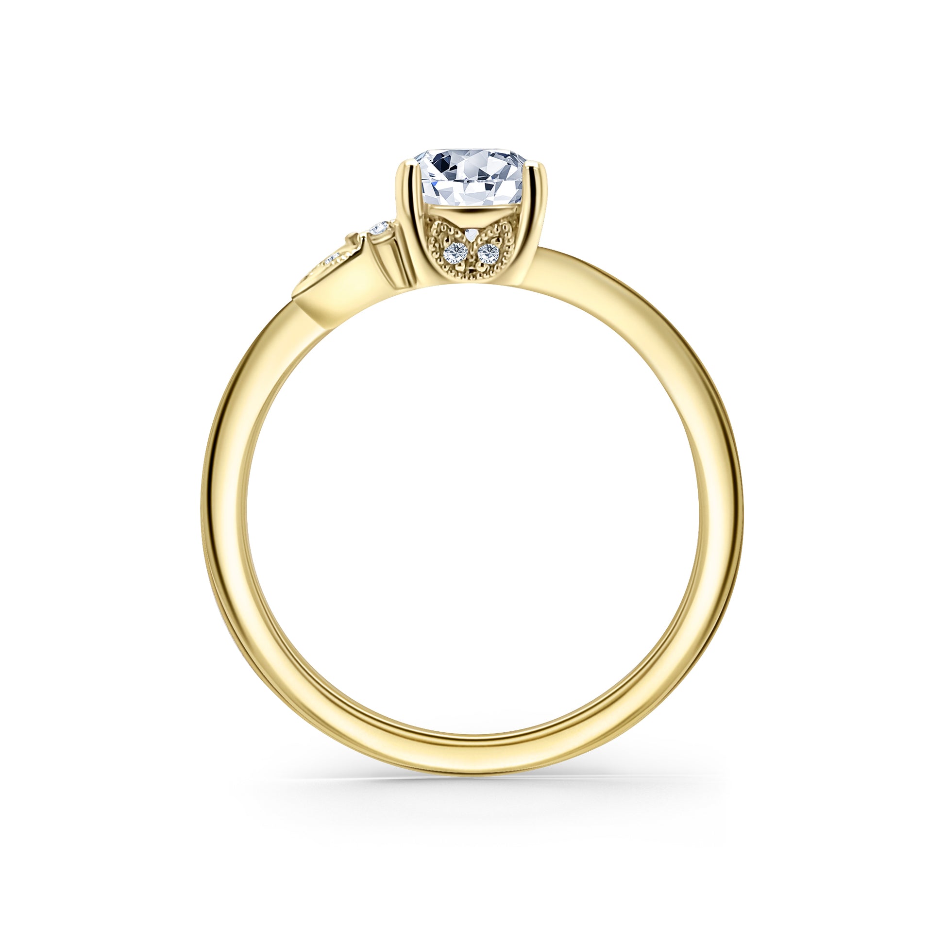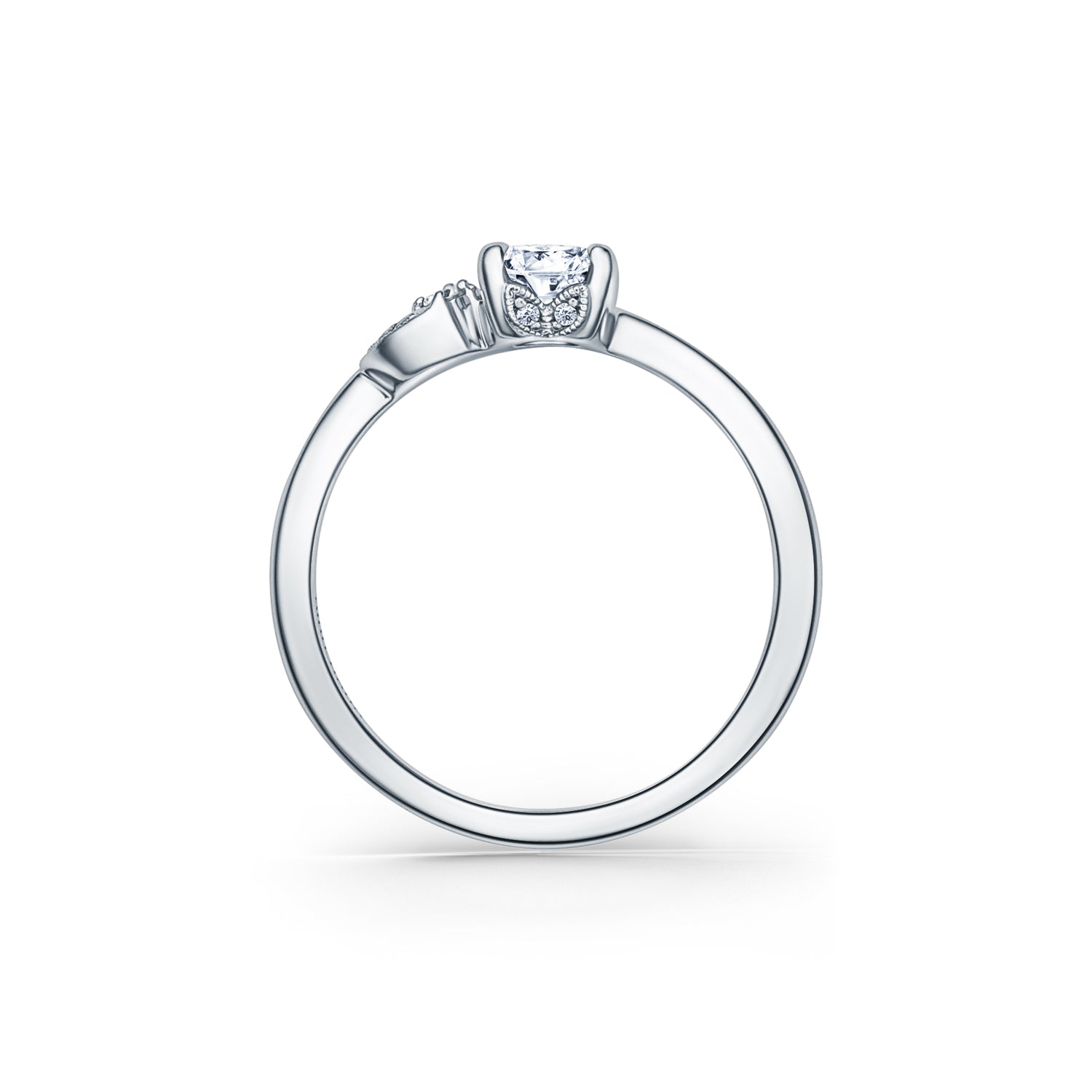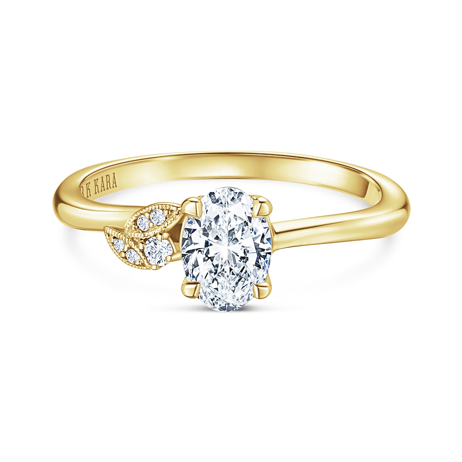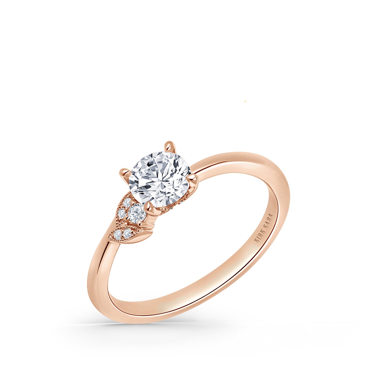 This nature-inspired design with leaf motif details is from the Dahlia collection. It features 1/20 ctw of diamonds. The signature handcrafted details include peek-a-boo diamonds and milgrain. Both lab grown and natural diamonds are available for this setting. All center stone sizes and shapes are possible.