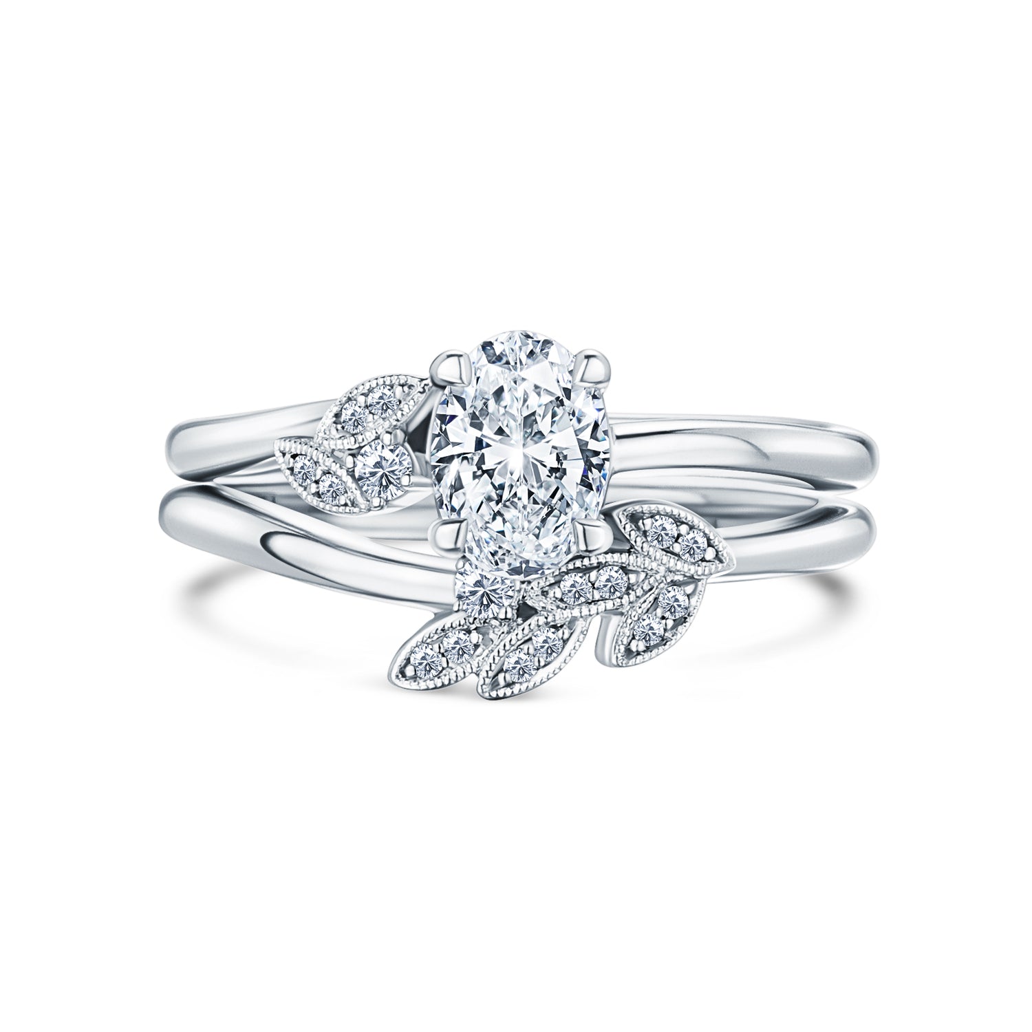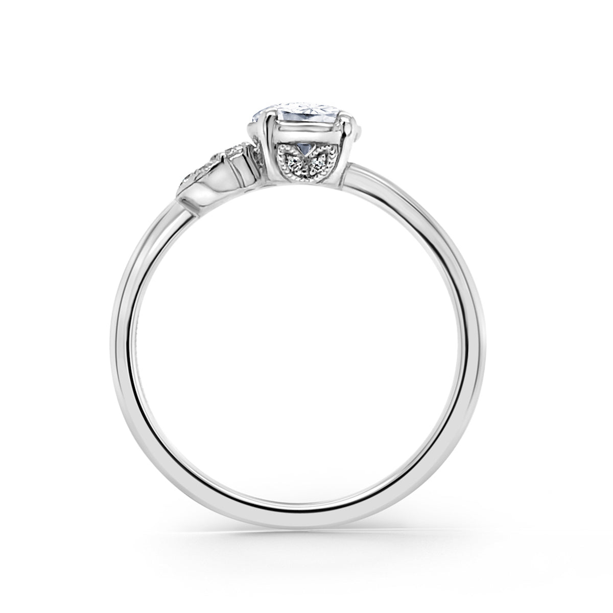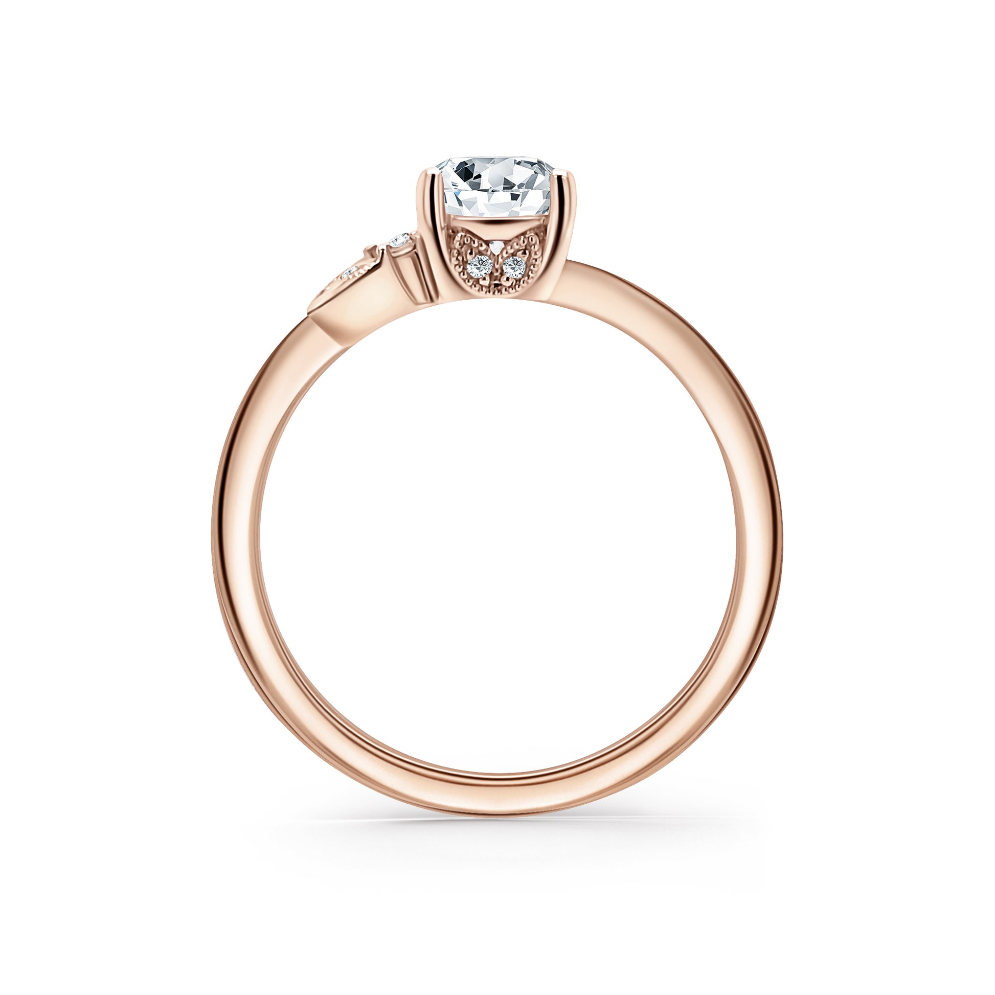 This nature-inspired design with leaf motif details is from the Dahlia collection. It features 1/20 ctw of diamonds. The signature handcrafted details include peek-a-boo diamonds and milgrain. Both lab grown and natural diamonds are available for this setting. All center stone sizes and shapes are possible.