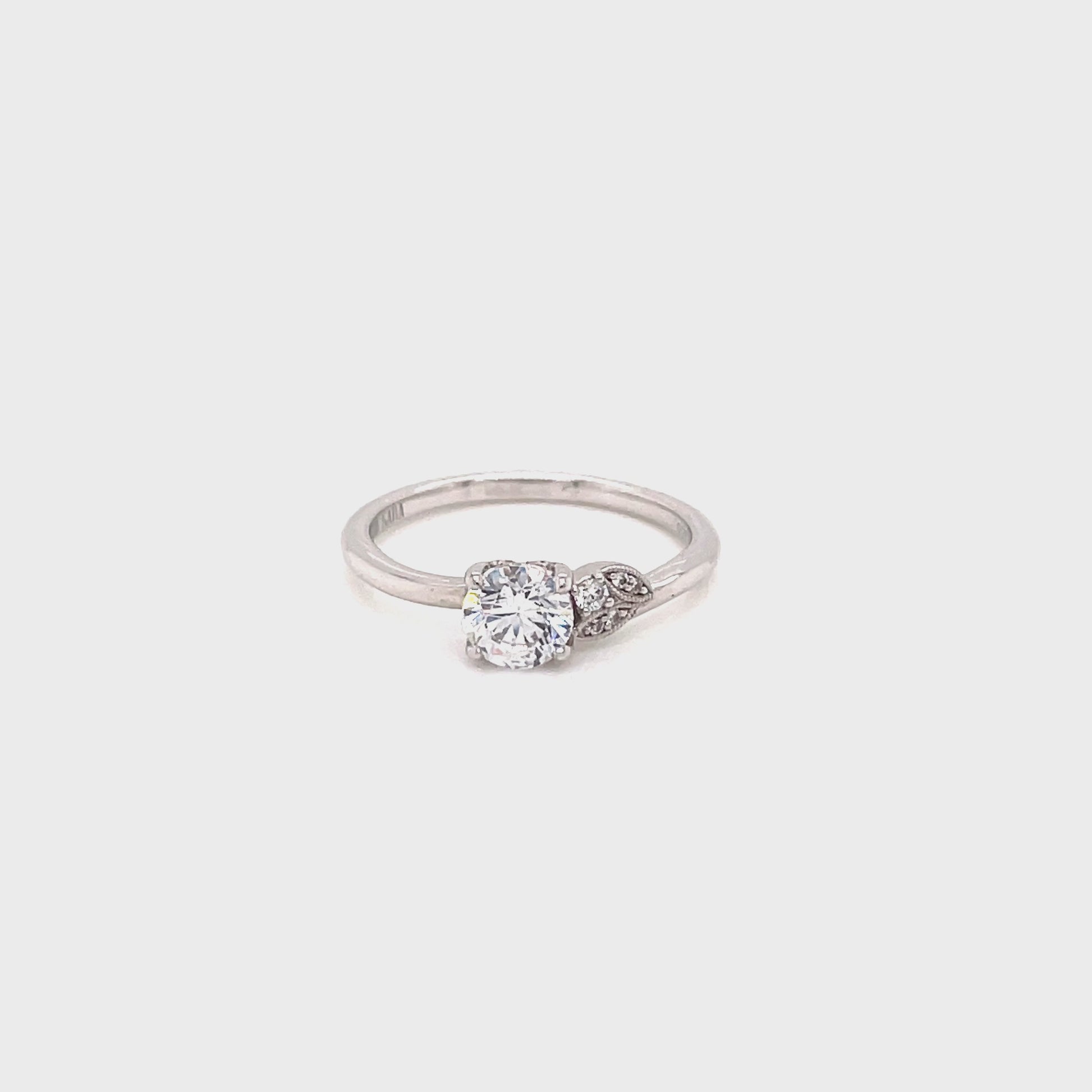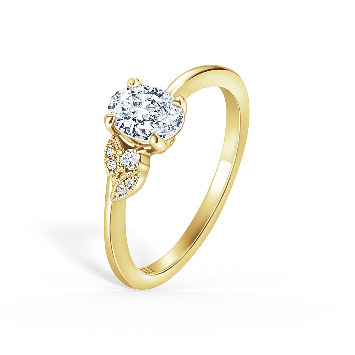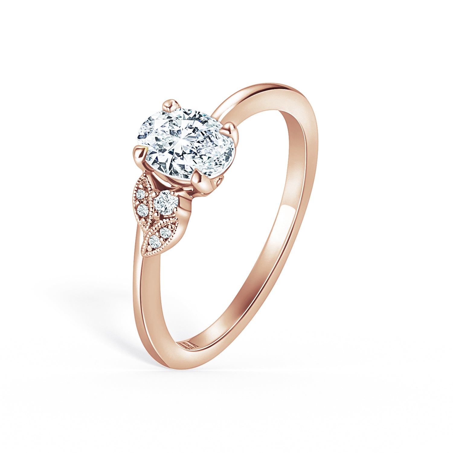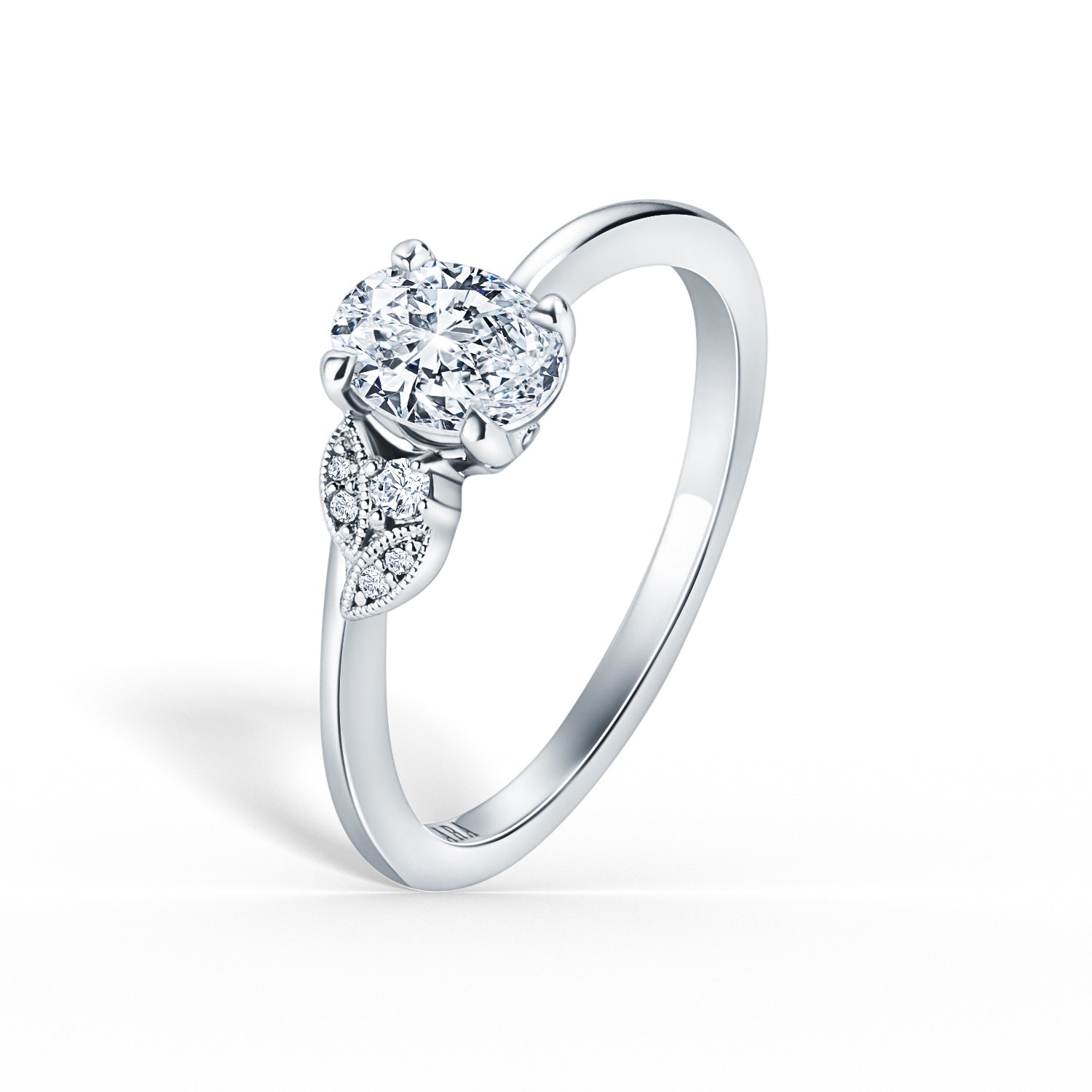 This nature-inspired design with leaf motif details is from the Dahlia collection. It features 1/20 ctw of diamonds. The signature handcrafted details include peek-a-boo diamonds and milgrain. Both lab grown and natural diamonds are available for this setting. All center stone sizes and shapes are possible.