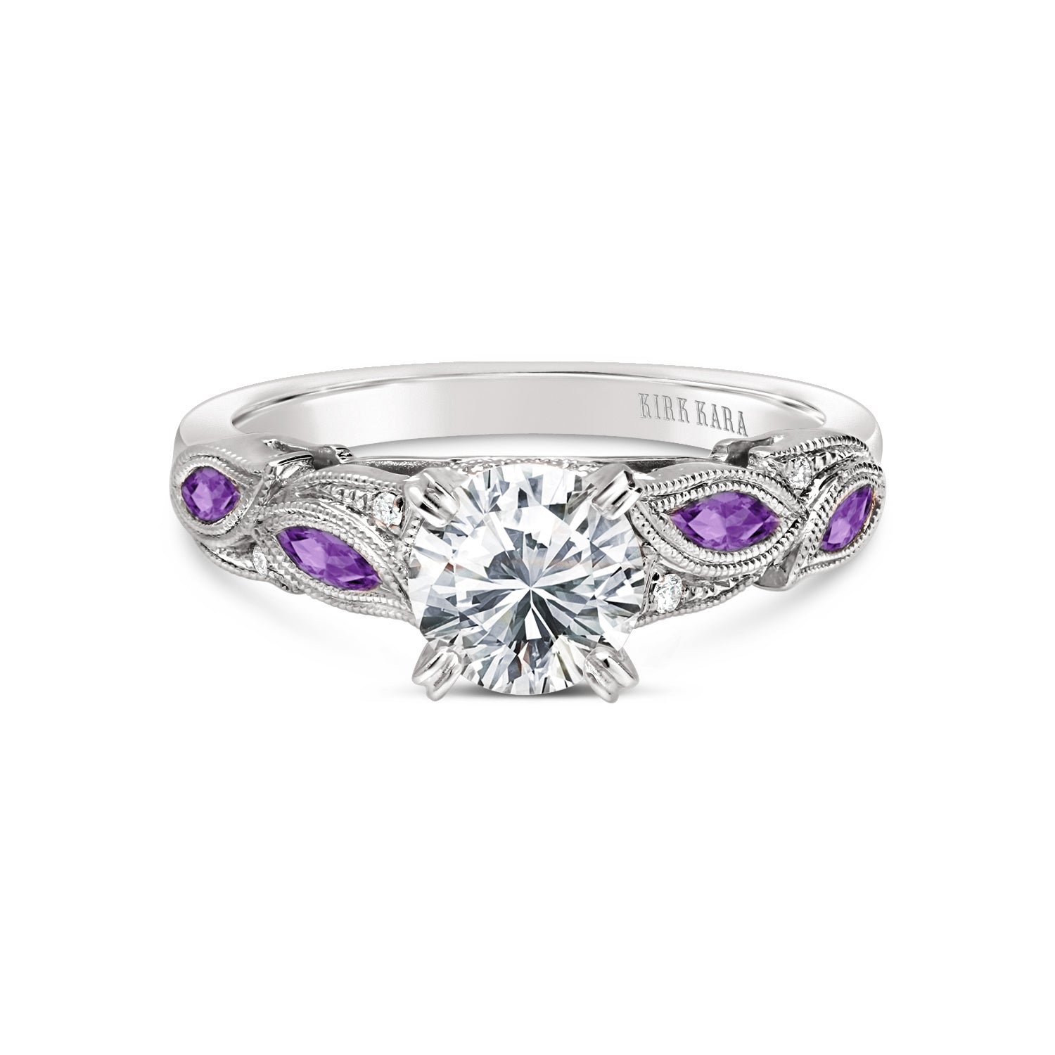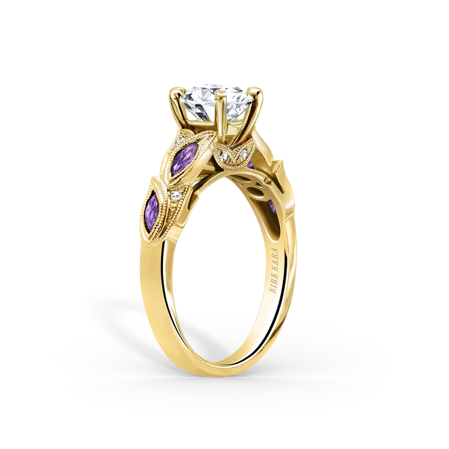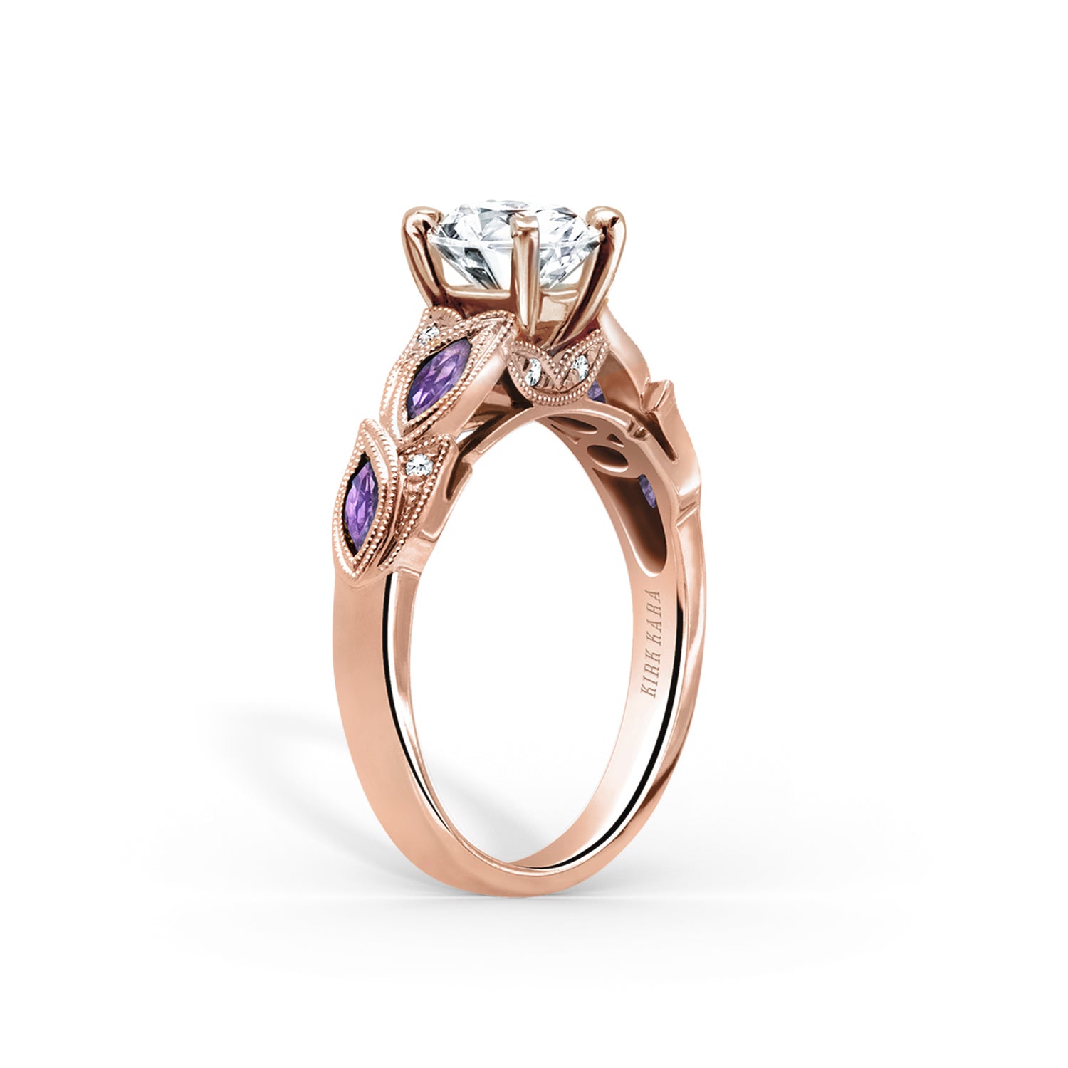 This nature-inspired design with floral details is from the Dahlia collection. It features 1/20 ctw of diamonds and natural amethyst marquise. The signature handcrafted details include peek-a-boo diamonds and milgrain edging. Ring as shown fits a 1.00 carat round cut stone. All center stone sizes and shapes are possible.