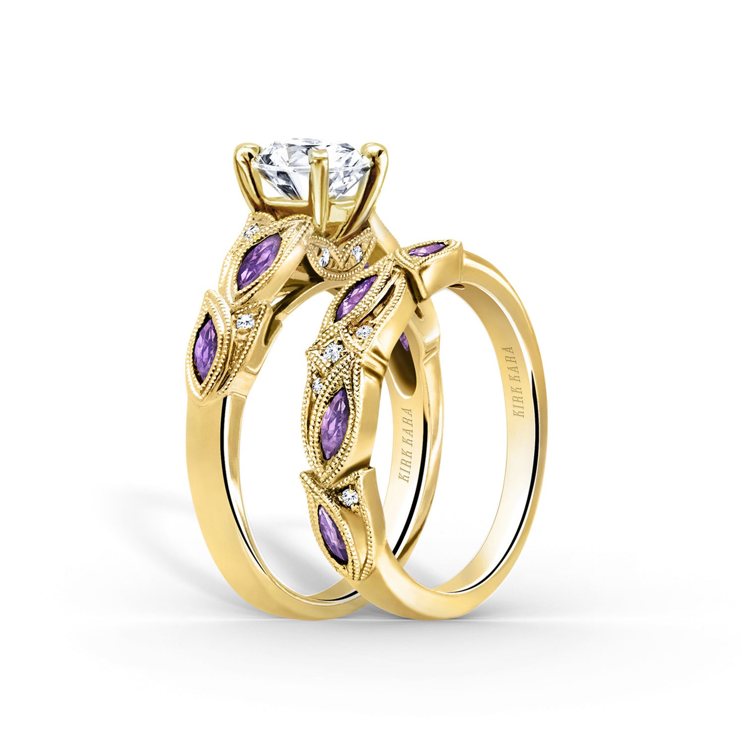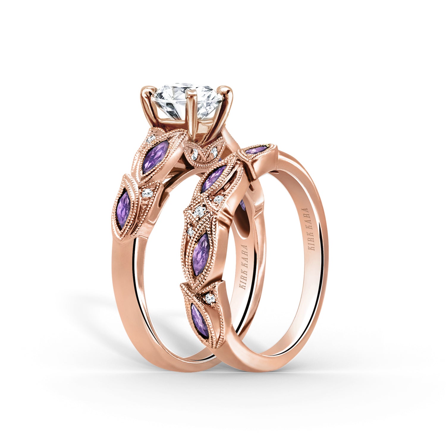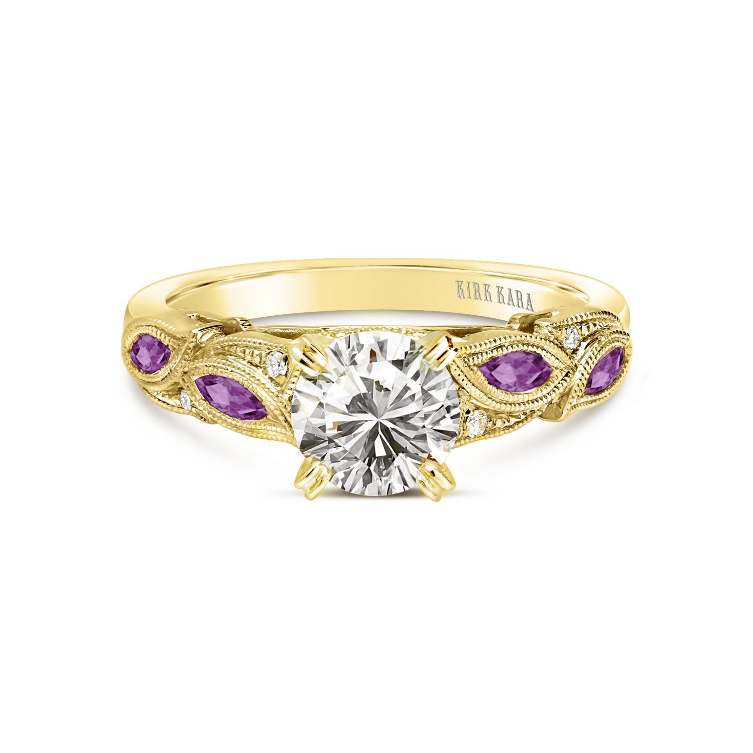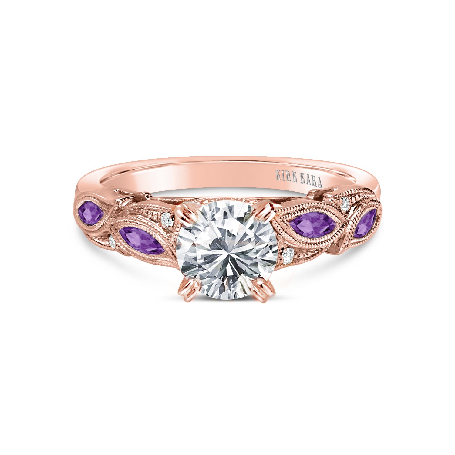 This nature-inspired design with floral details is from the Dahlia collection. It features 1/20 ctw of diamonds and natural amethyst marquise. The signature handcrafted details include peek-a-boo diamonds and milgrain edging. Ring as shown fits a 1.00 carat round cut stone. All center stone sizes and shapes are possible.