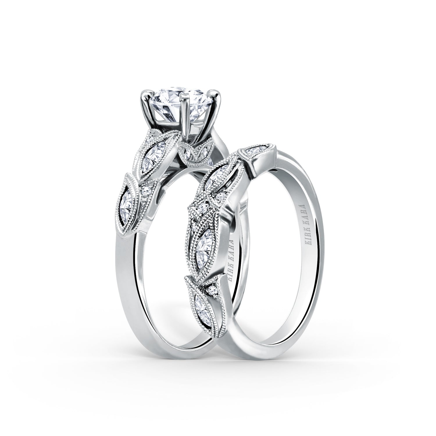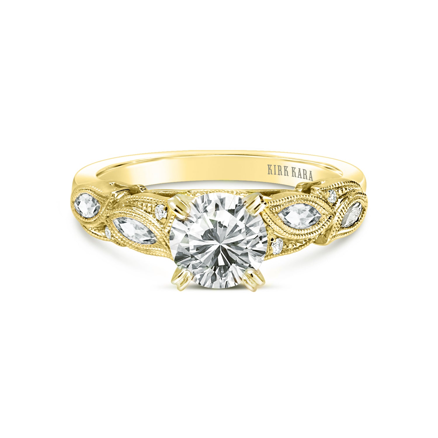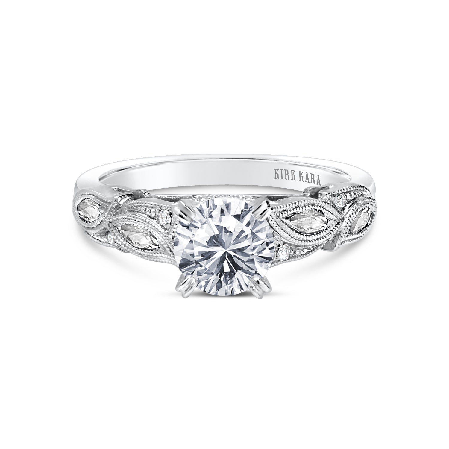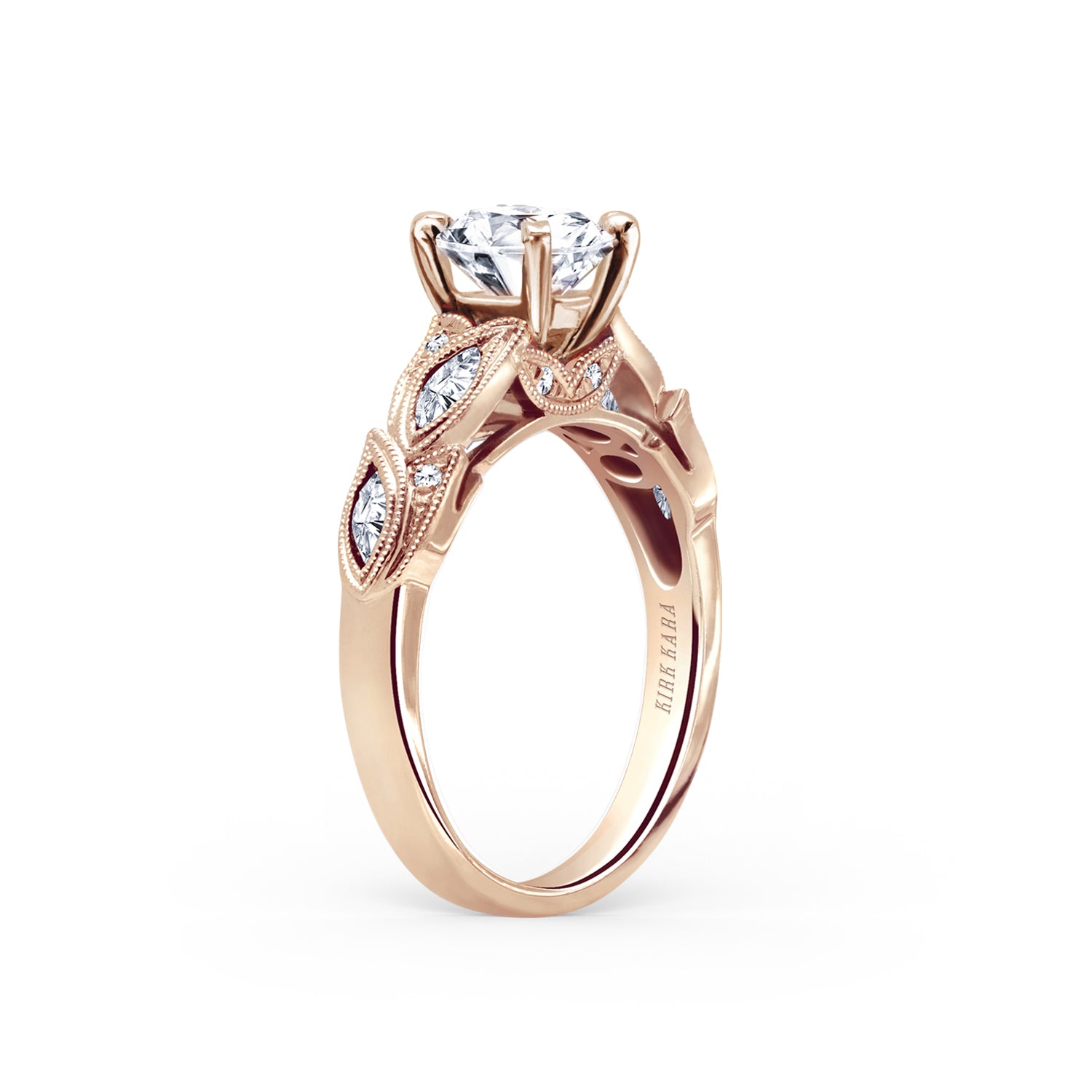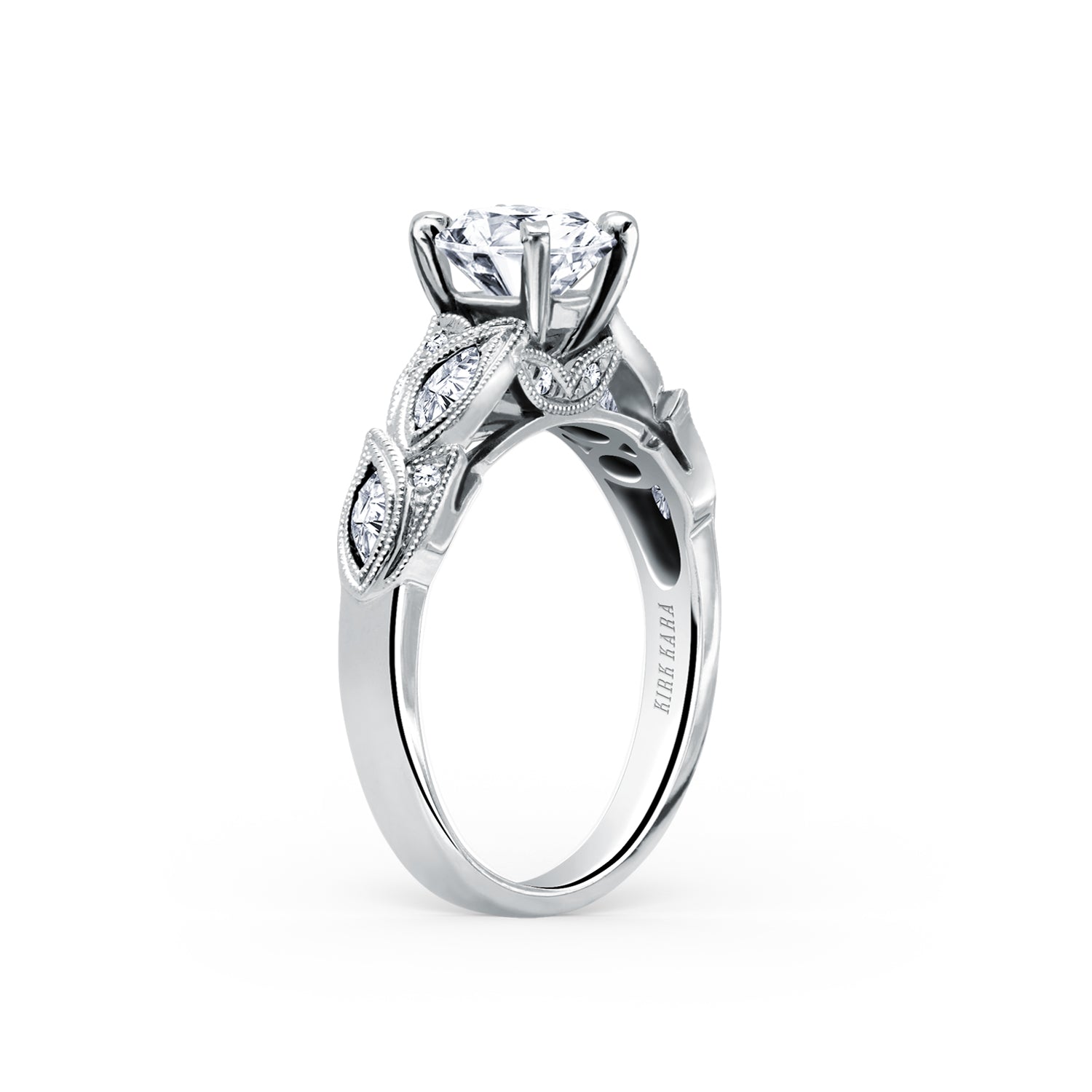 This nature-inspired design with floral details is from the Dahlia collection. It features 1/3 ctw of diamonds. The signature handcrafted details include peek-a-boo diamonds and milgrain edging. Both lab grown and natural diamonds are available for this setting. Ring as shown fits a 1.00 carat round cut stone. All center stone sizes and shapes are possible.