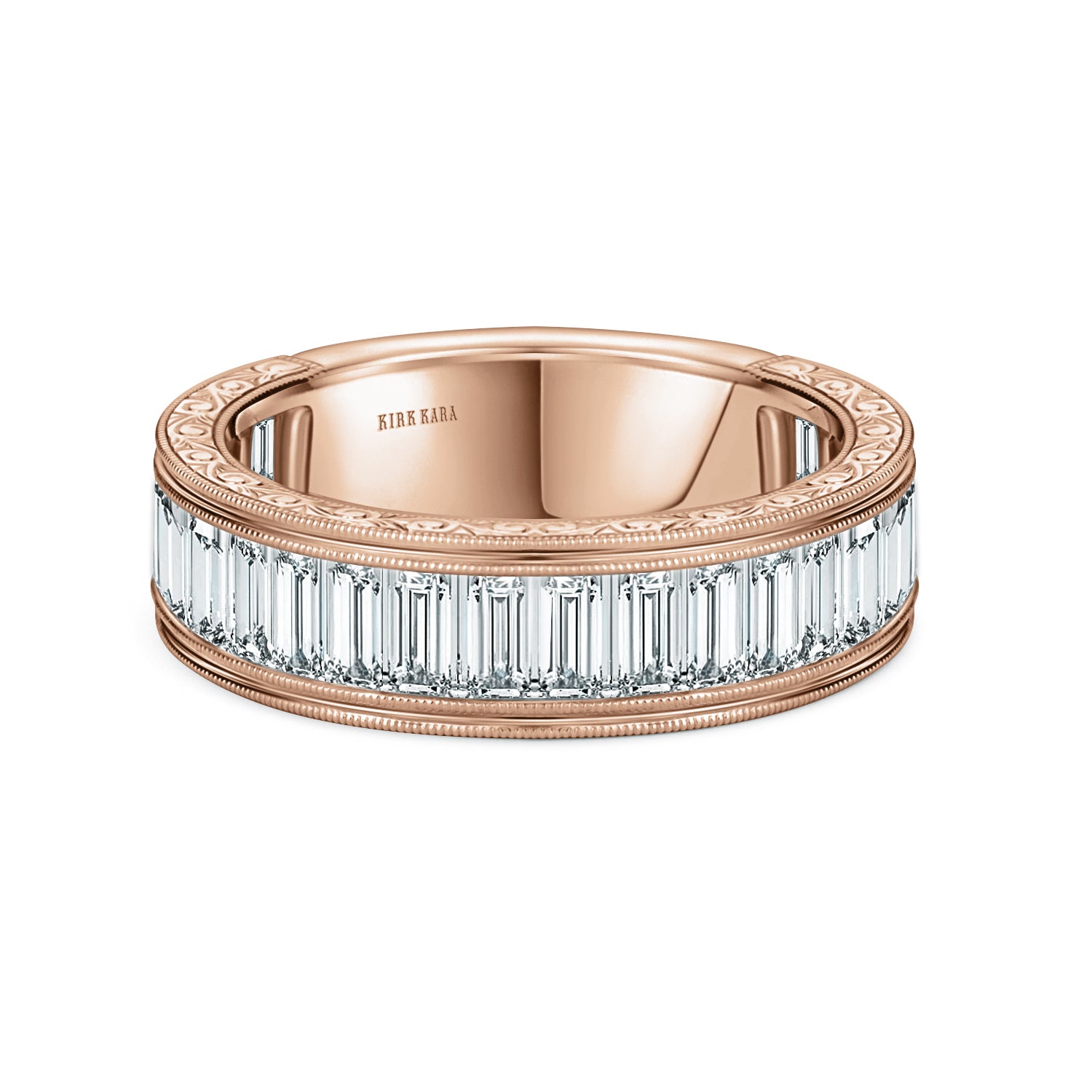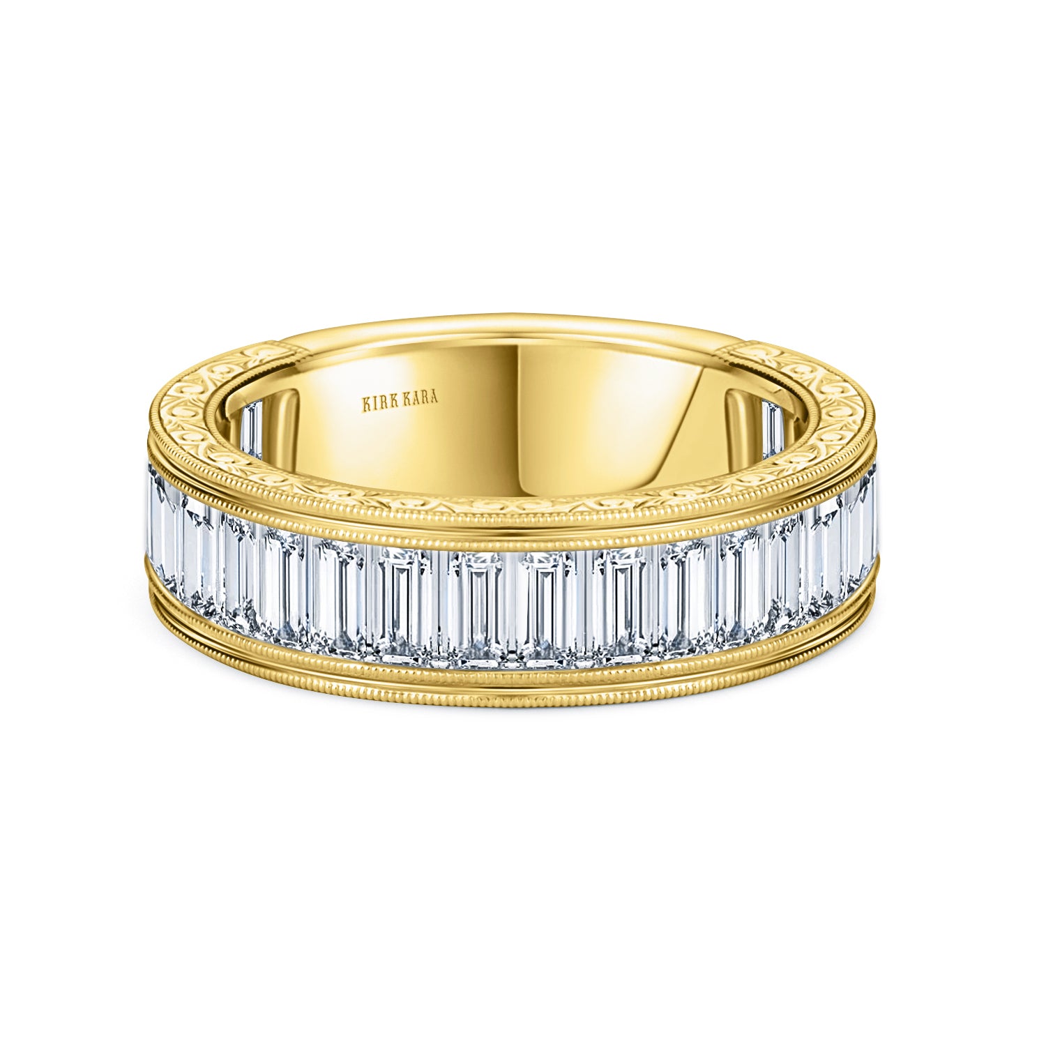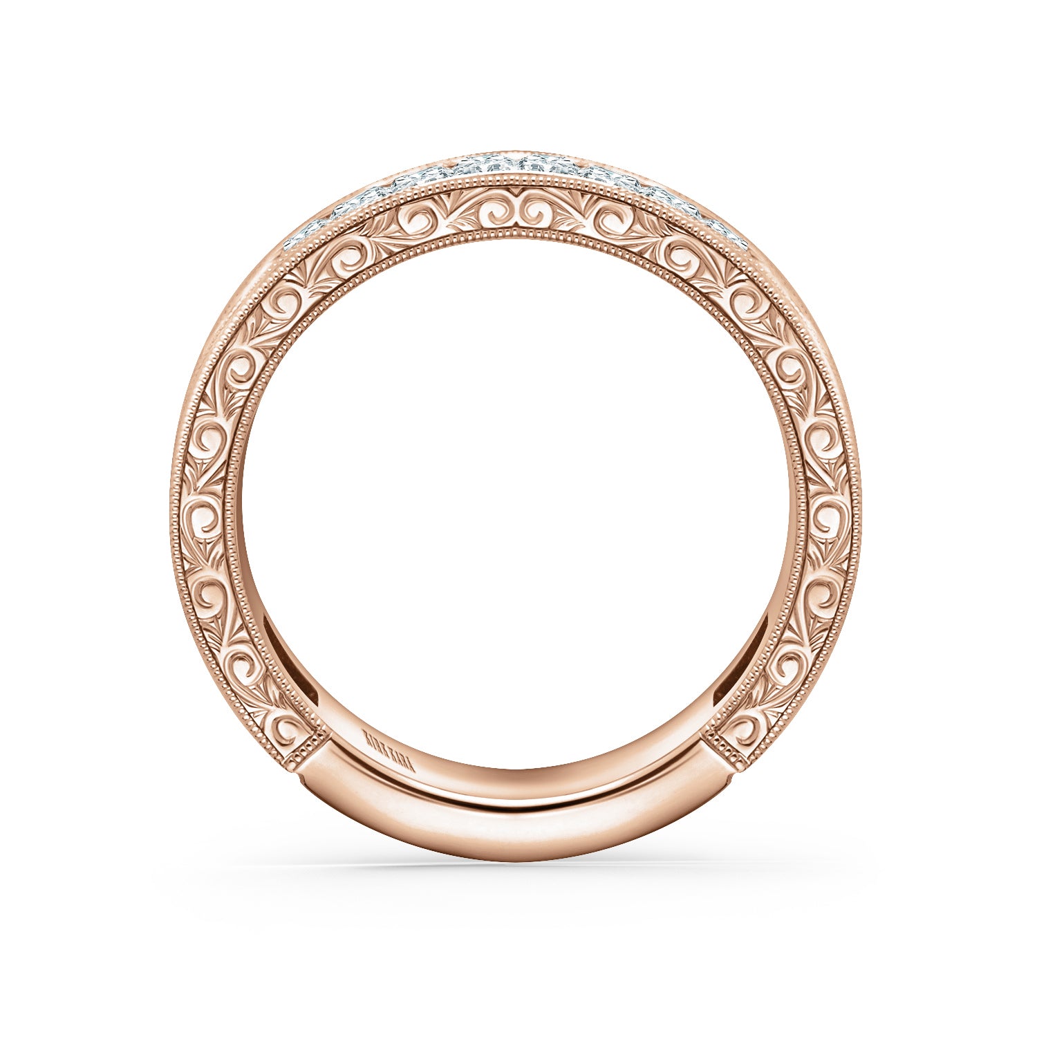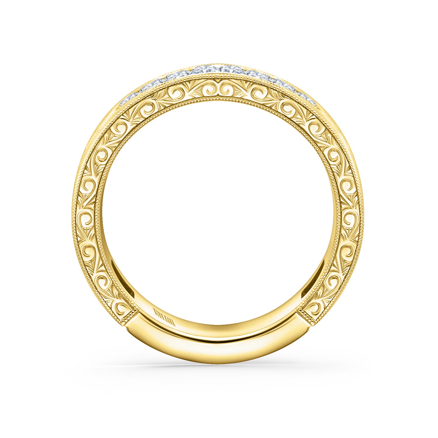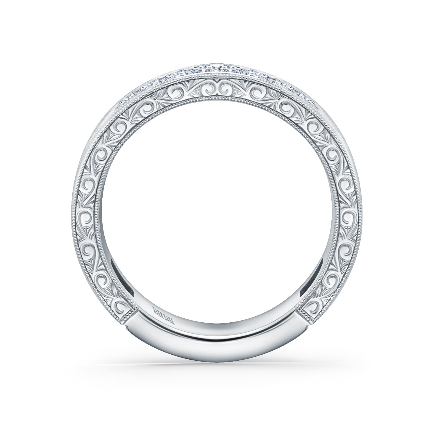 This modern inspired classic is an engraved design from the Stella collection. It features 1 1/2 ctw of diamonds. The signature handcrafted details include scroll hand engravings and milgrain edging. Both lab grown and natural diamonds are available for this band.