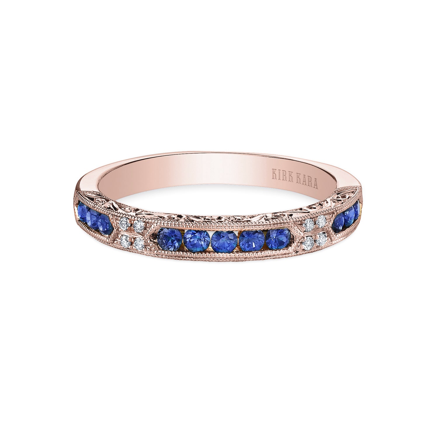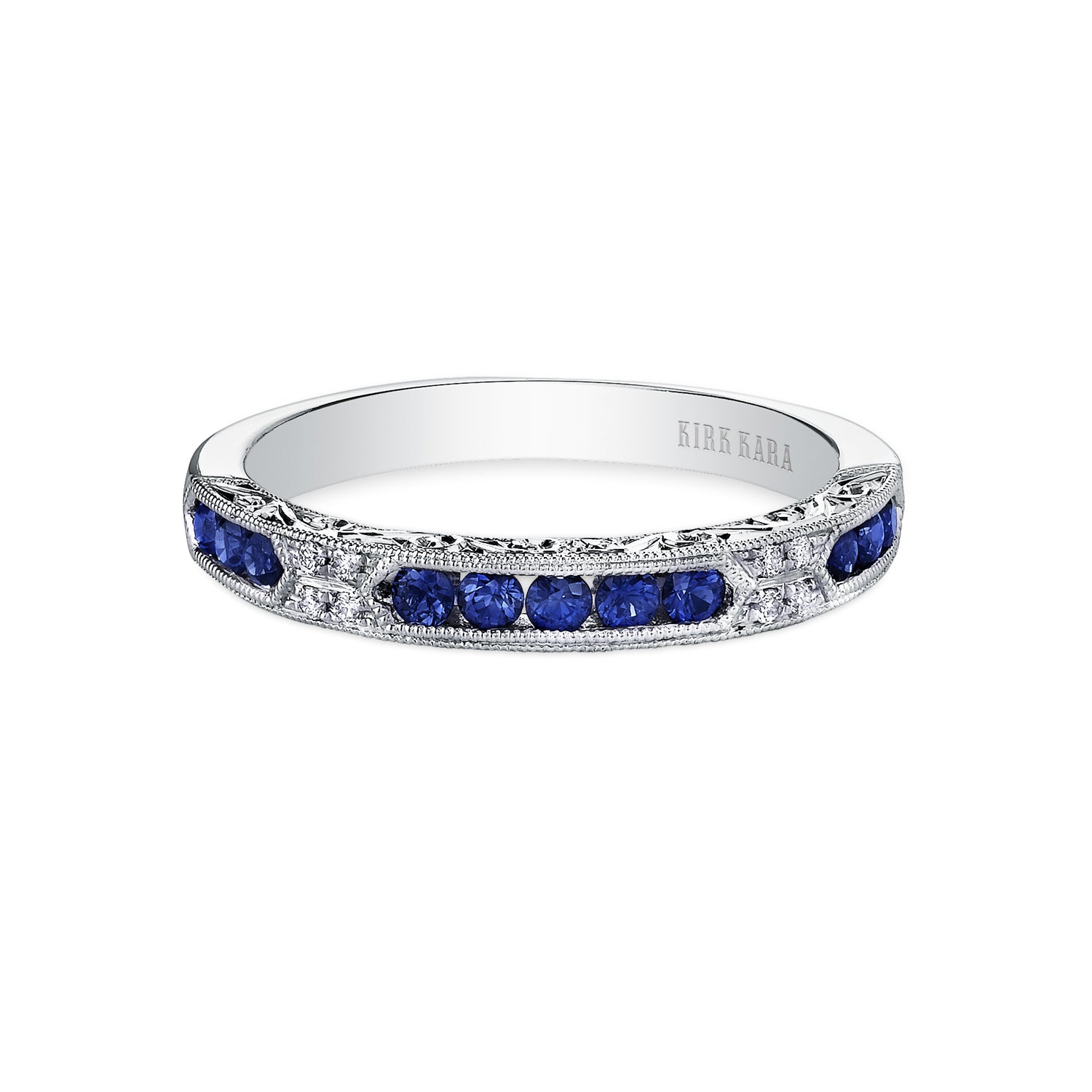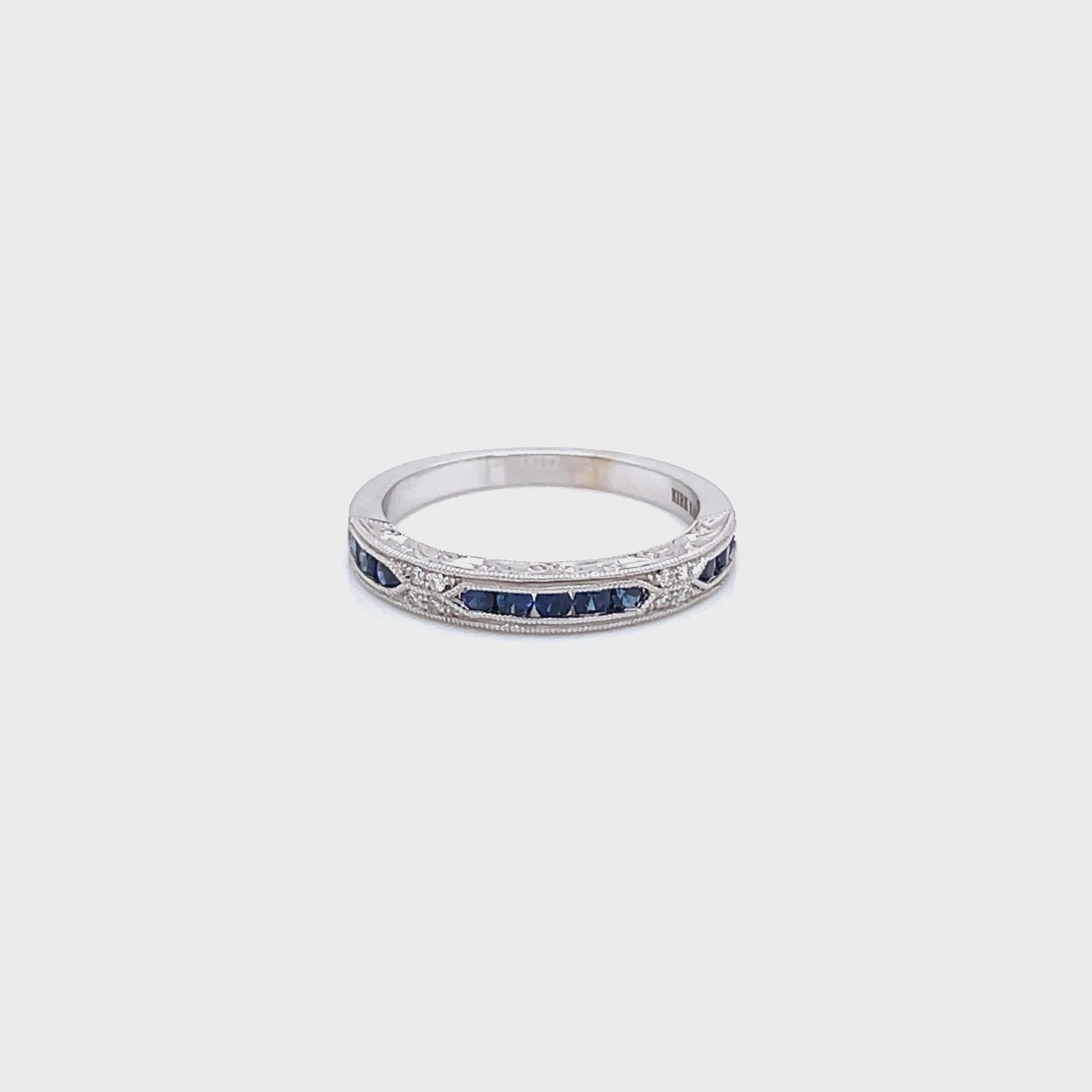 This deco inspired classic is an artistic design from the Charlotte collection. It features 0.03 ctw of diamonds and natural round blue sapphires. The signature handcrafted details include scroll hand engravings and milgrain edging.