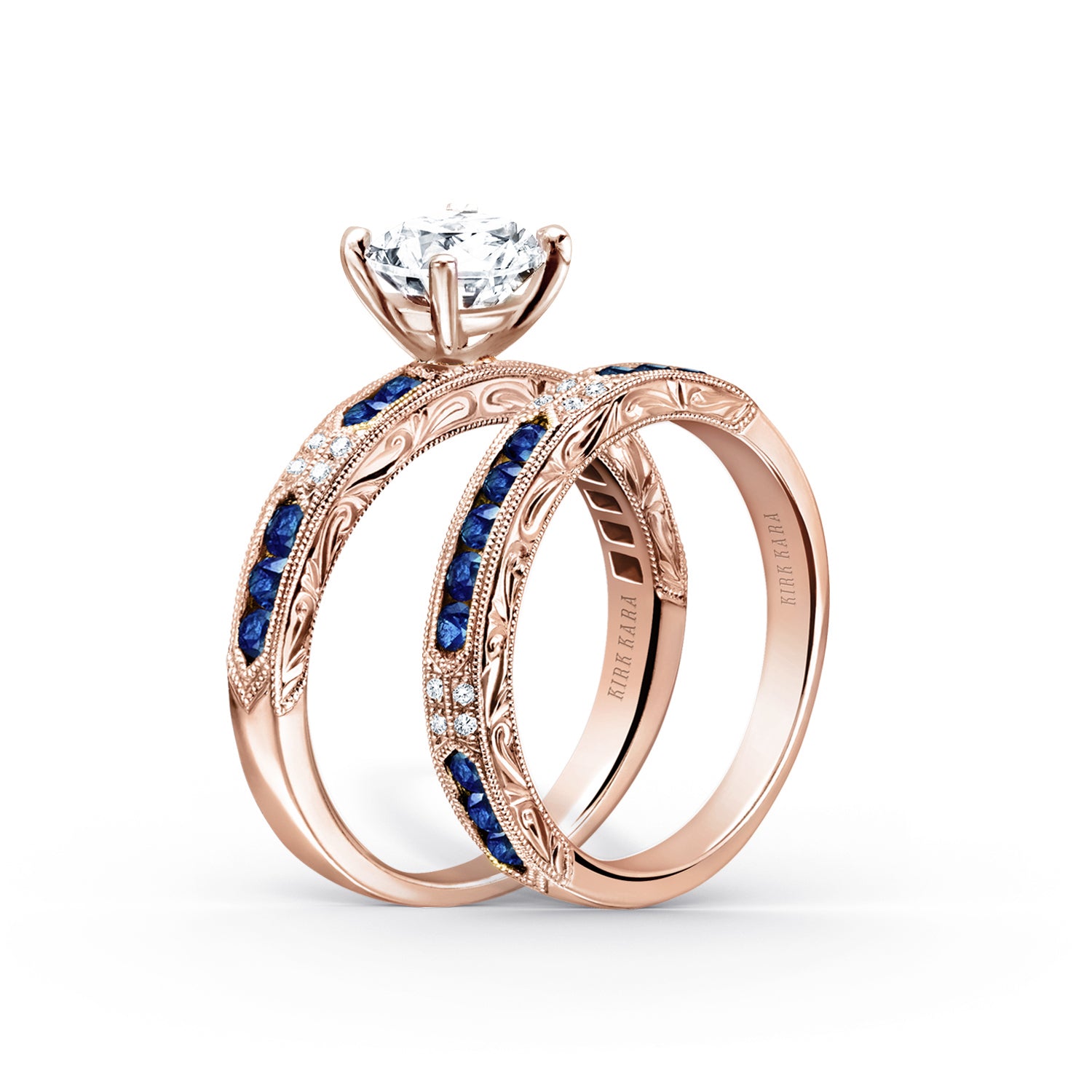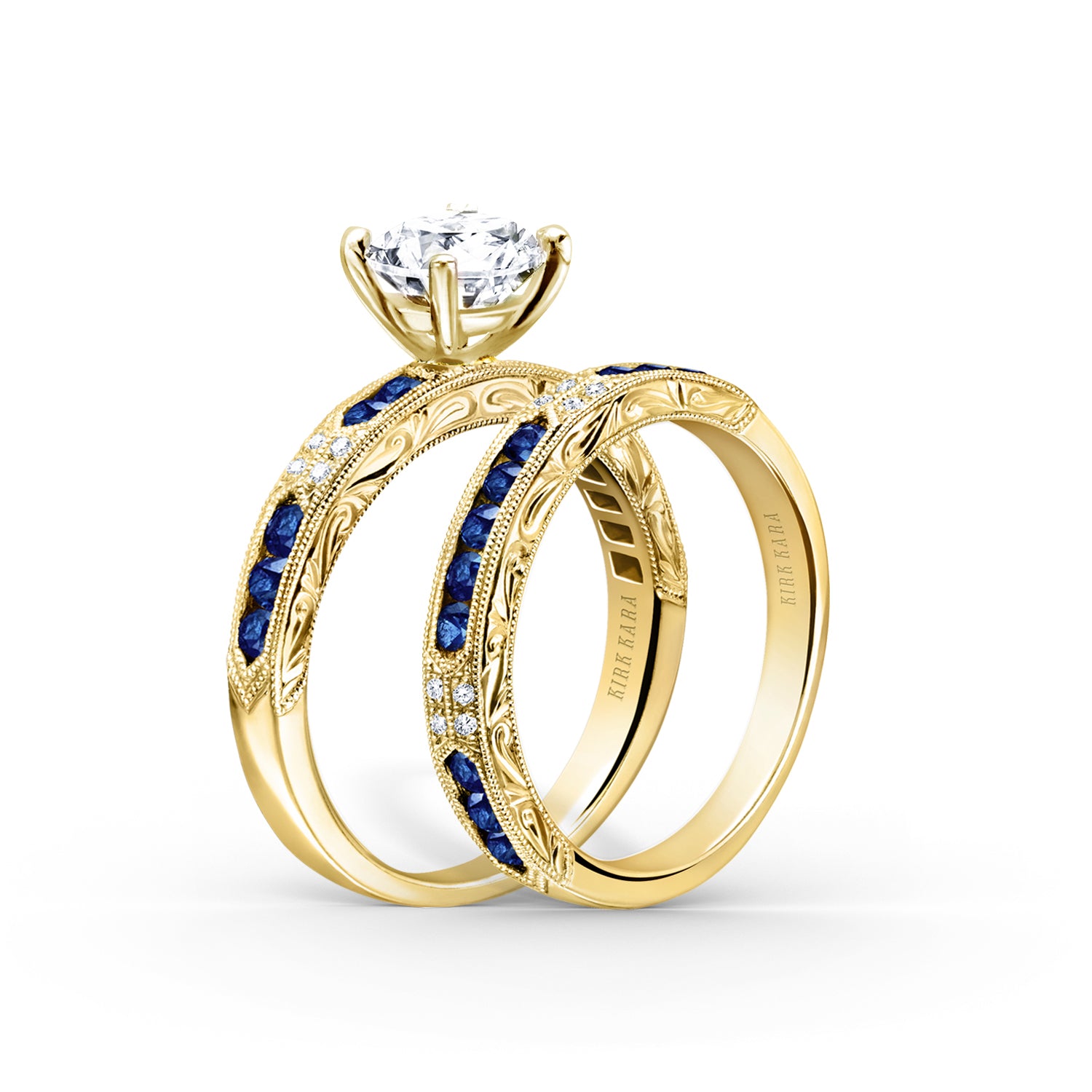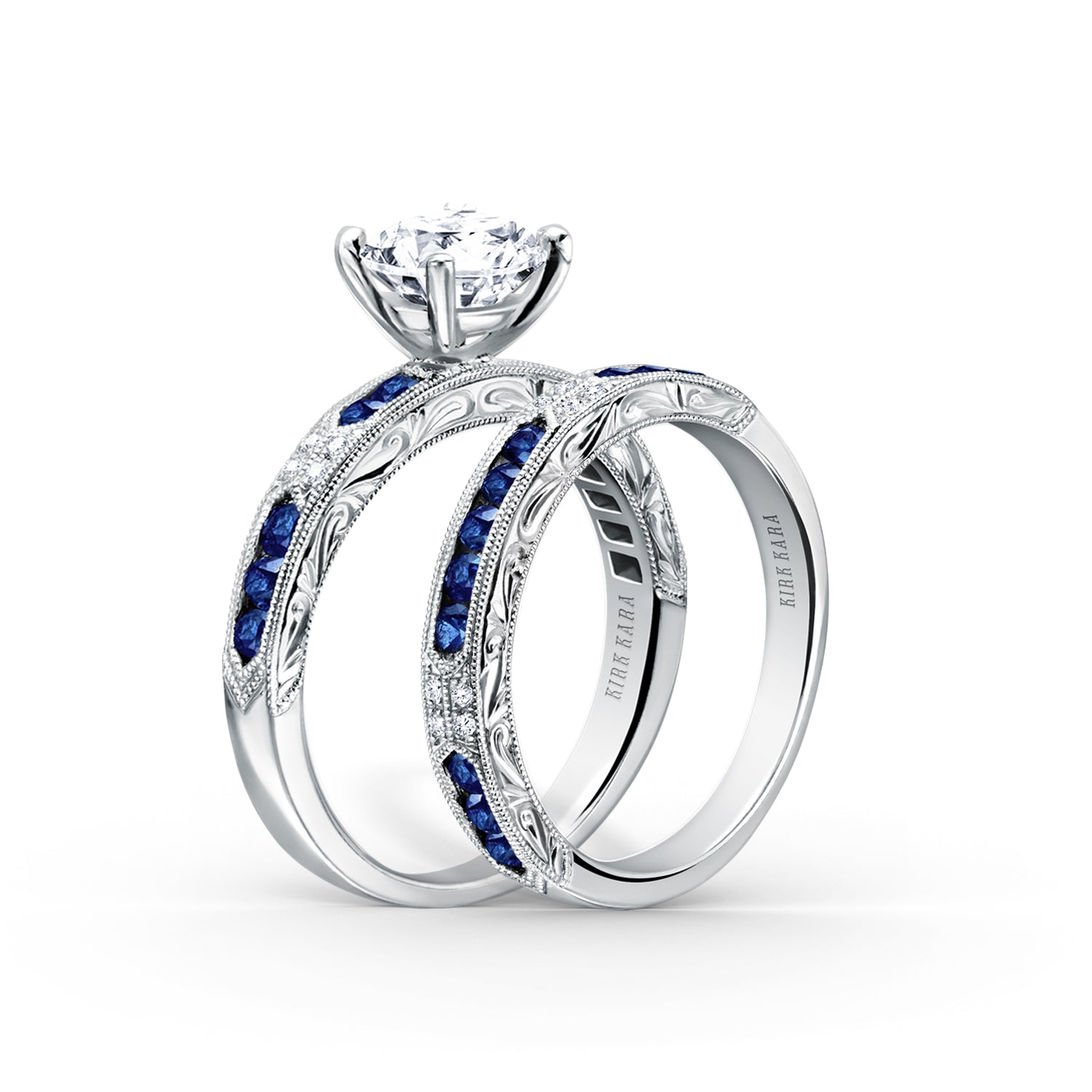 This deco inspired classic is an artistic design from the Charlotte collection. It features 0.03 ctw of diamonds and natural round blue sapphires. The signature handcrafted details include scroll hand engravings and milgrain edging.