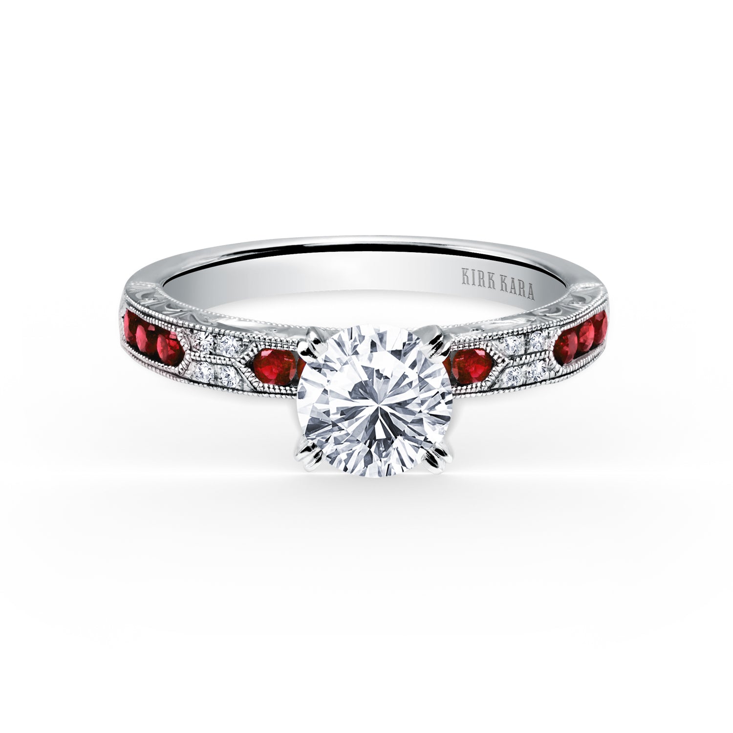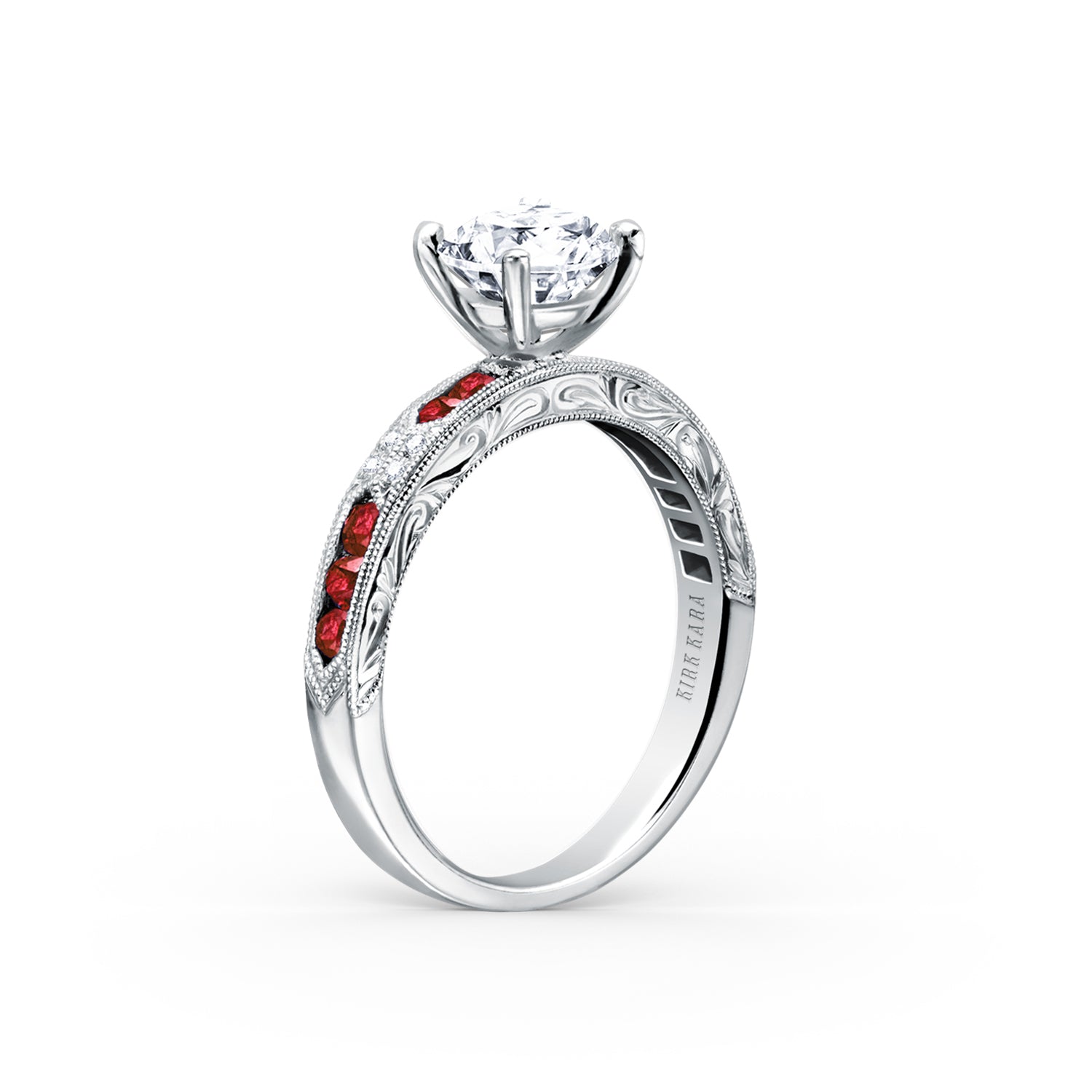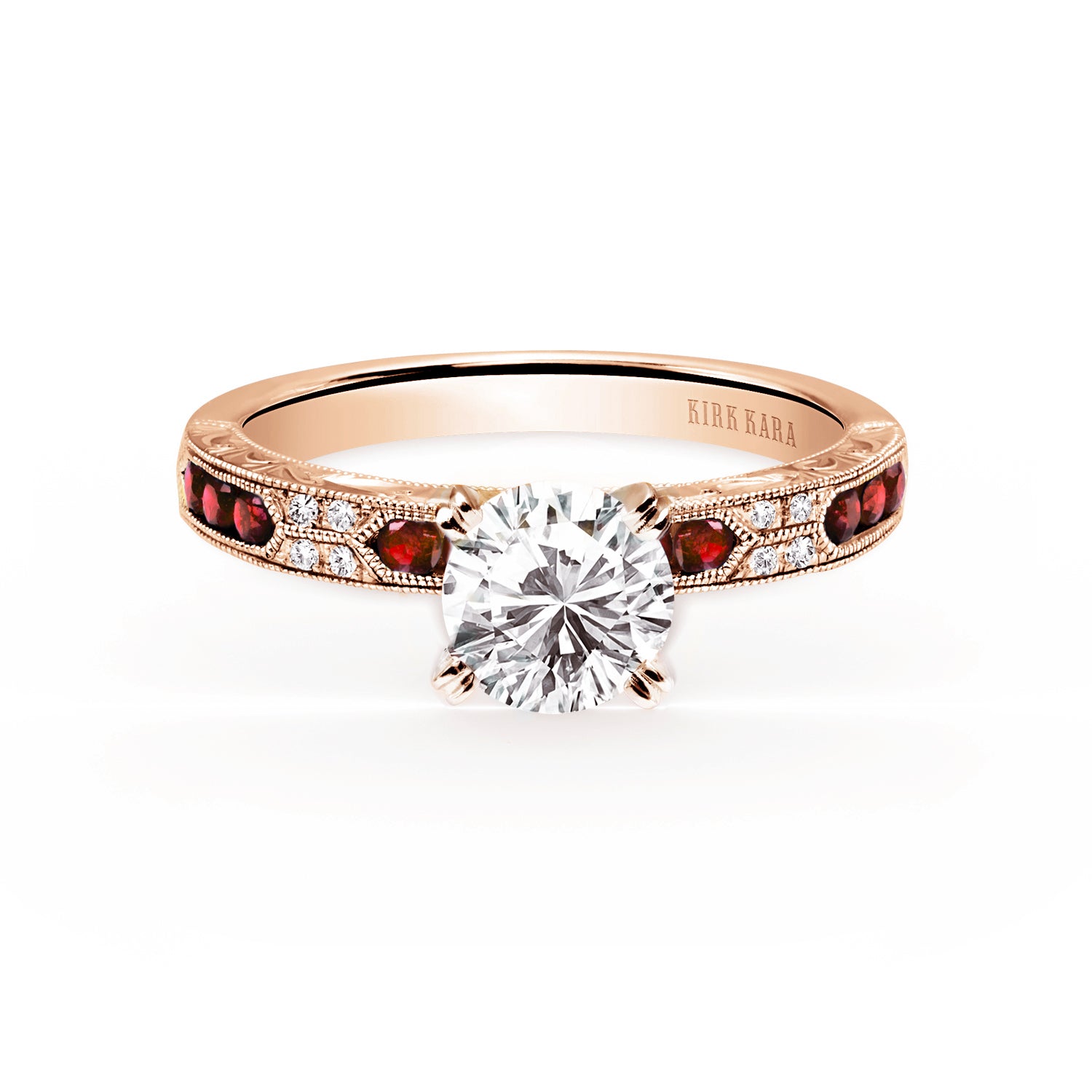 This deco inspired classic is an artistic design from the Charlotte collection. It features natural round rubies and 0.03 ctw of diamonds. The signature handcrafted details include scroll hand engravings and milgrain edging. Ring as shown fits a 1.00 carat round cut stone. All center stone sizes and shapes are possible.