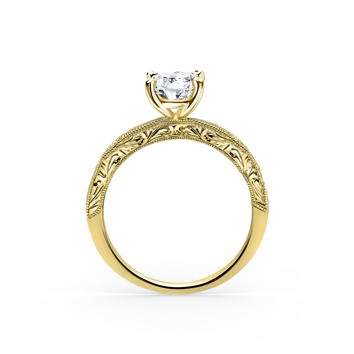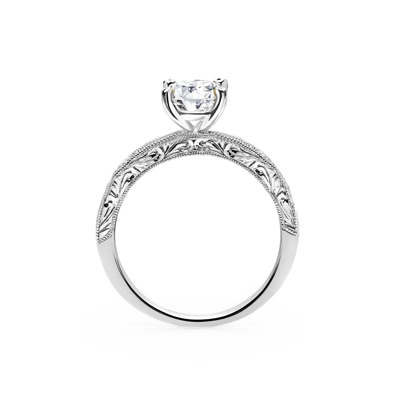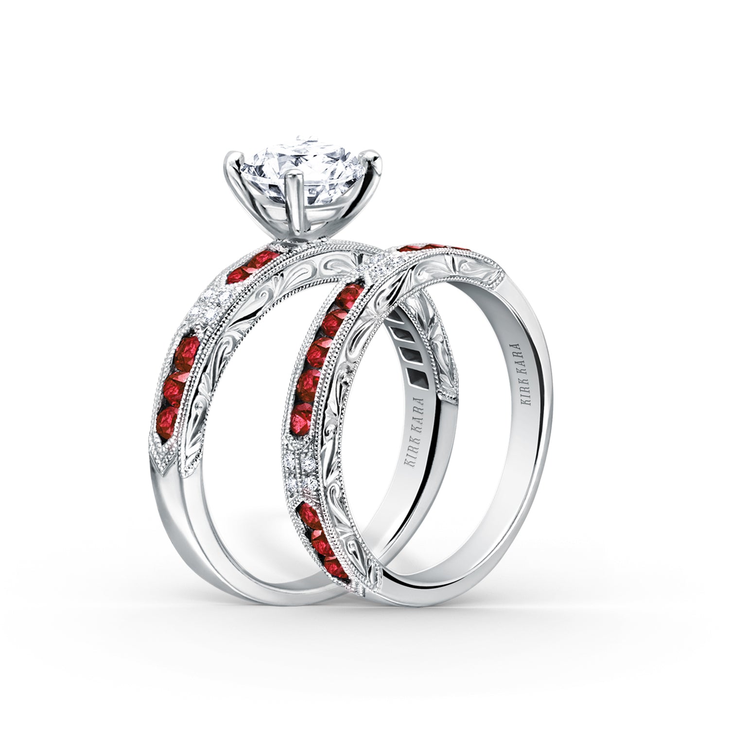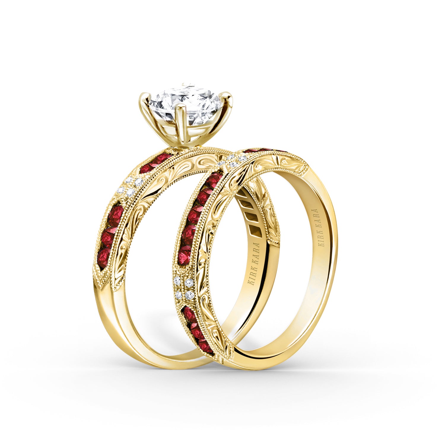This deco inspired classic is an artistic design from the Charlotte collection. It features natural round rubies and 0.03 ctw of diamonds. The signature handcrafted details include scroll hand engravings and milgrain edging. Ring as shown fits a 1.00 carat round cut stone. All center stone sizes and shapes are possible.