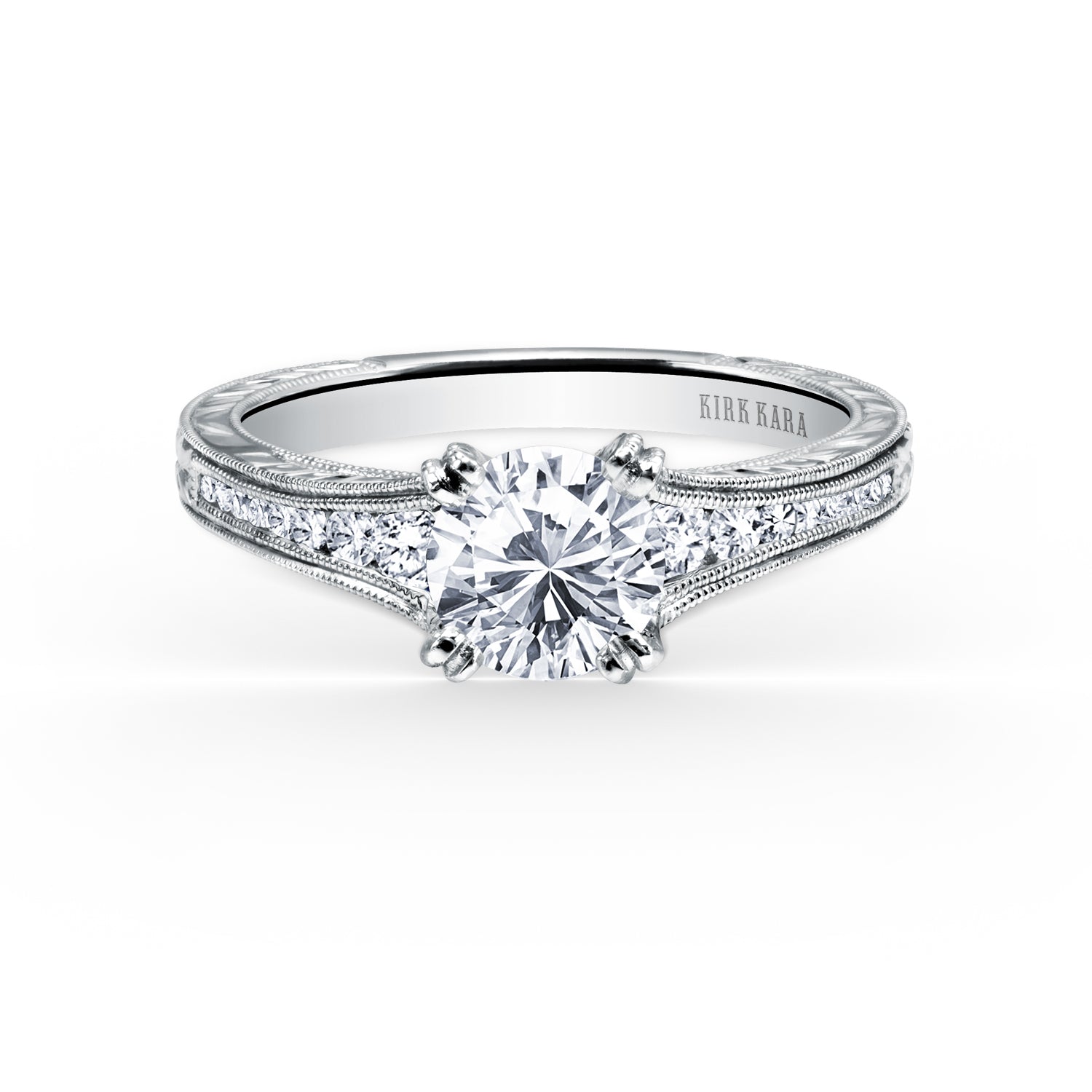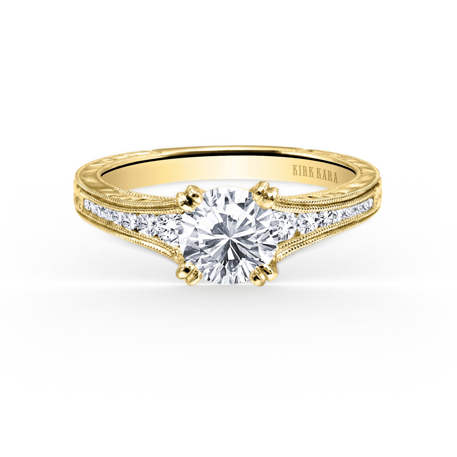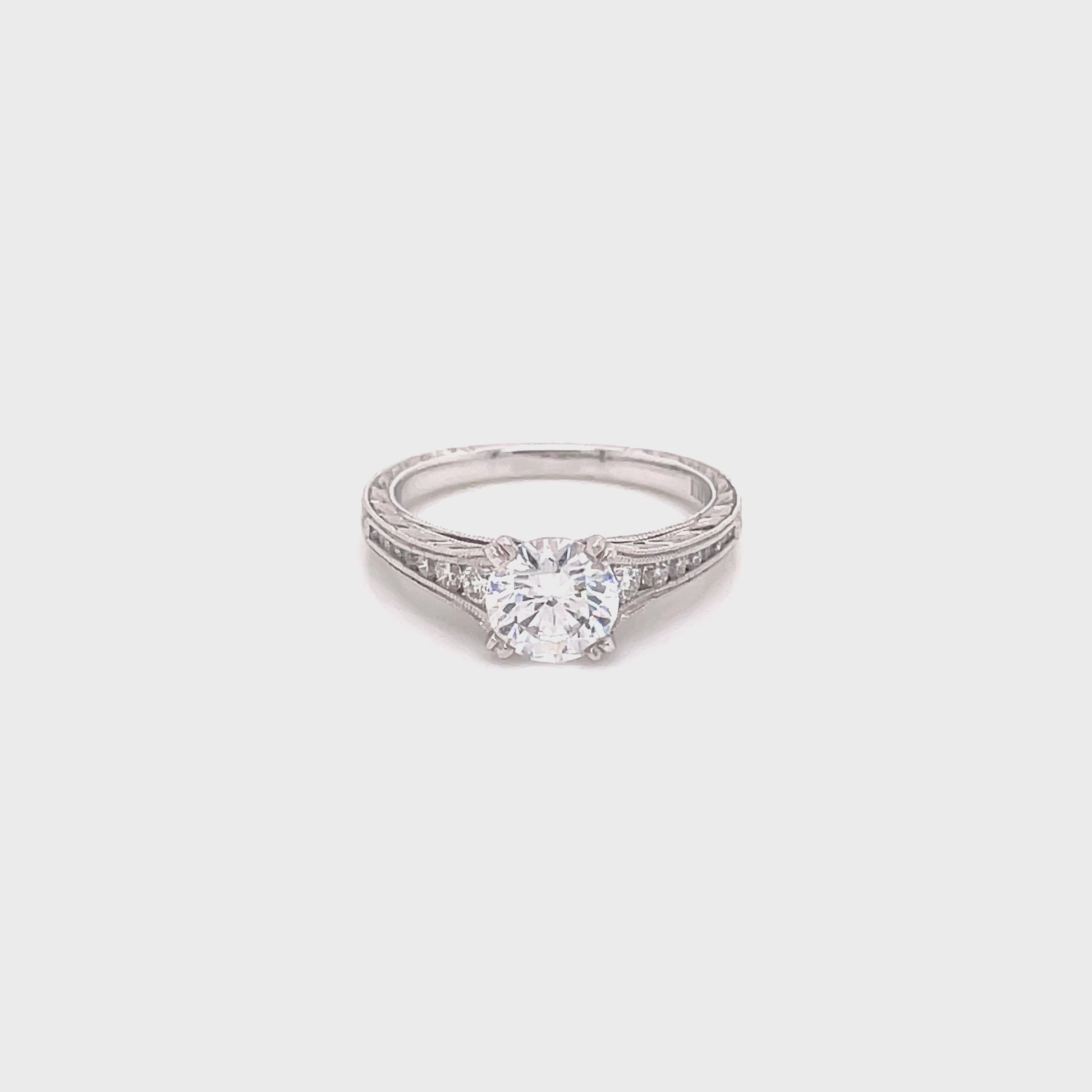 This timeless classic is a tapered engagement ring from the Stella collection. It features 1/4 ctw of diamonds. The signature handcrafted details include wheat hand engravings and milgrain edging. Both lab grown and natural diamonds are available for this setting. Ring as shown fits a 1.00 carat round cut stone. All center stone sizes and shapes are possible.