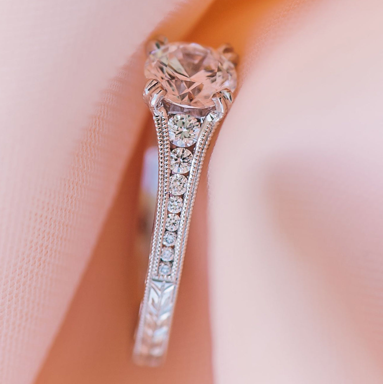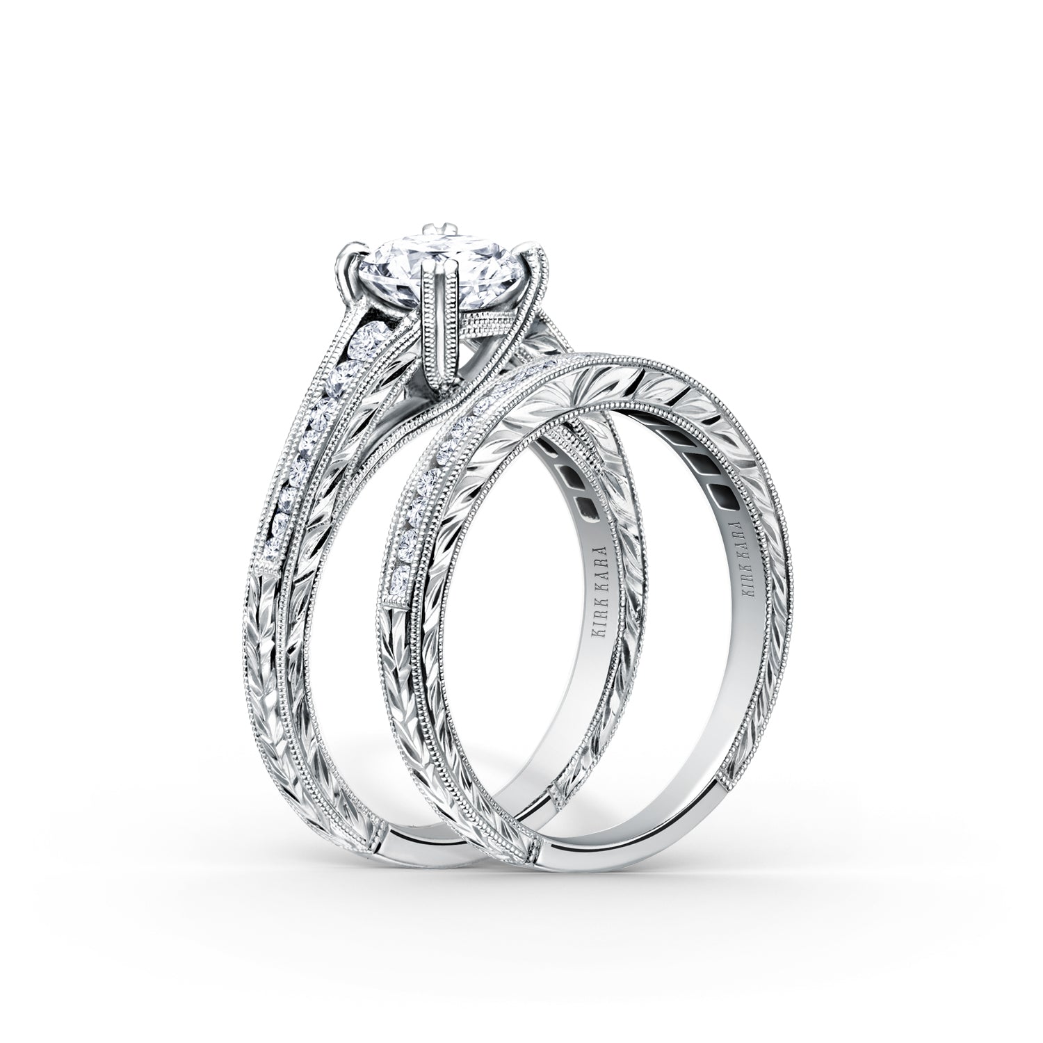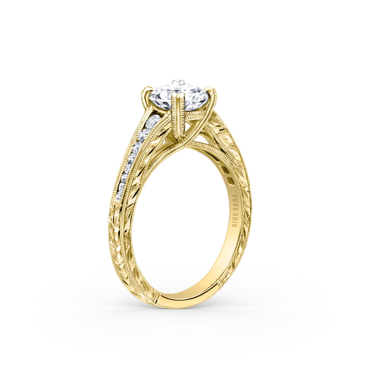 This timeless classic is a tapered engagement ring from the Stella collection. It features 1/4 ctw of diamonds. The signature handcrafted details include wheat hand engravings and milgrain edging. Both lab grown and natural diamonds are available for this setting. Ring as shown fits a 1.00 carat round cut stone. All center stone sizes and shapes are possible.