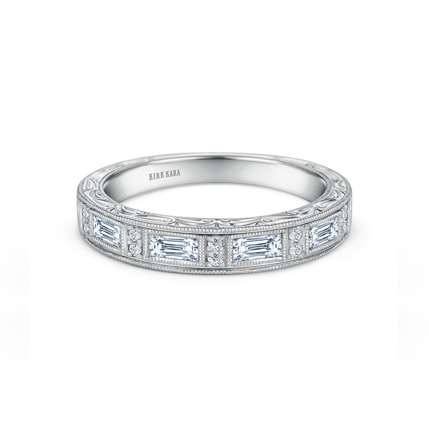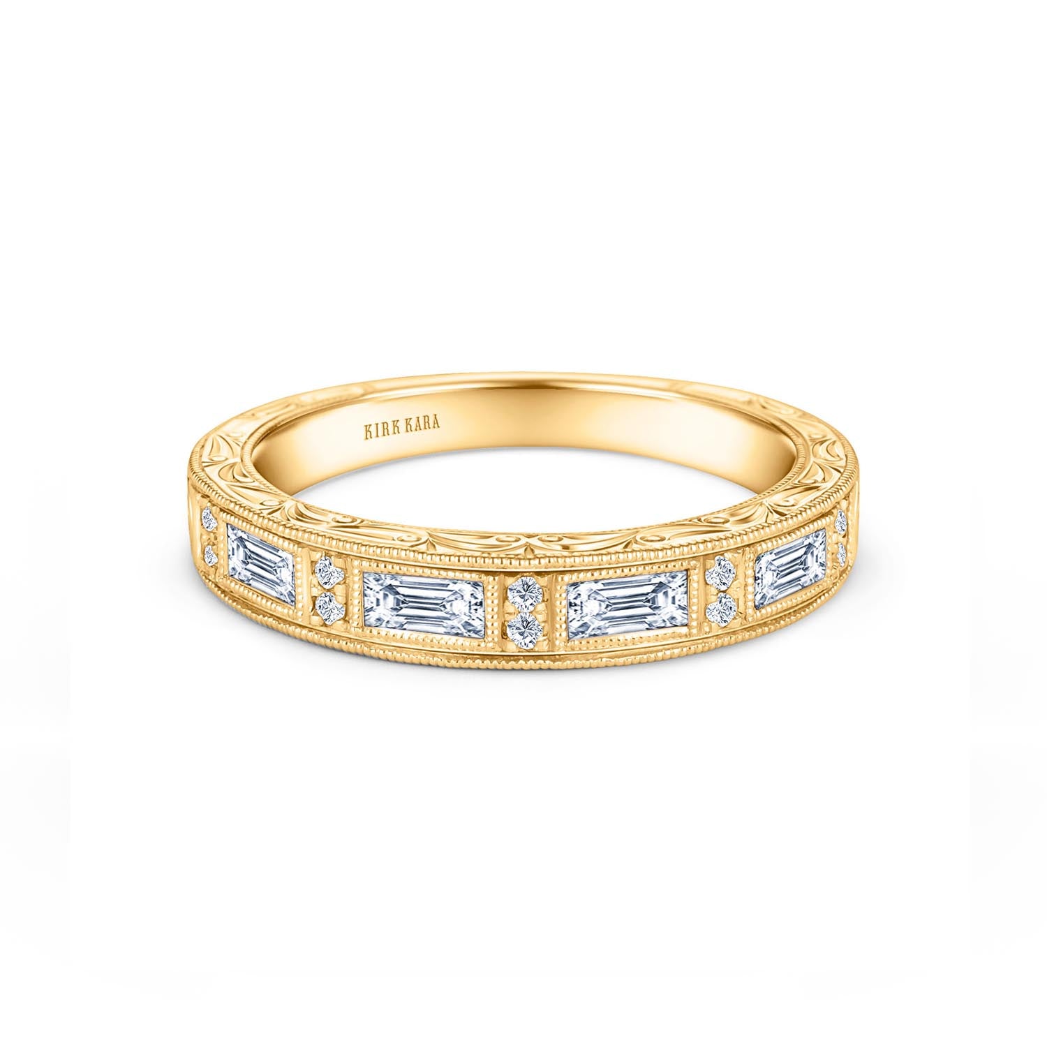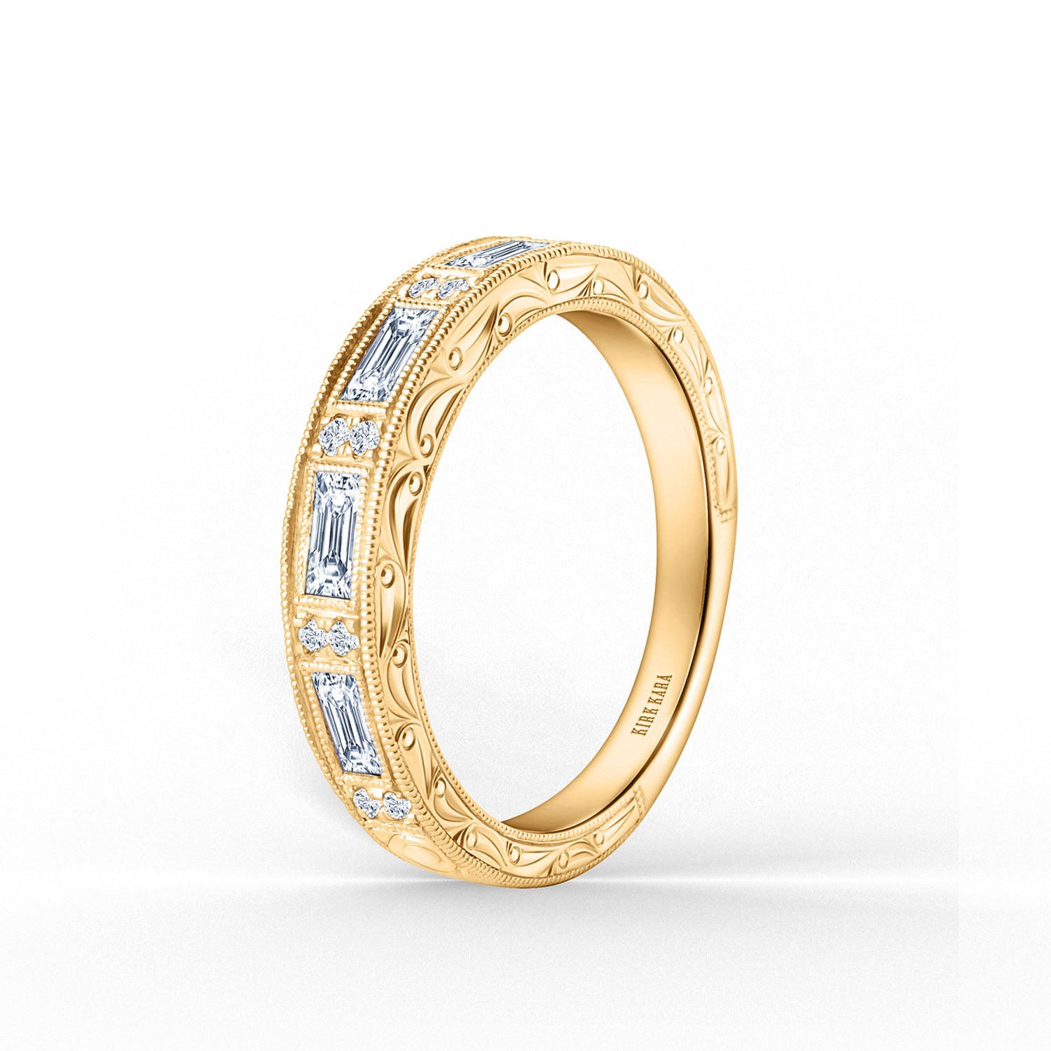 This deco inspired classic is an artistic design from the Charlotte collection. It features 1/2 ctw of diamonds. The signature handcrafted details include scroll hand engravings and milgrain edging. Both lab grown and natural diamonds are available for this band.