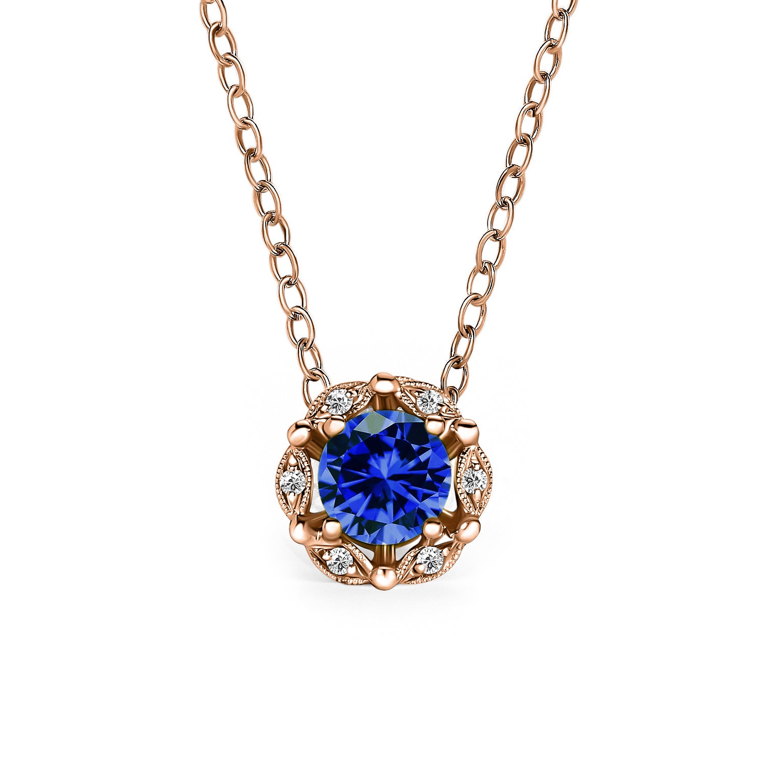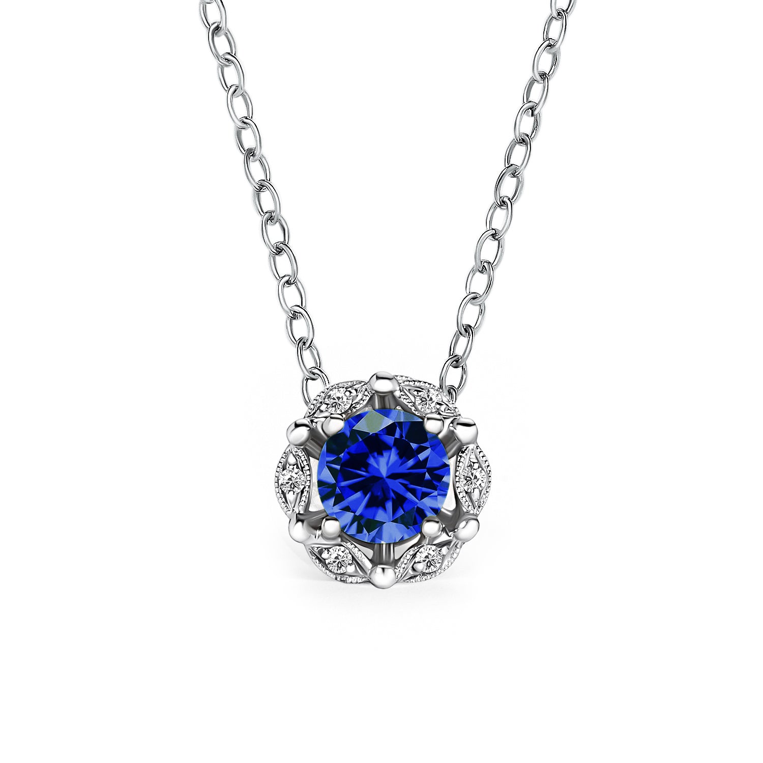 This nature inspired floral necklace feature 1/20 ctw of diamond accents. This necklace comes complete with a 6.00mm blue sapphire center, an 18-inch chain and finishing details include our handcrafted milgrain. Lab created or natural diamonds are available options for the accent stones.