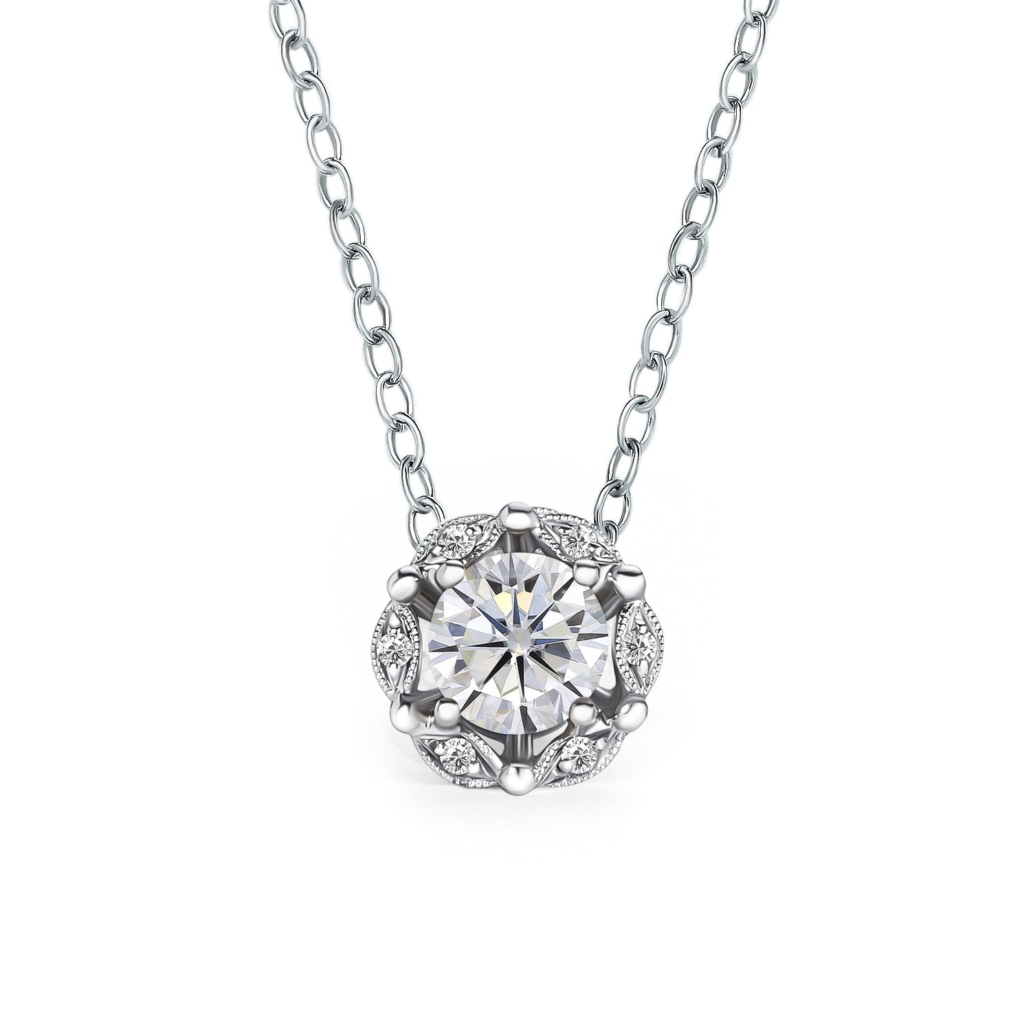 This nature inspired floral necklace feature 1/20 ctw of diamond accents. This necklace comes complete with a VS+ G+ 3/4 ctw lab grown center diamond, an 18-inch chain and finishing details include our handcrafted milgrain. Lab created or natural diamonds are available options for the accent stones.