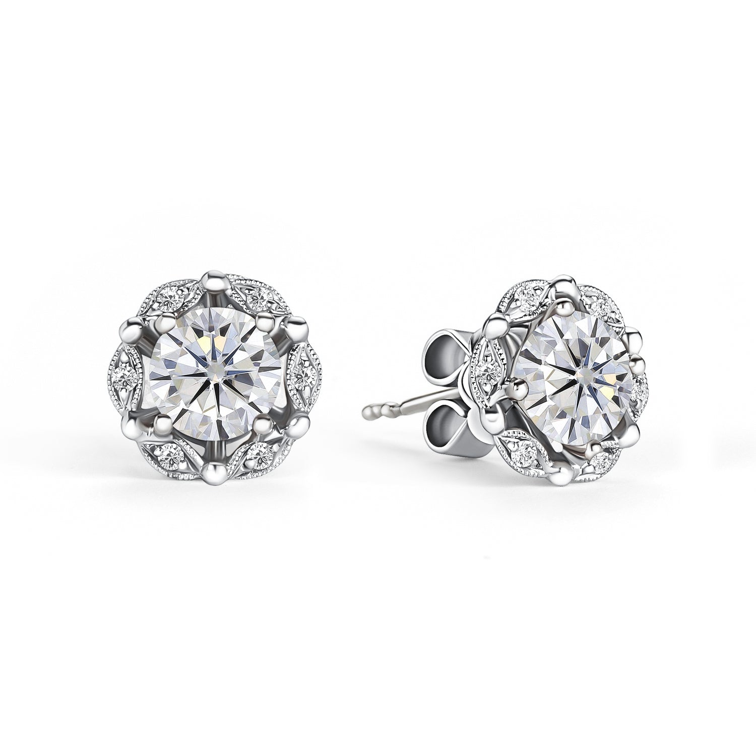 These nature inspired floral stud earrings feature 1/10 ctw of diamond accents. These earrings come complete with VS+ G+ 1 1/2 ctw (3/4 ctw each earring) lab grown diamond centers and finishing details include our handcrafted milgrain. Lab created or natural diamonds are available options for the accent stones.