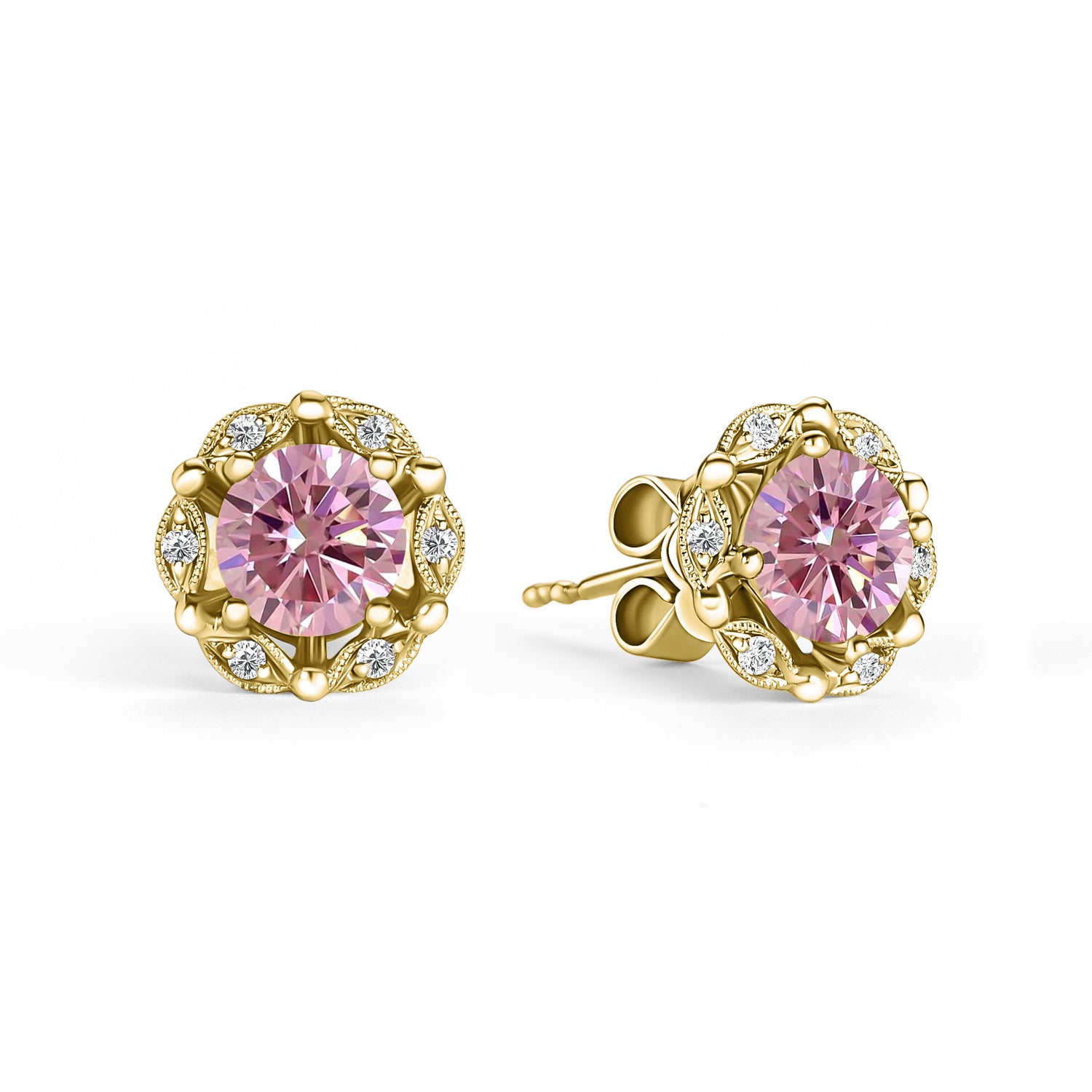 These nature inspired floral stud earrings feature 1/10 ctw of diamond accents. These earrings come complete with 6.00mm pink moissanite centers and finishing details include our handcrafted milgrain. Lab created or natural diamonds are available options for the accent stones.