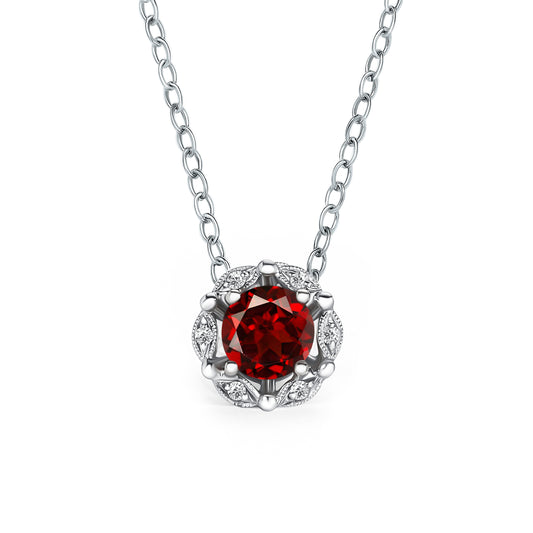 This nature inspired floral necklace feature 1/20 ctw of diamond accents. This necklace comes complete with a 6.00mm natural red garnet center, an 18-inch chain and finishing details include our handcrafted milgrain. Lab created or natural diamonds are available options for the accent stones.