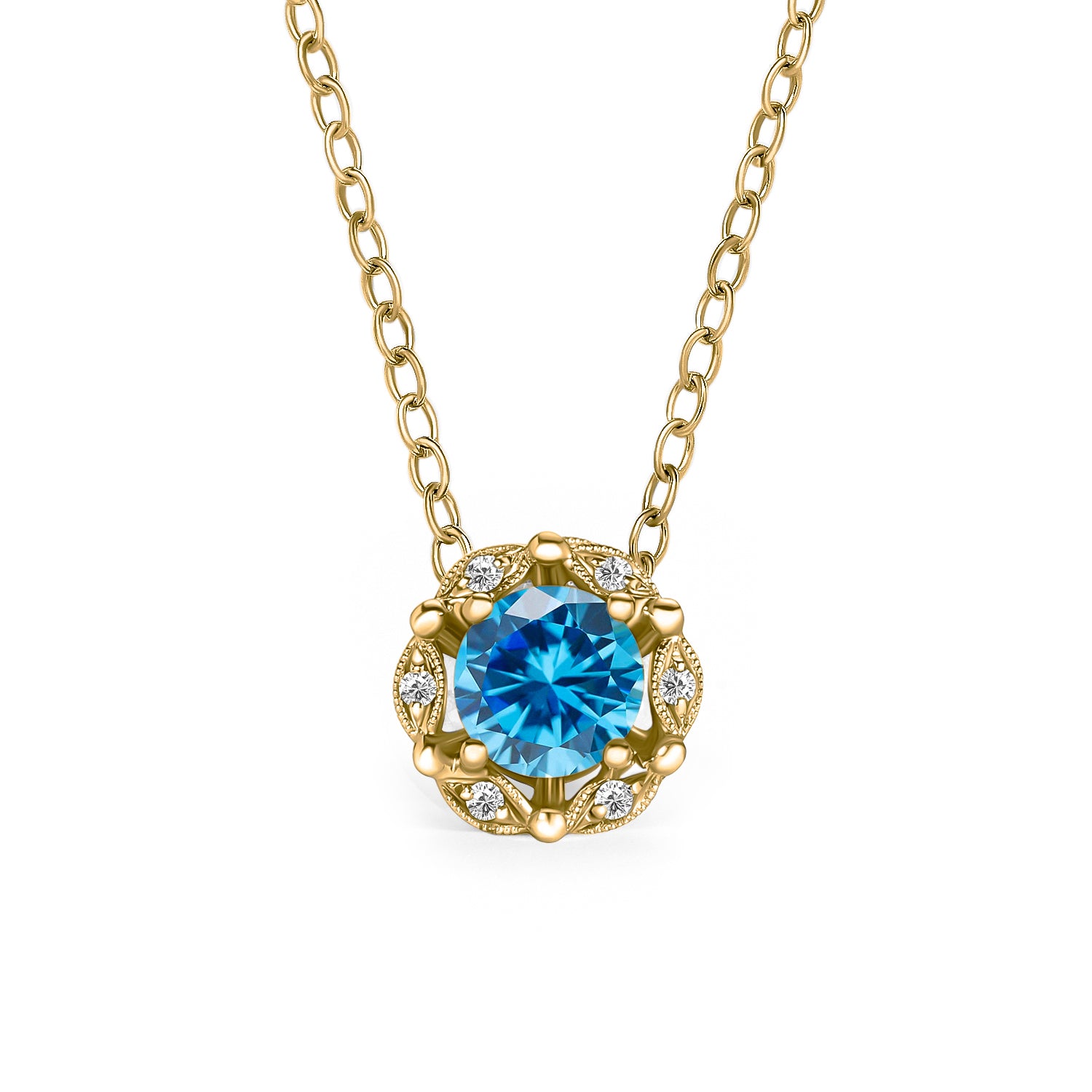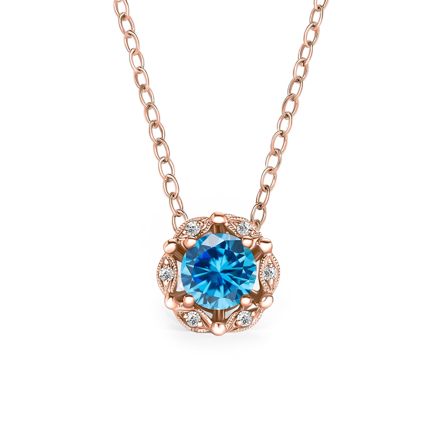 This nature inspired floral necklace feature 1/20 ctw of diamond accents. This necklace comes complete with a 6.00mm natural swiss blue topaz center, an 18-inch chain and finishing details include our handcrafted milgrain. Lab created or natural diamonds are available options for the accent stones.