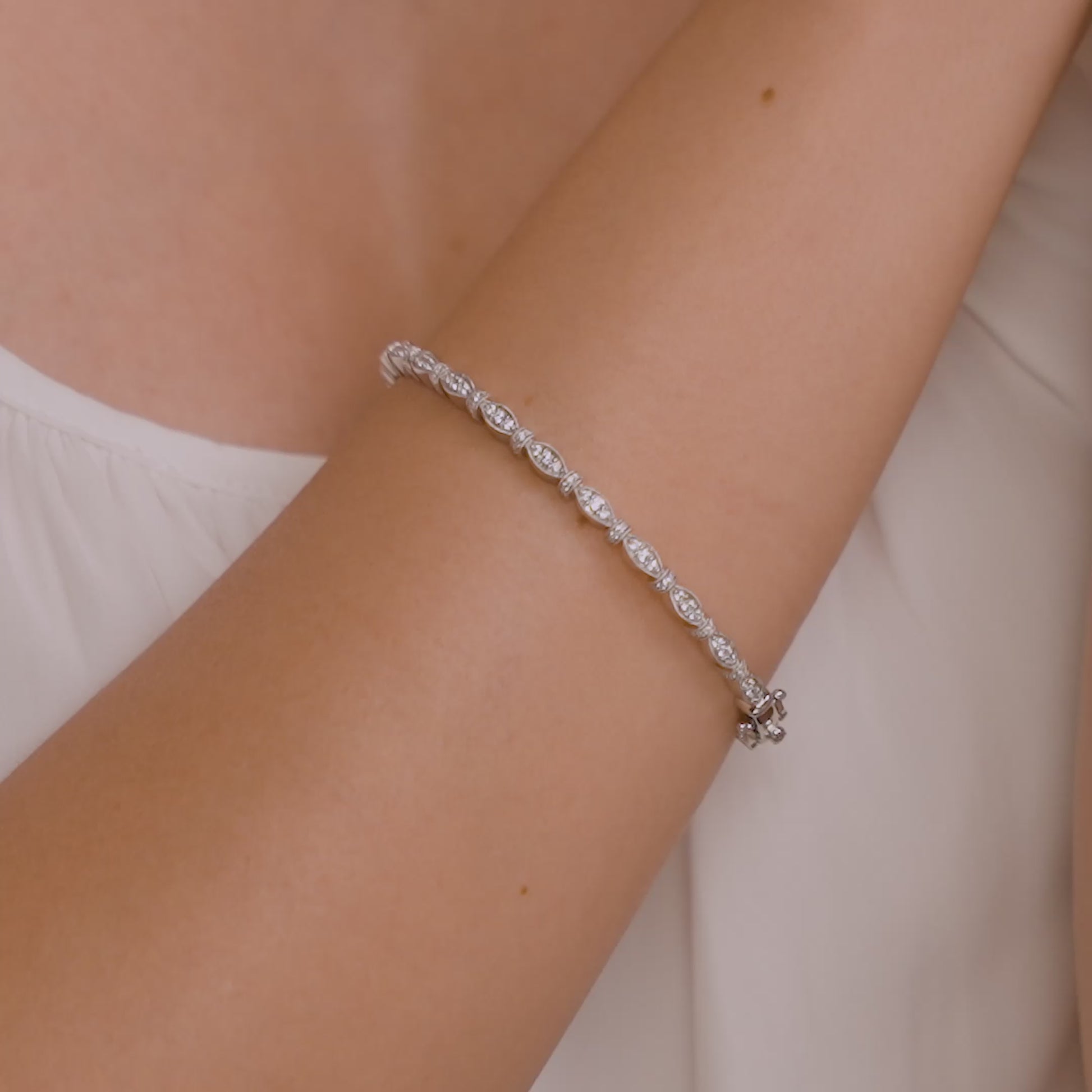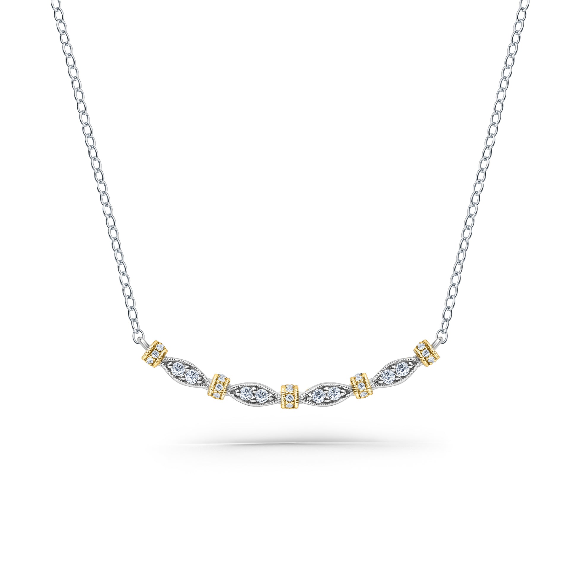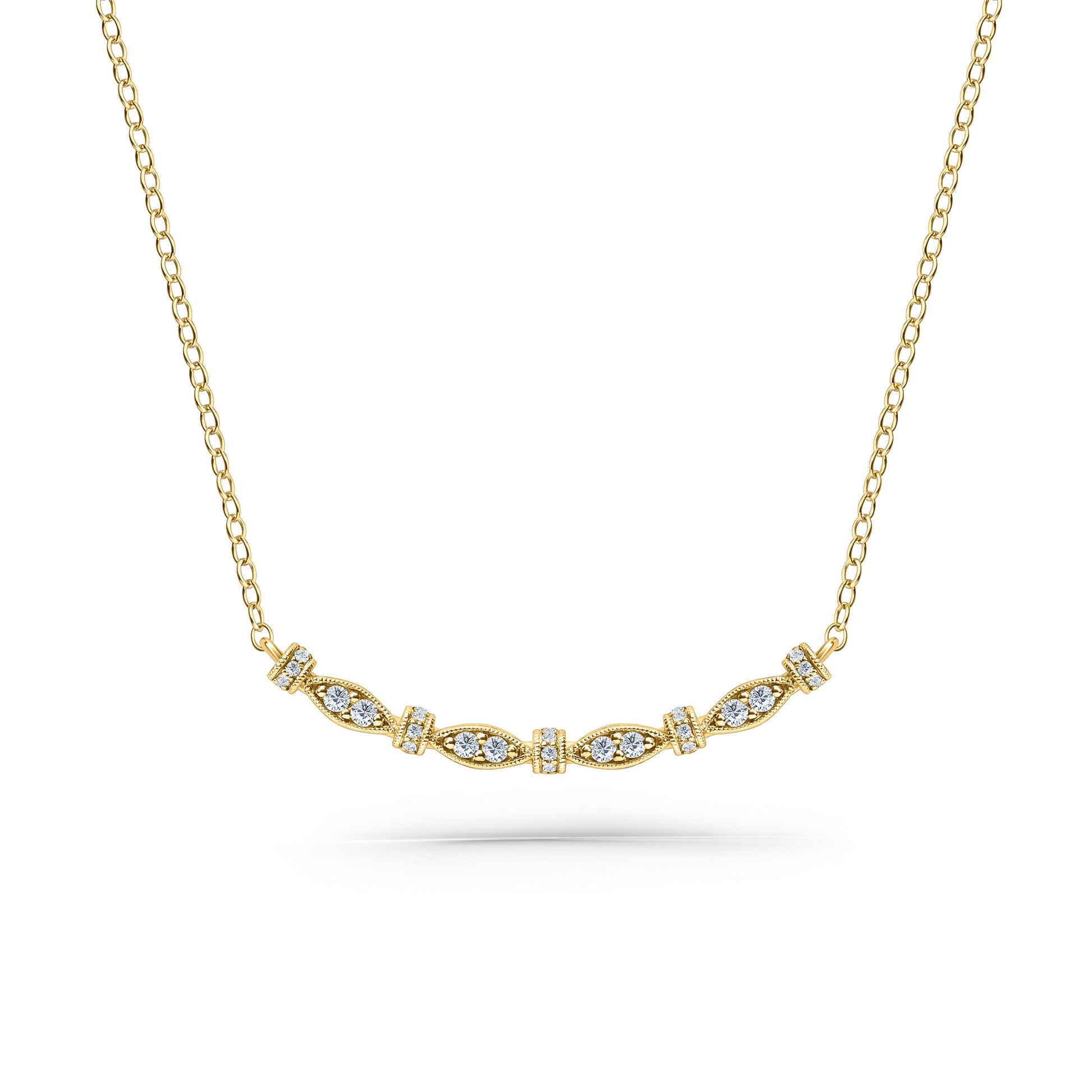 This timeless classic is a bar necklace is from the Dahlia collection. It features 1/6 ctw of diamonds and milgrain edging. Both lab grown and natural diamonds are available for this necklace. This necklace comes complete with an 18-inch chain.
