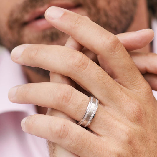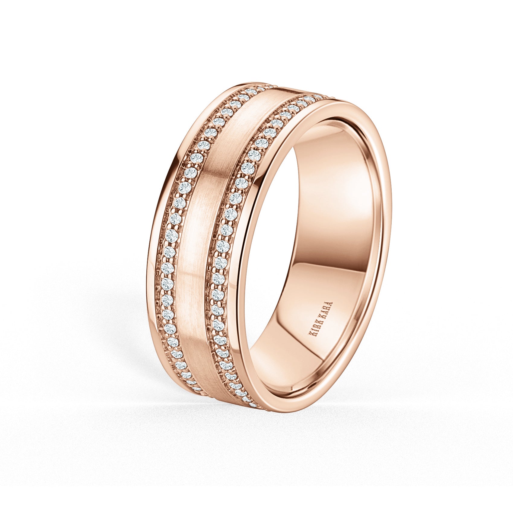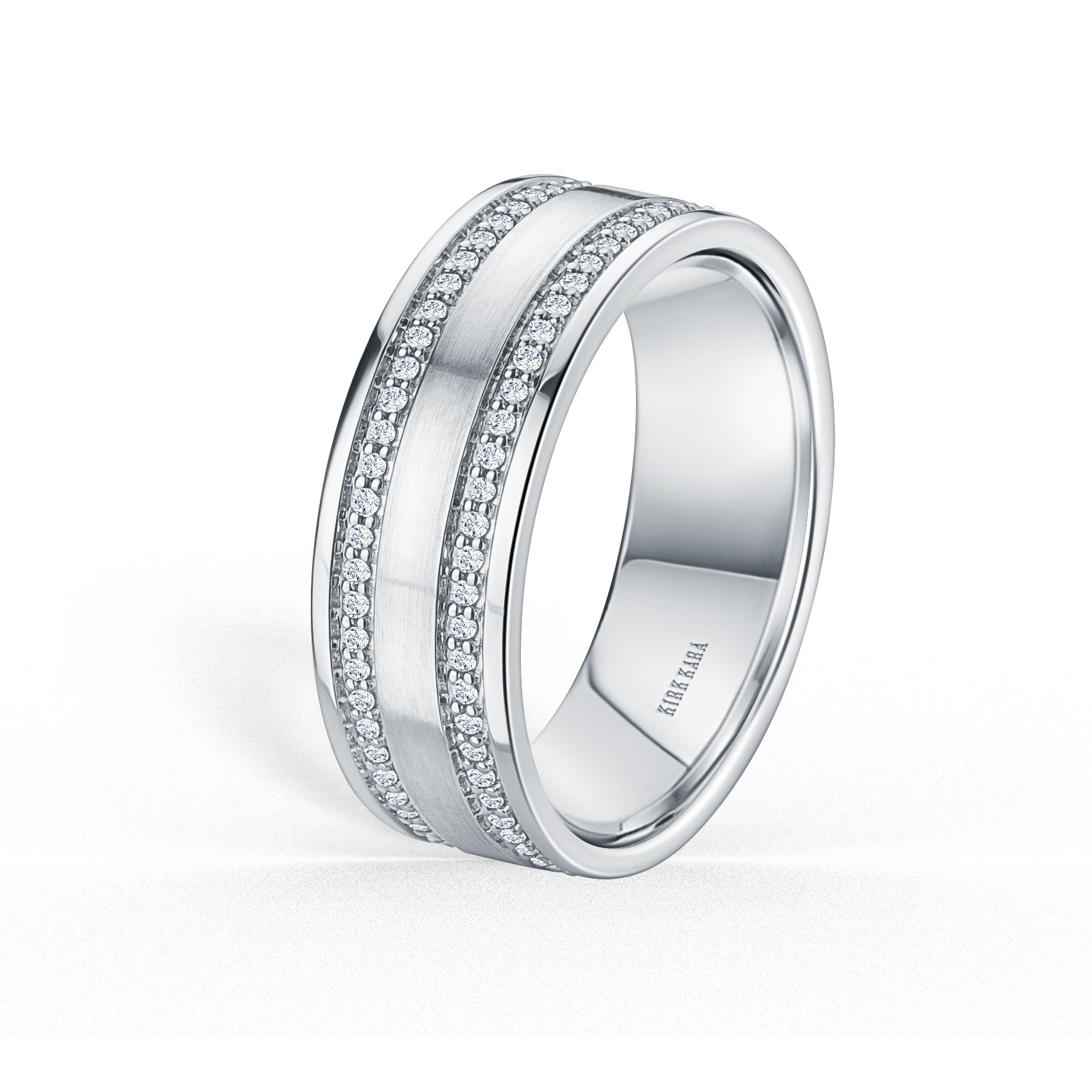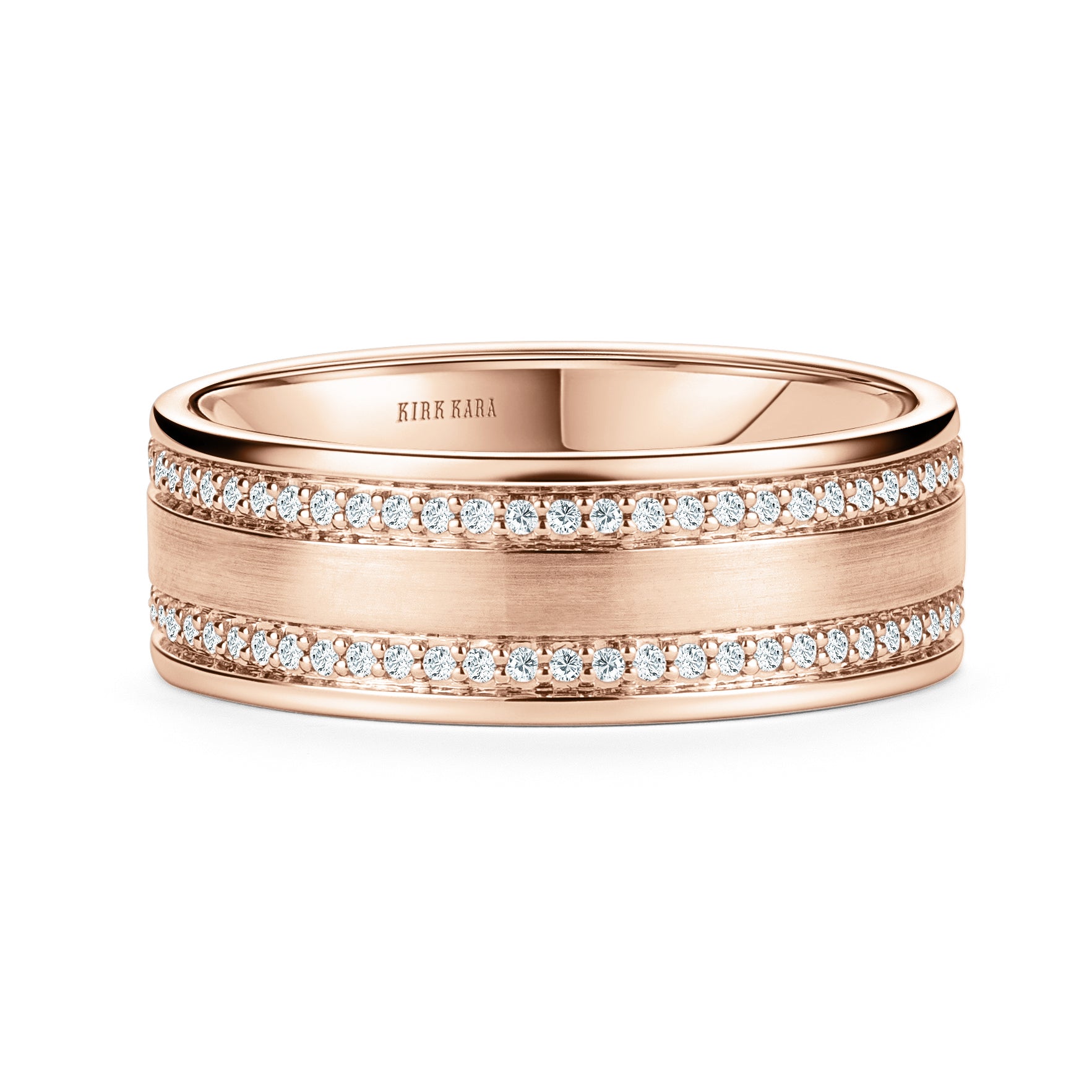 This comfort fit 7.5mm wedding band is from the Artin collection. The signature handcrafted details includes 1/2 ctw of diamonds full eternity and satin center finish. Both lab grown and natural diamonds are available for this band.