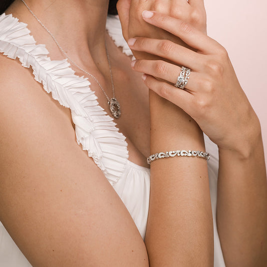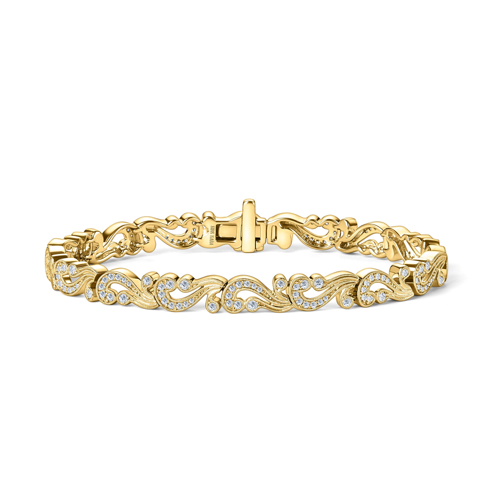 This whimsically chic, artistic design is a elegant diamond bracelet from the Angelique collection. It features 1 1/5 ctw of diamonds and signature handcrafted milgrain edging. Both lab grown and natural diamonds are available for this bracelet.