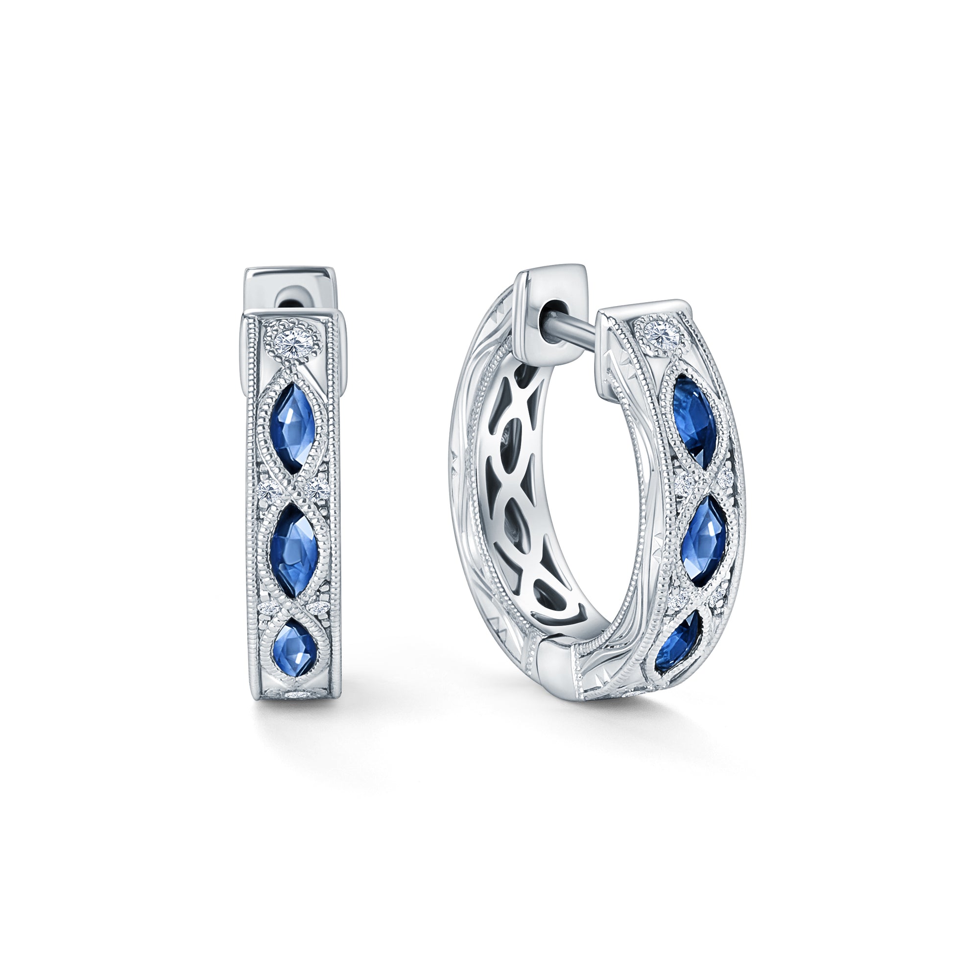 These nature-inspired hoop earrings are a floral detailed design from the Dahlia collection. They feature natural blue sapphire marquise and 1/15 ctw of diamonds. The signature handcrafted details include floral hand engravings and milgrain edging.