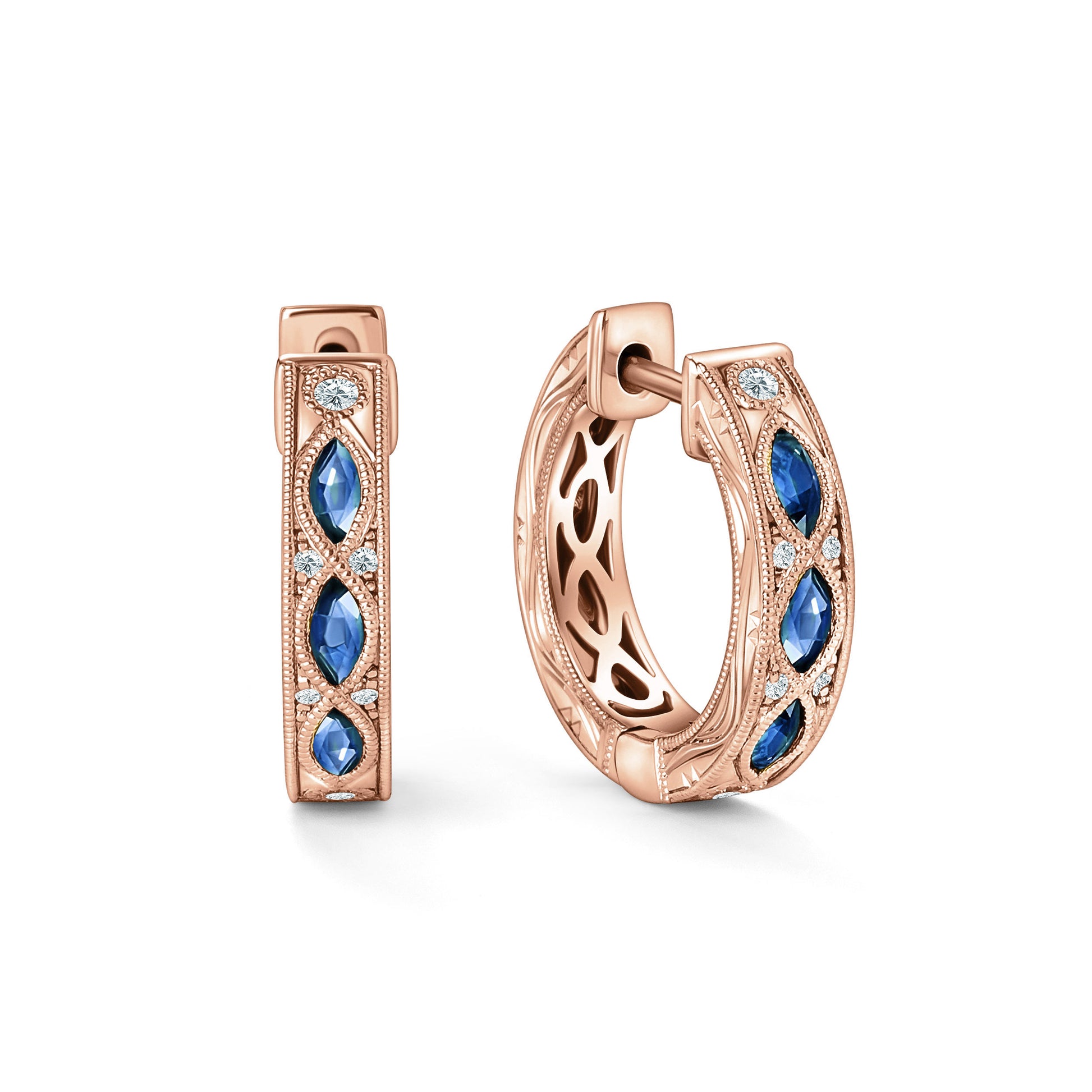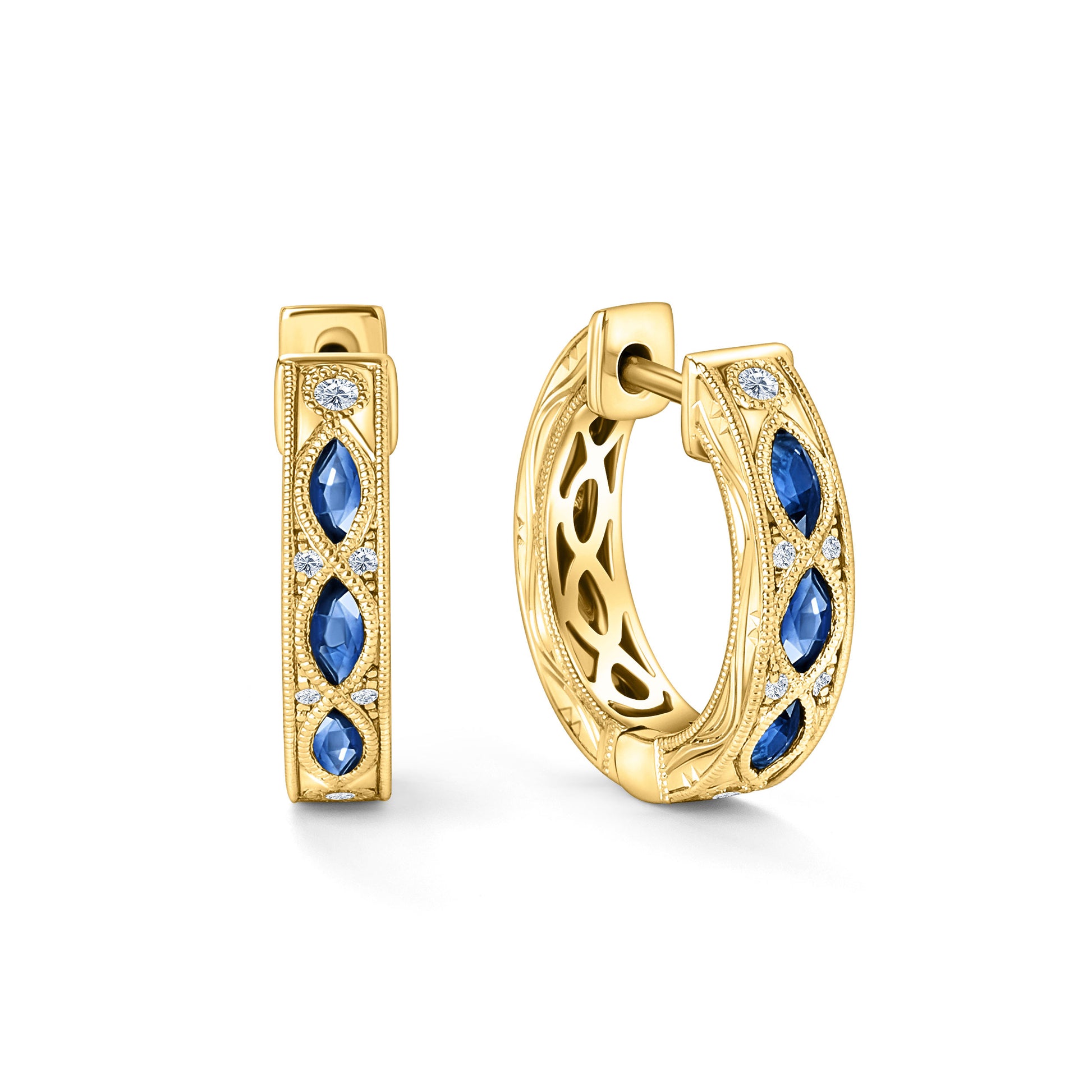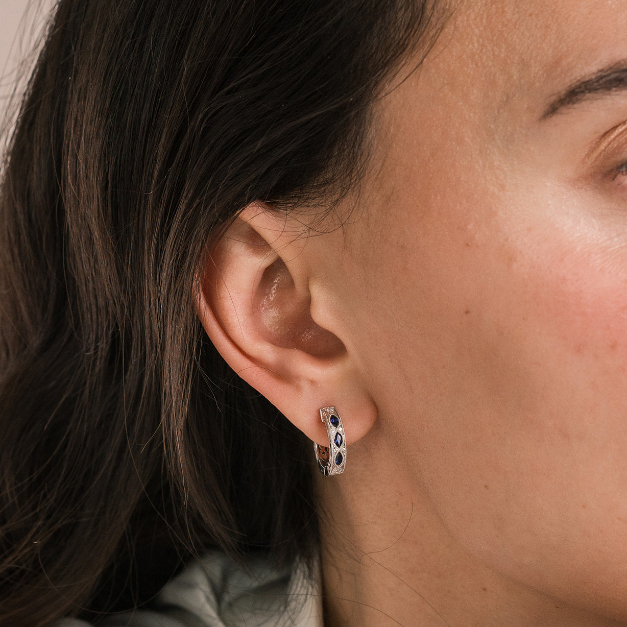 Engraved Blue Sapphire Floral Diamond Hoop Earrings