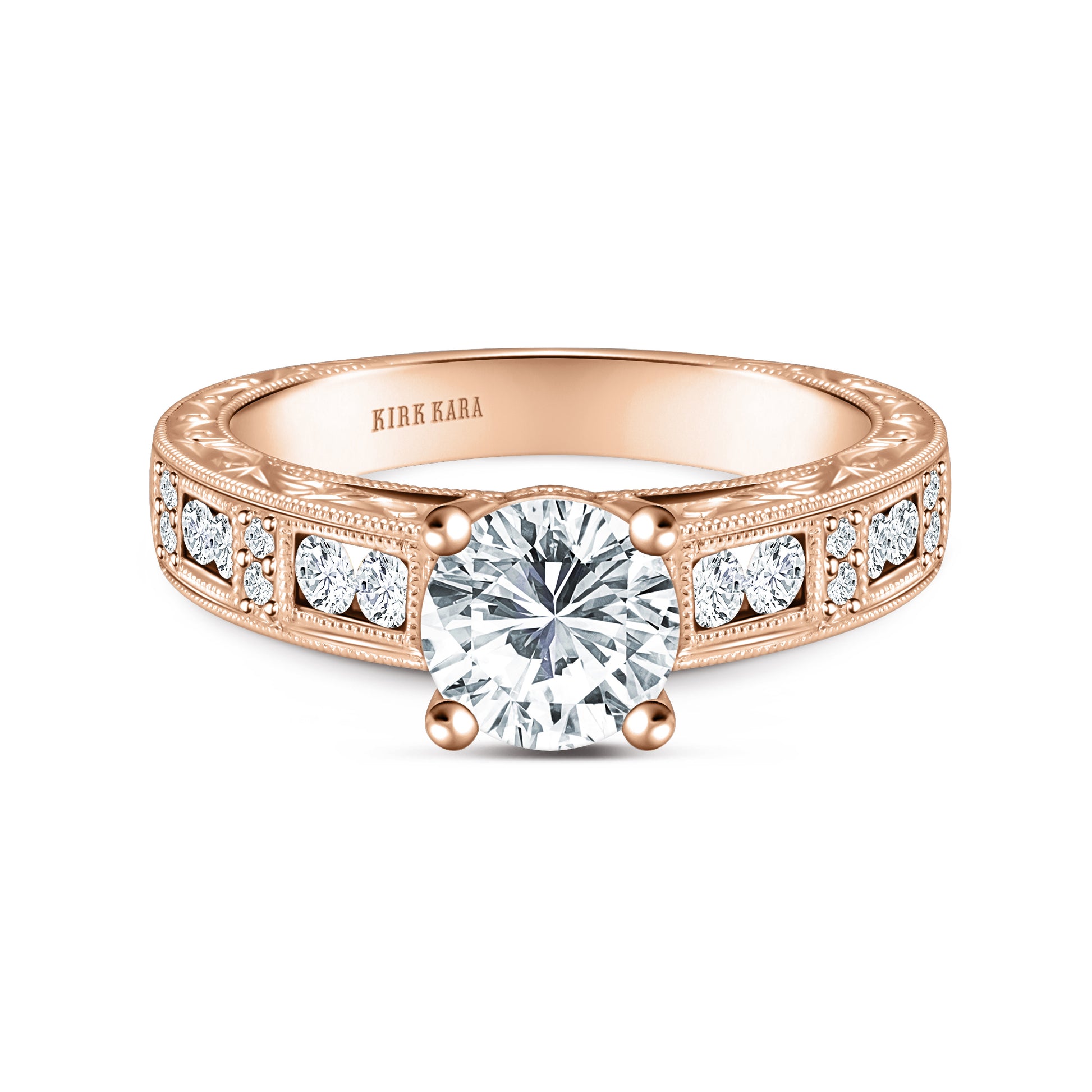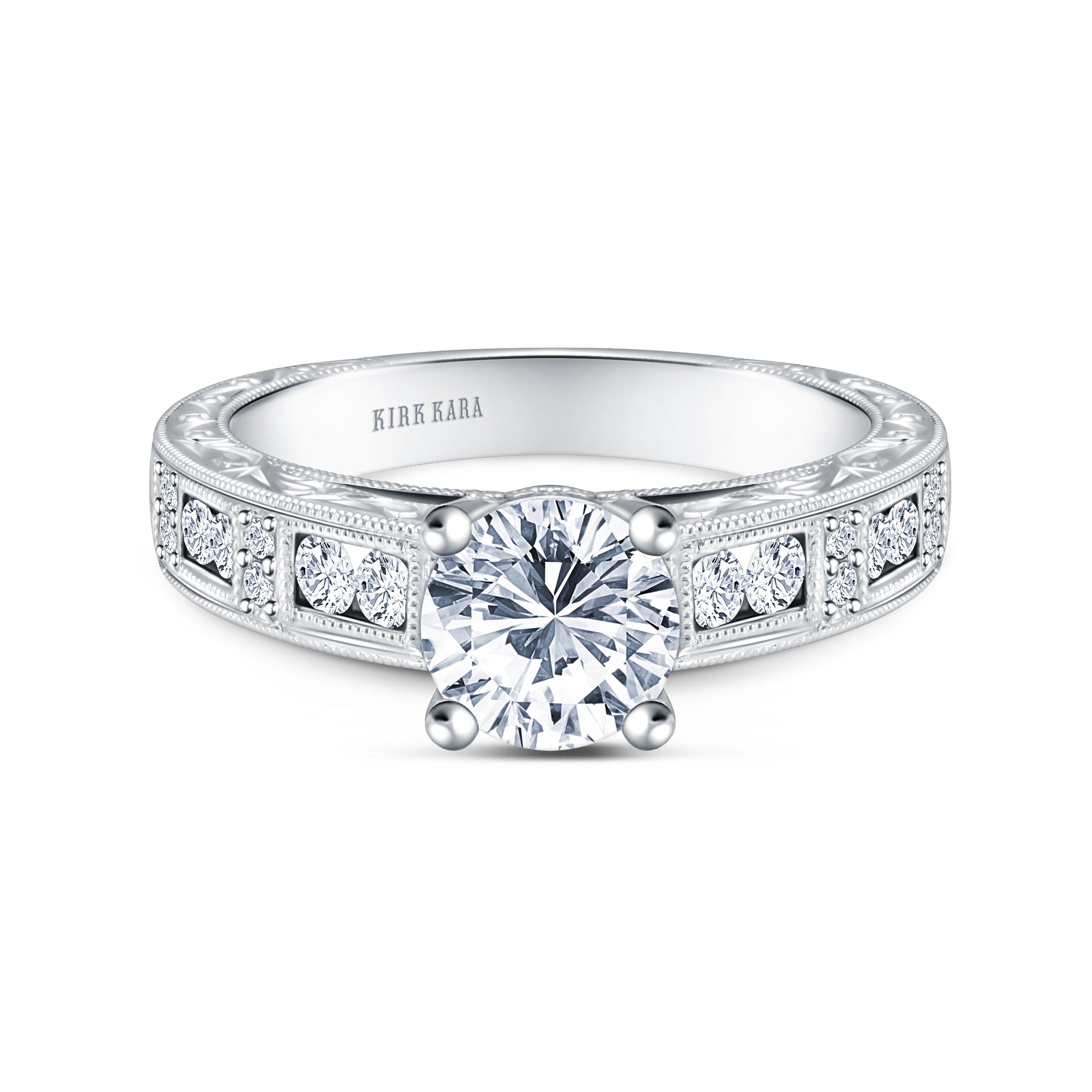 This deco inspired classic is an artistic design from the Charlotte collection. It features 3/8 ctw of diamonds. The signature handcrafted details include scroll hand engravings, peek-a-boo diamonds and milgrain edging. Both lab grown and natural diamonds are available for this setting. Ring as shown fits a 1.00 carat round cut stone. All center stone sizes and shapes are possible.