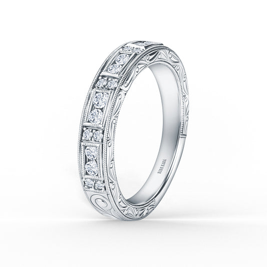 This deco inspired classic is an artistic design from the Charlotte collection. It features 1/3 ctw of diamonds. Both lab grown and natural diamonds are available for this band. The signature handcrafted details include scroll hand engravings and milgrain edging.
