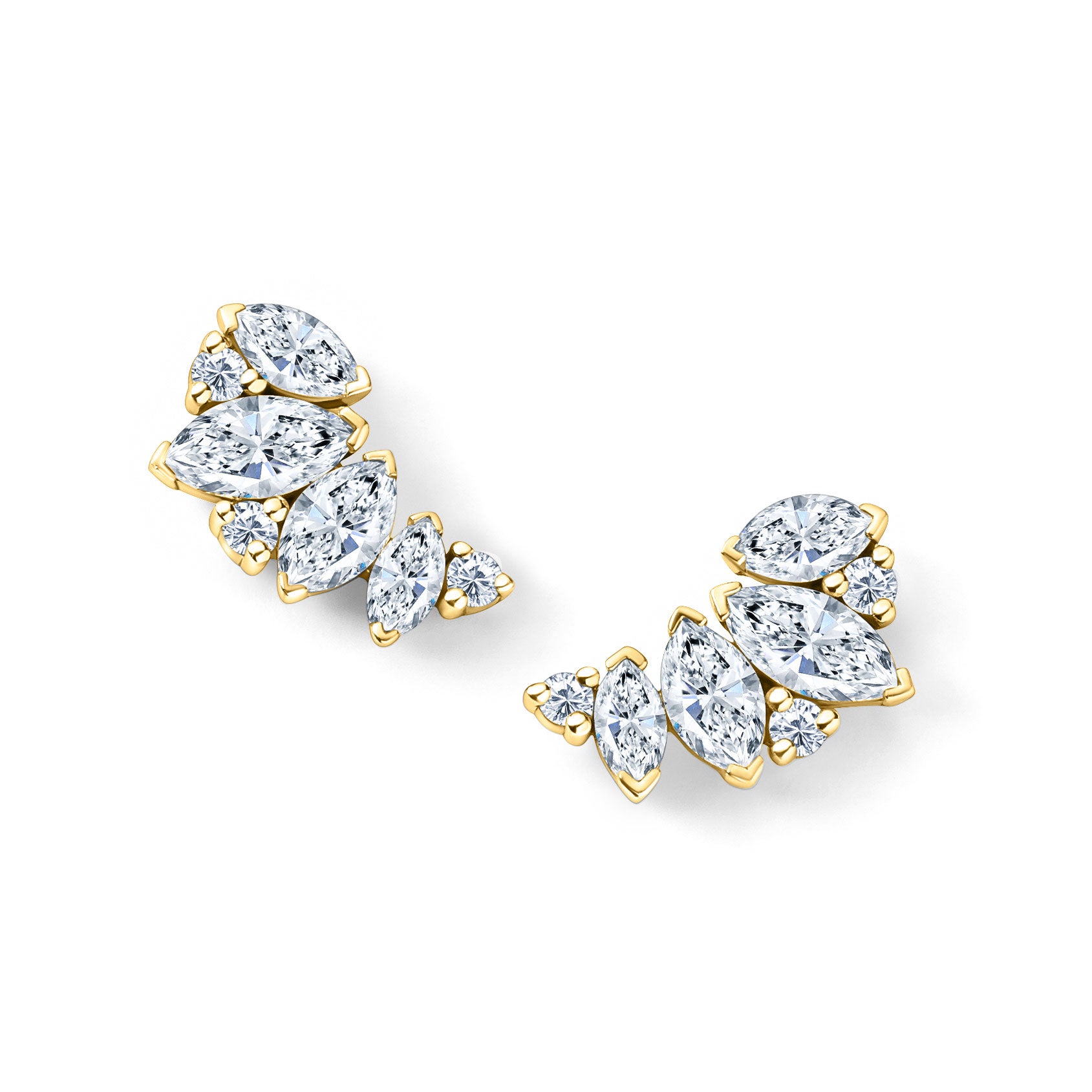 These deco inspired cluster crawler earrings are from the Charlotte collection. They feature 1 1/5 ctw of marquise and round diamonds. Both lab grown and natural diamonds are available for these earrings.