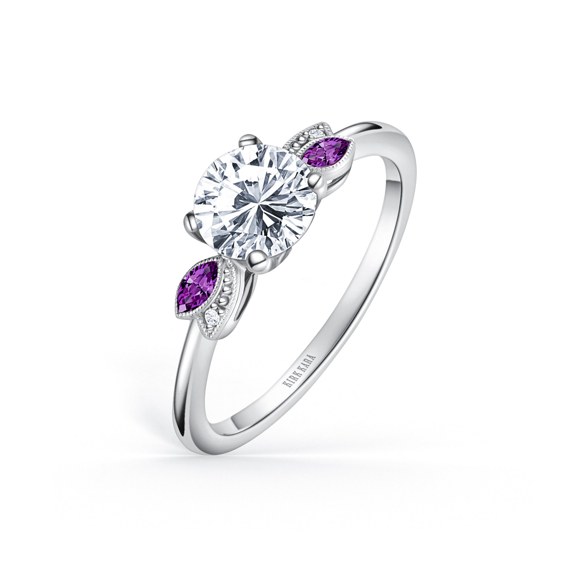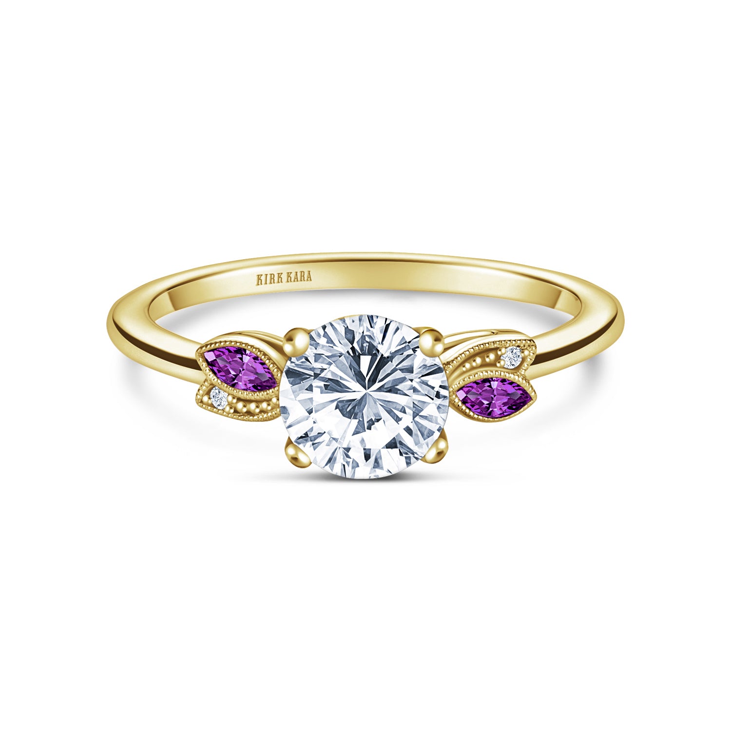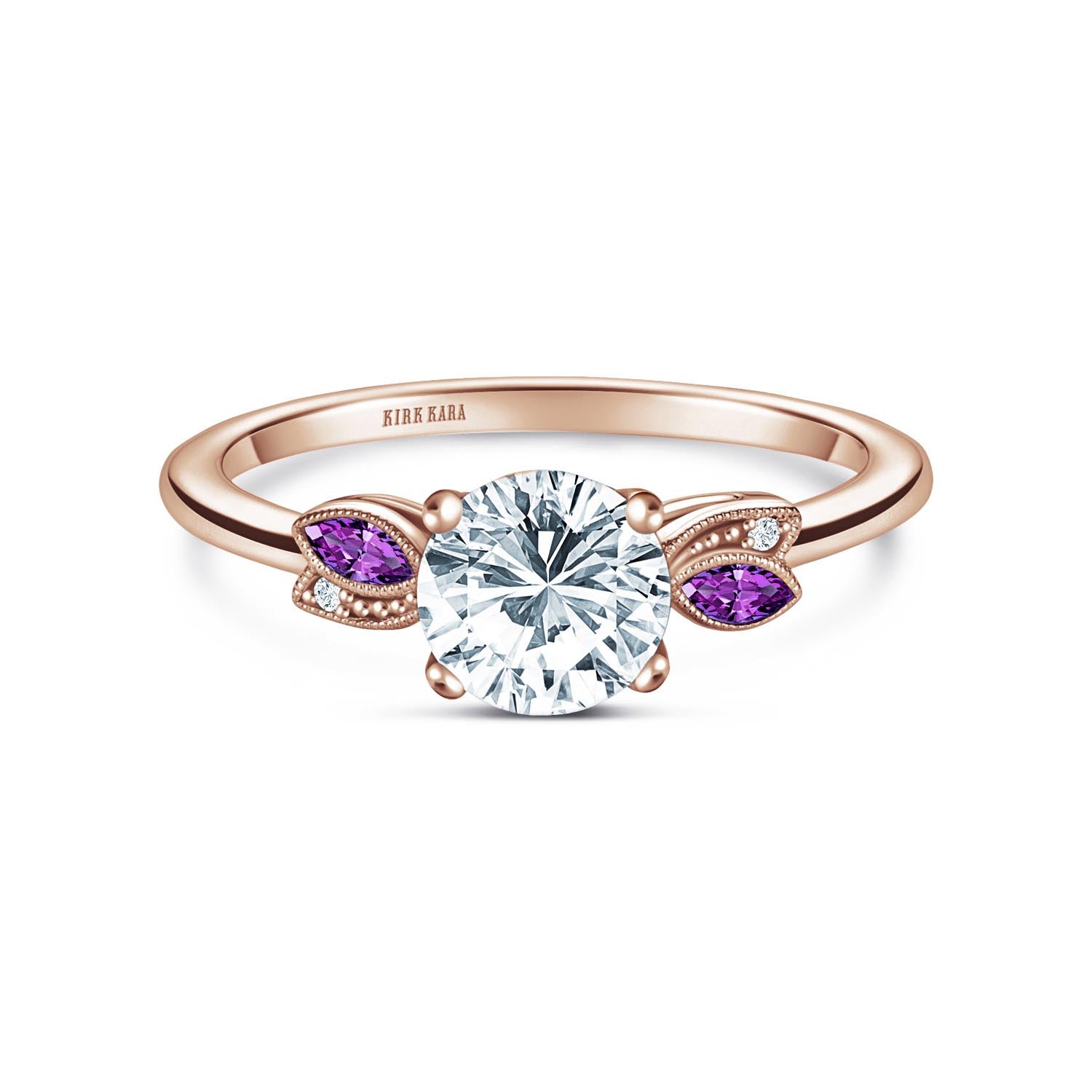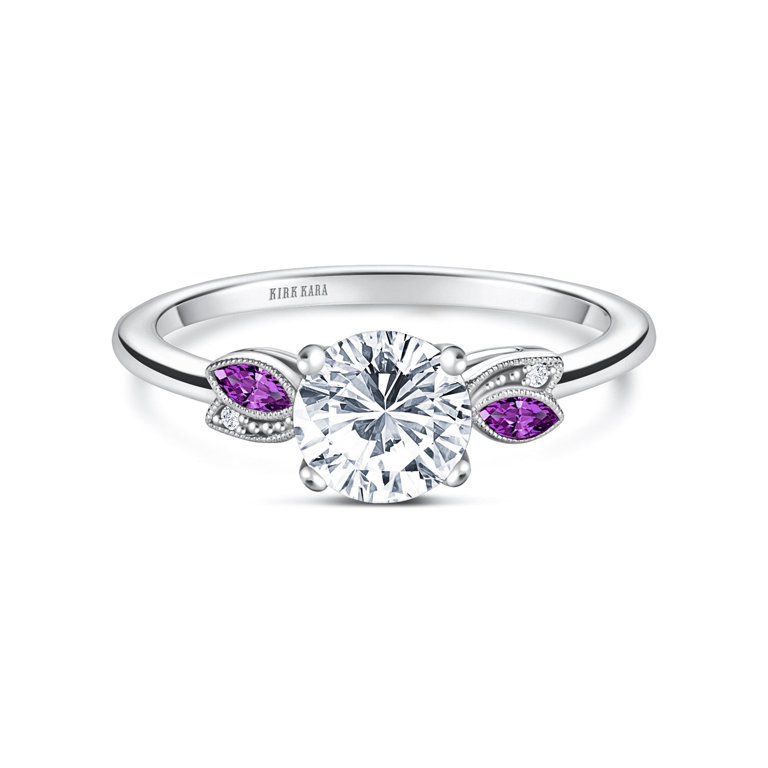 This nature-inspired design with leaf motif details is from the Dahlia collection. It features 0.02 ctw of diamonds and natural amethysts. The signature handcrafted details include peek-a-boo diamonds and milgrain. Ring as shown fits a 1.00 carat round cut stone. All center stone sizes and shapes are possible.