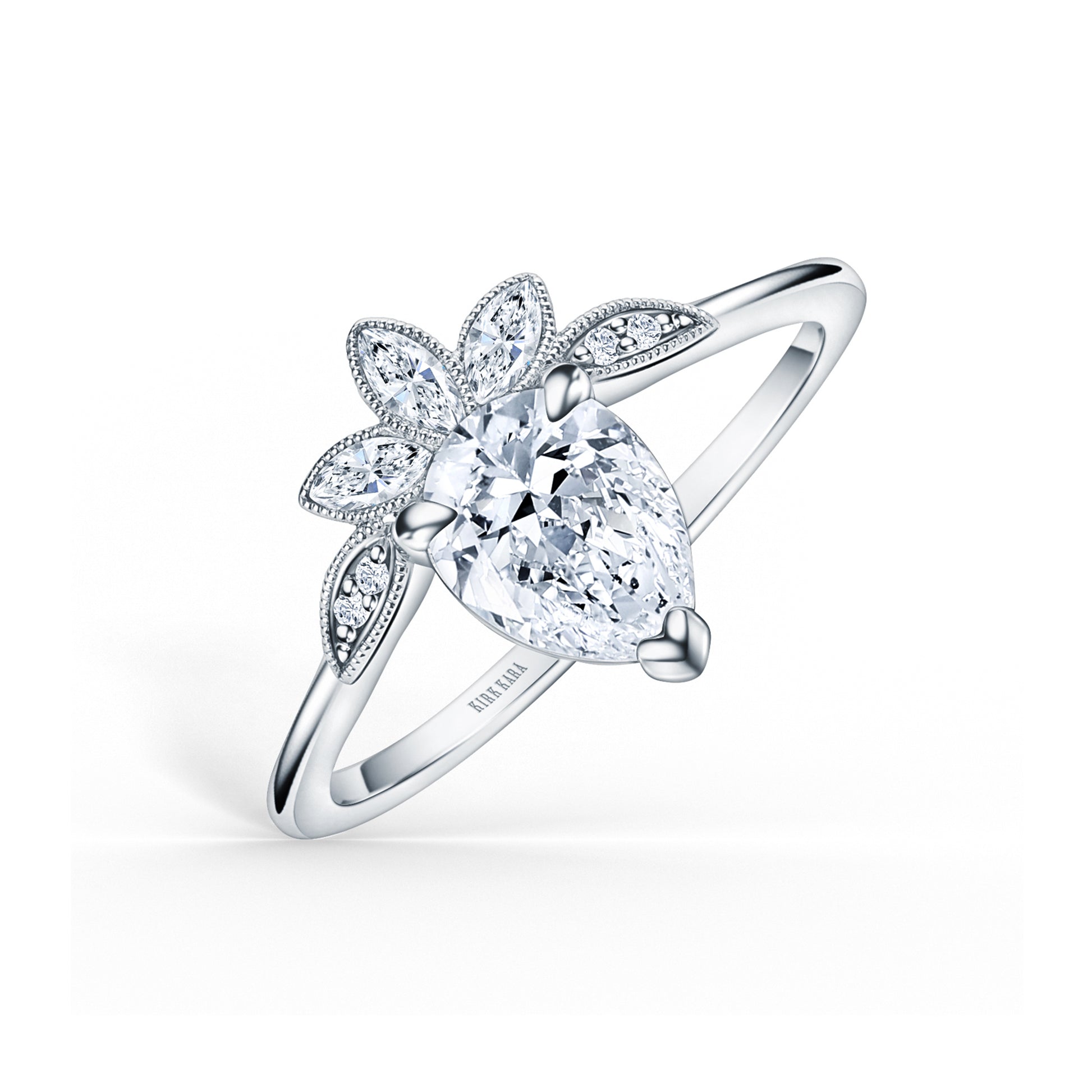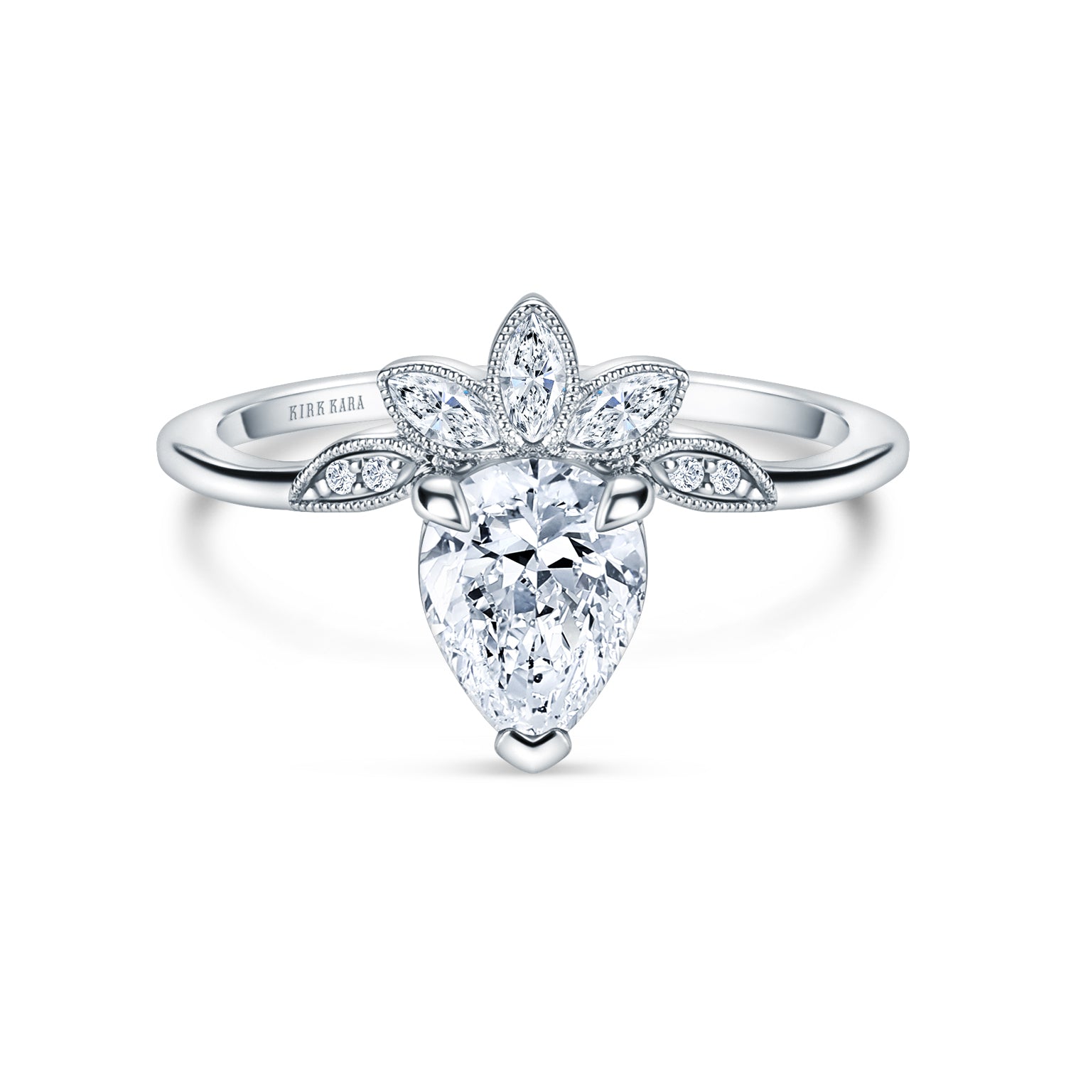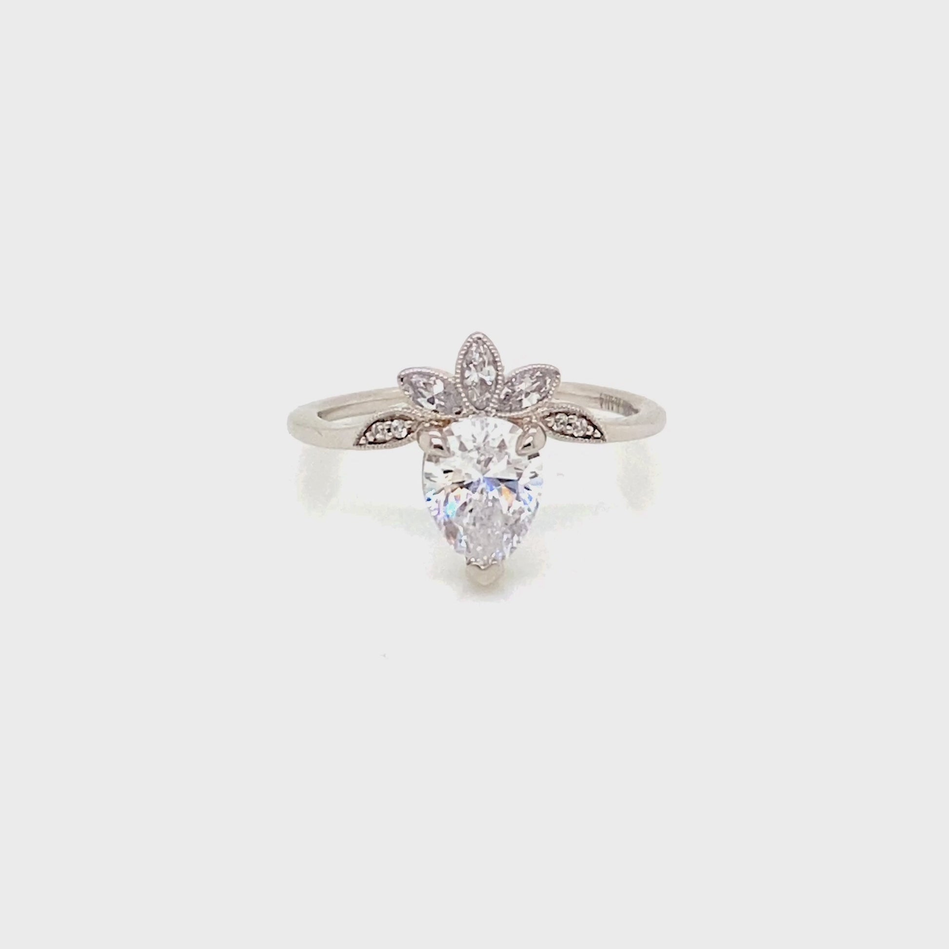 This nature-inspired design with leaf motif details is from the Dahlia collection. It features 1/8 ctw of diamonds. Both lab grown and natural diamonds are available for this setting. The signature handcrafted details is shown with a 1.00 carat "floating" pear cut stone. All center stone sizes and shapes are possible.