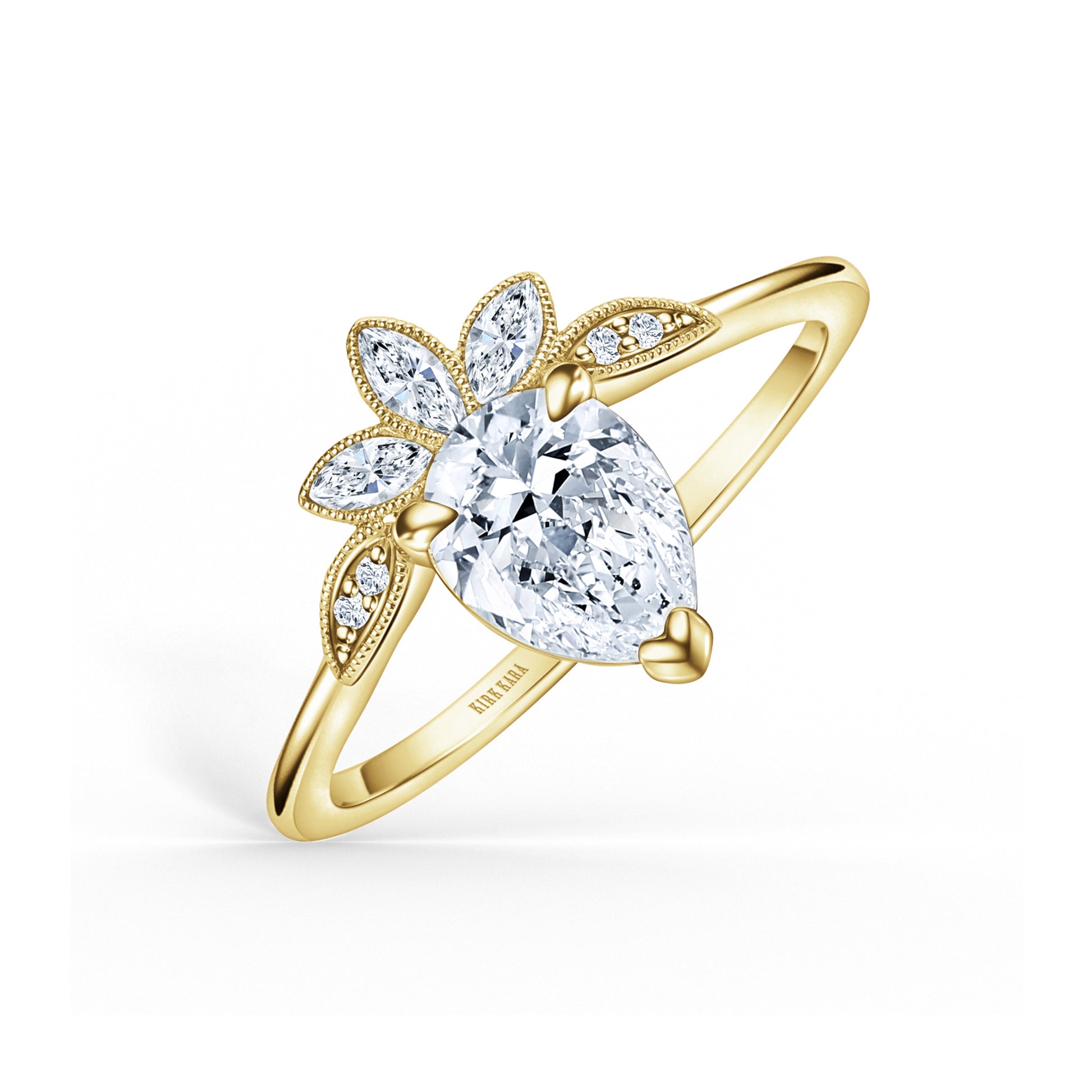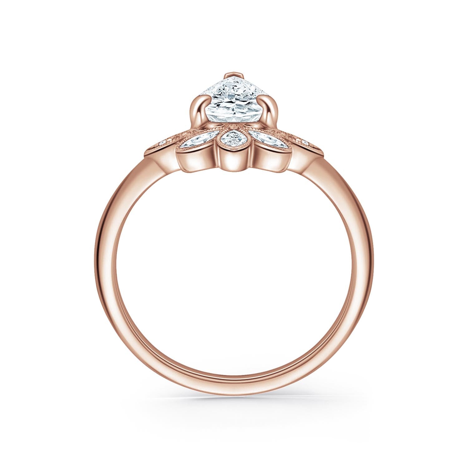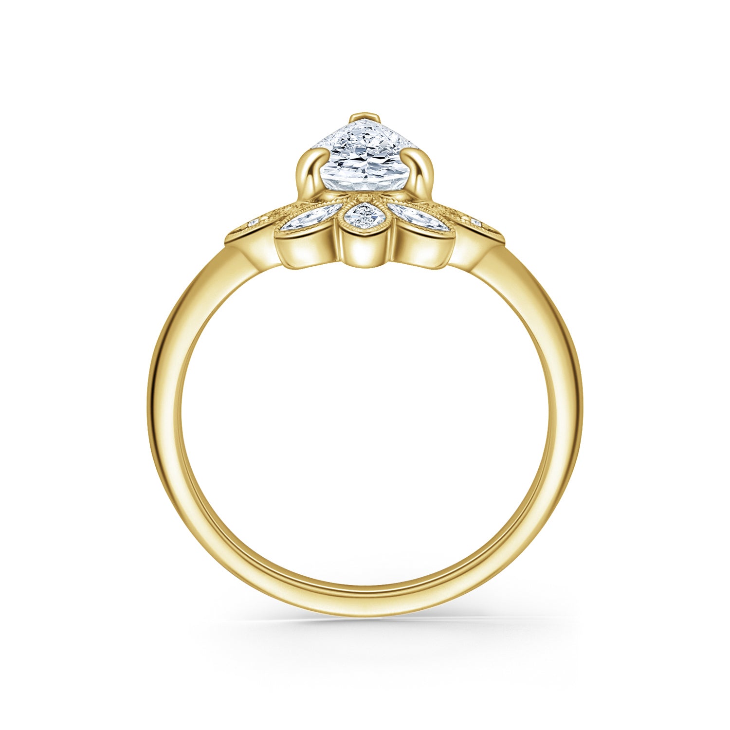 This nature-inspired design with leaf motif details is from the Dahlia collection. It features 1/8 ctw of diamonds. Both lab grown and natural diamonds are available for this setting. The signature handcrafted details is shown with a 1.00 carat "floating" pear cut stone. All center stone sizes and shapes are possible.