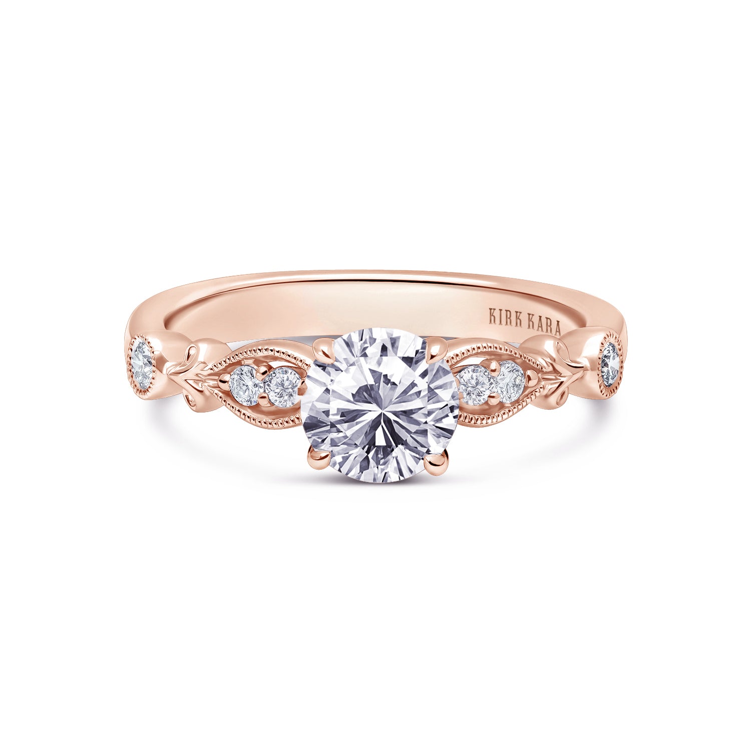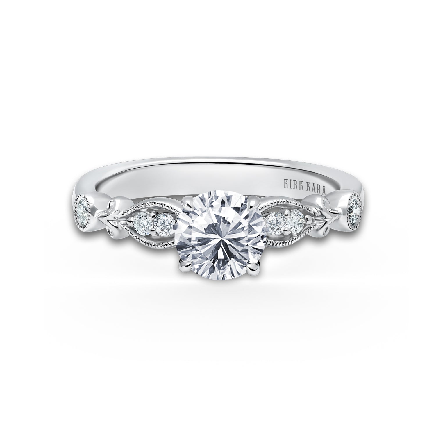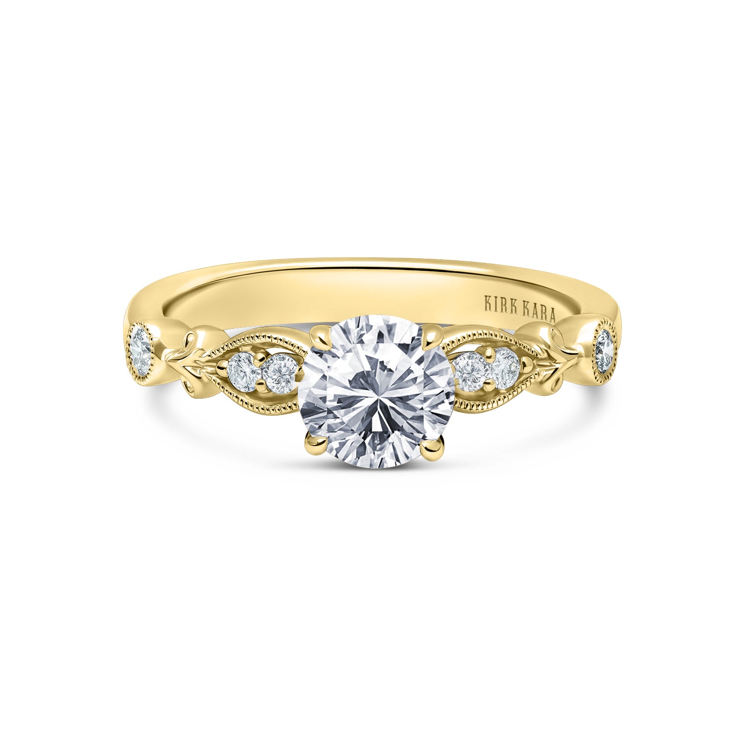 This nature-inspired design with floral details is from the Dahlia and most prized creations collection. It features 1/8 ctw of diamonds. The signature handcrafted details include milgrain edging. Both lab grown and natural diamonds are available for this setting. Ring as shown fits a 1.00 carat round cut stone. All center stone sizes and shapes are possible.