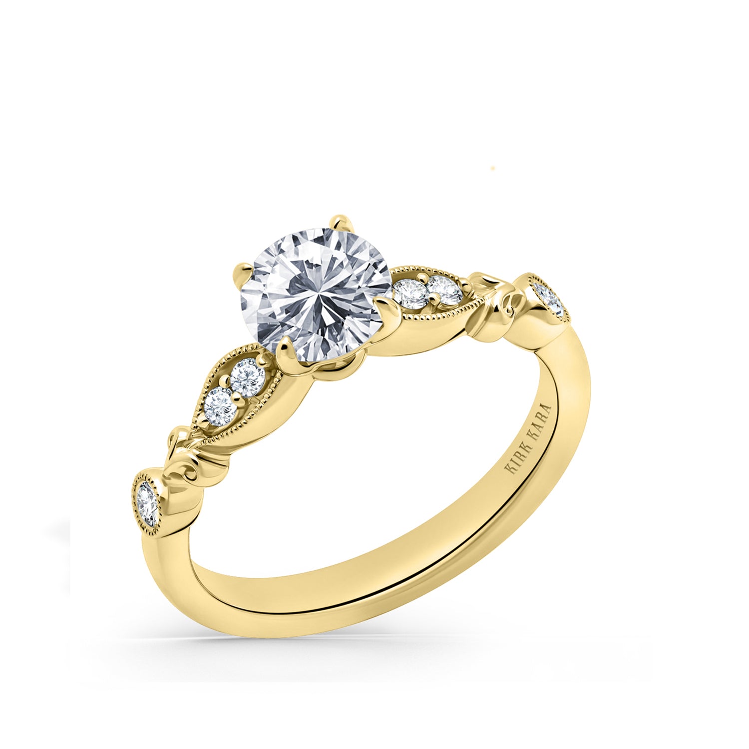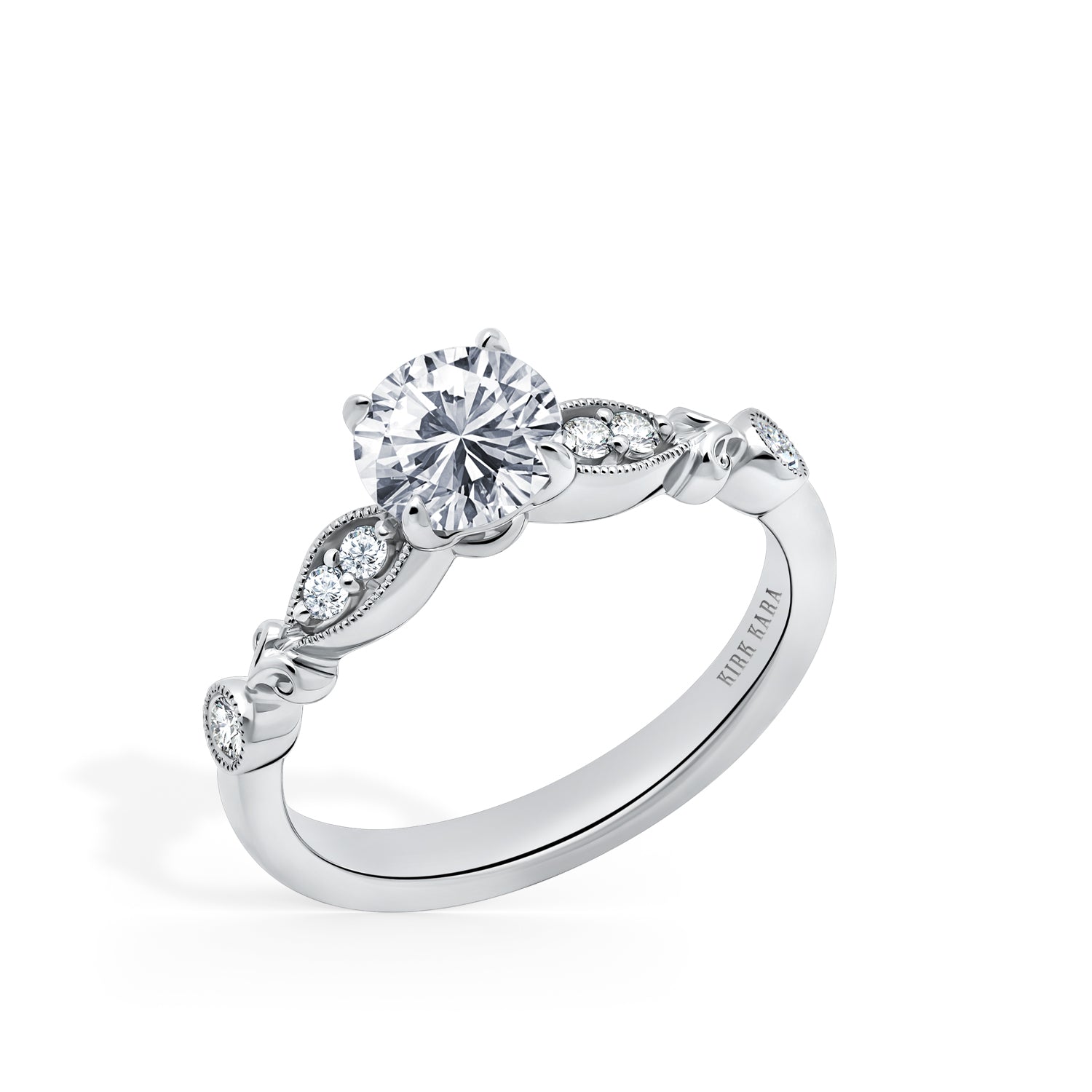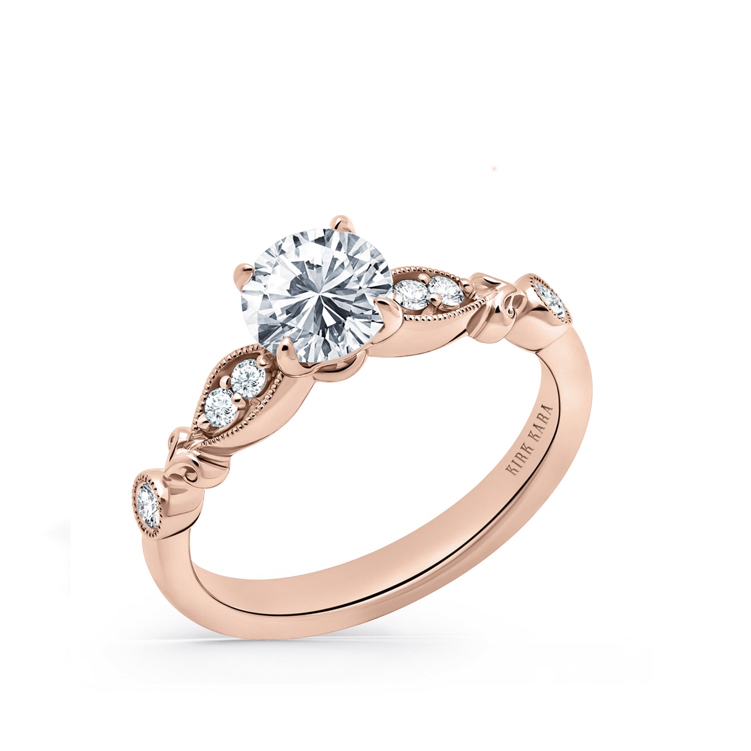 This nature-inspired design with floral details is from the Dahlia and most prized creations collection. It features 1/8 ctw of diamonds. The signature handcrafted details include milgrain edging. Both lab grown and natural diamonds are available for this setting. Ring as shown fits a 1.00 carat round cut stone. All center stone sizes and shapes are possible.