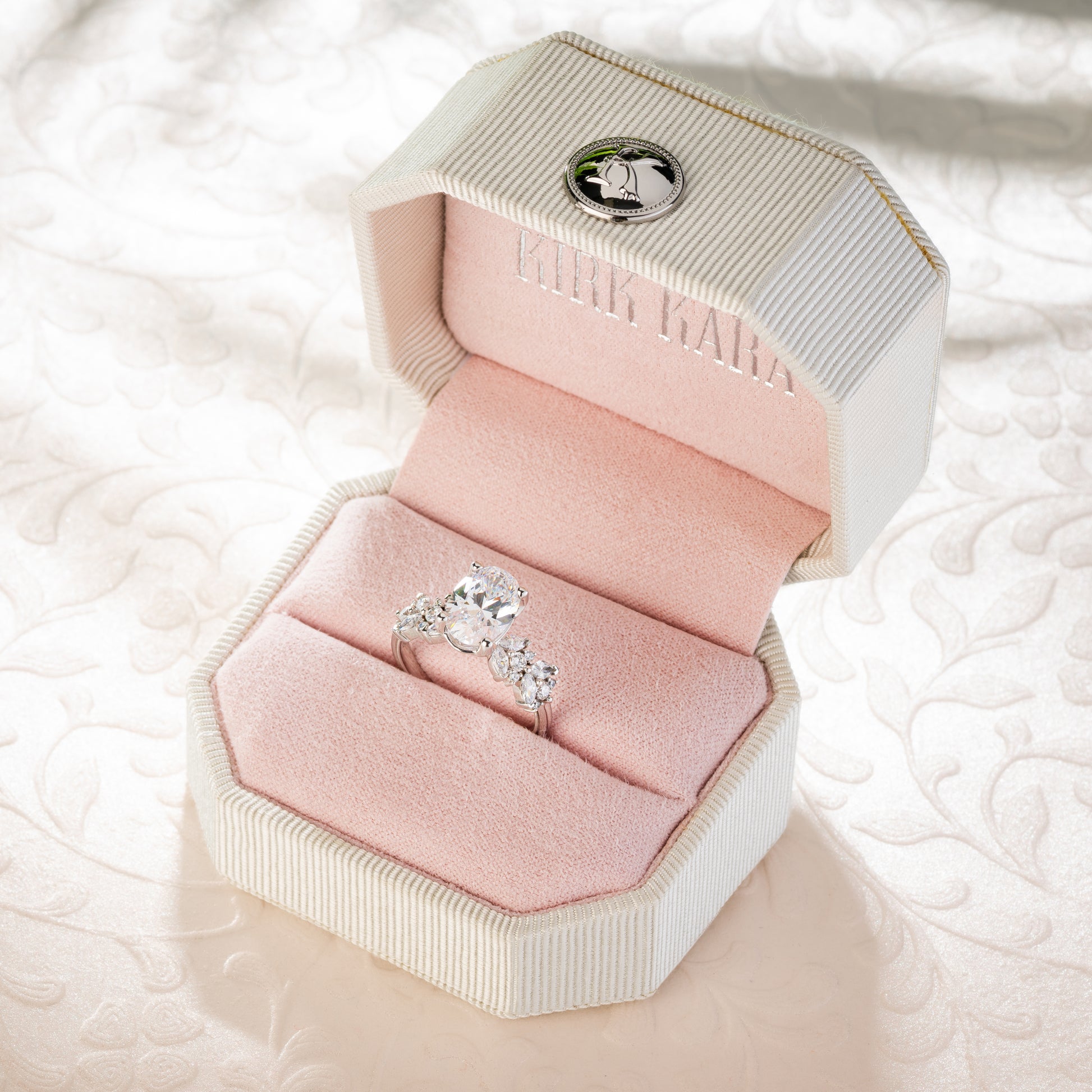 This nature-inspired design with floral details is from the Dahlia collection. It features 5/8 ctw of diamonds. Both lab grown and natural diamonds are available for this setting. Ring as shown fits a 2.00 carat oval cut stone. All center stone sizes and shapes are possible.